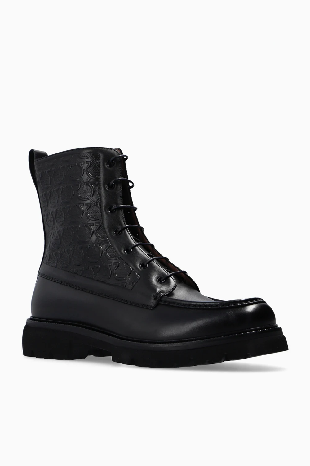 Czarne, skórzane, sznurowane buty za kostkę, model ‘Naval 2’ Salvatore Ferragamo. Ozdobione wytłoczonym logo. Czarna, gumowa podeszwa.