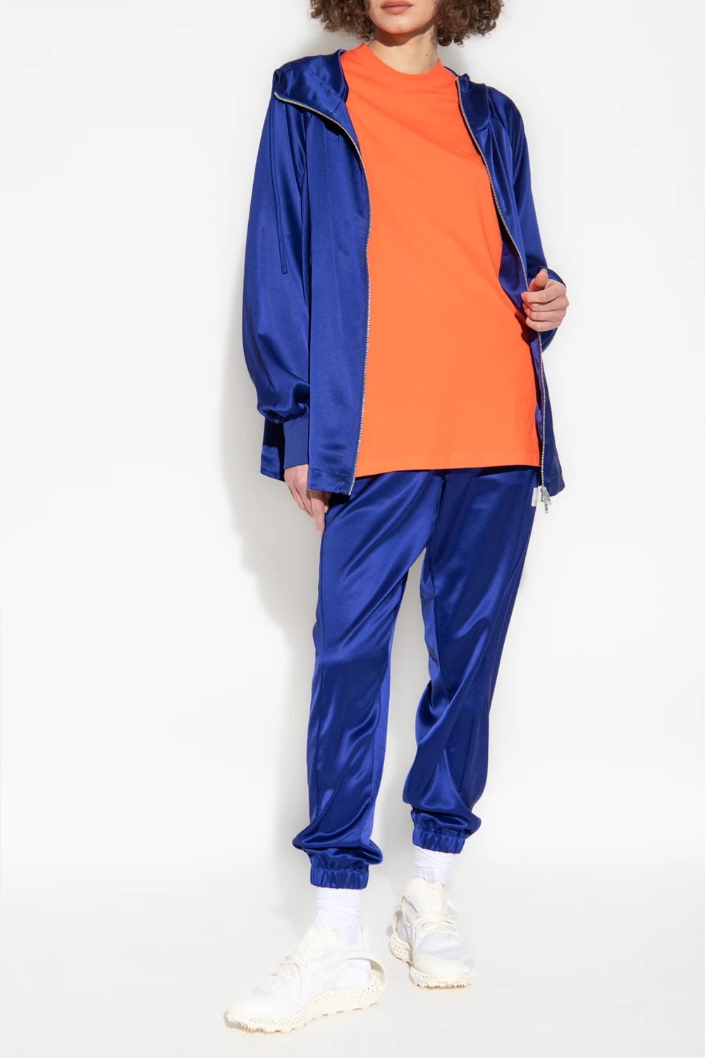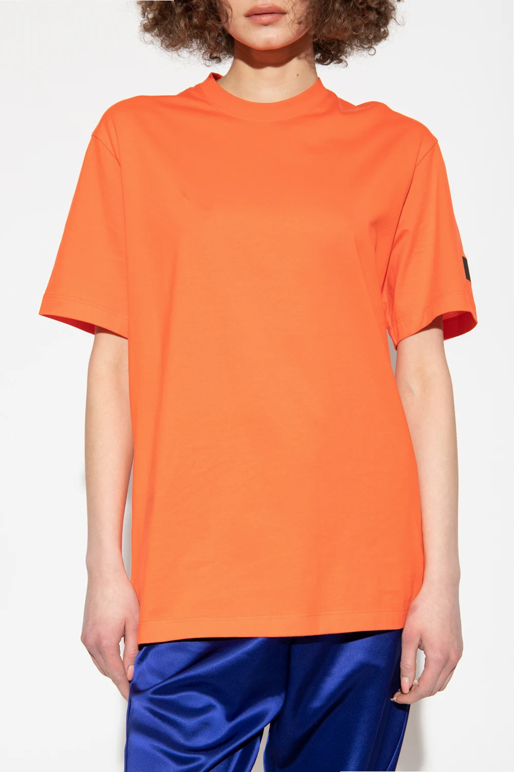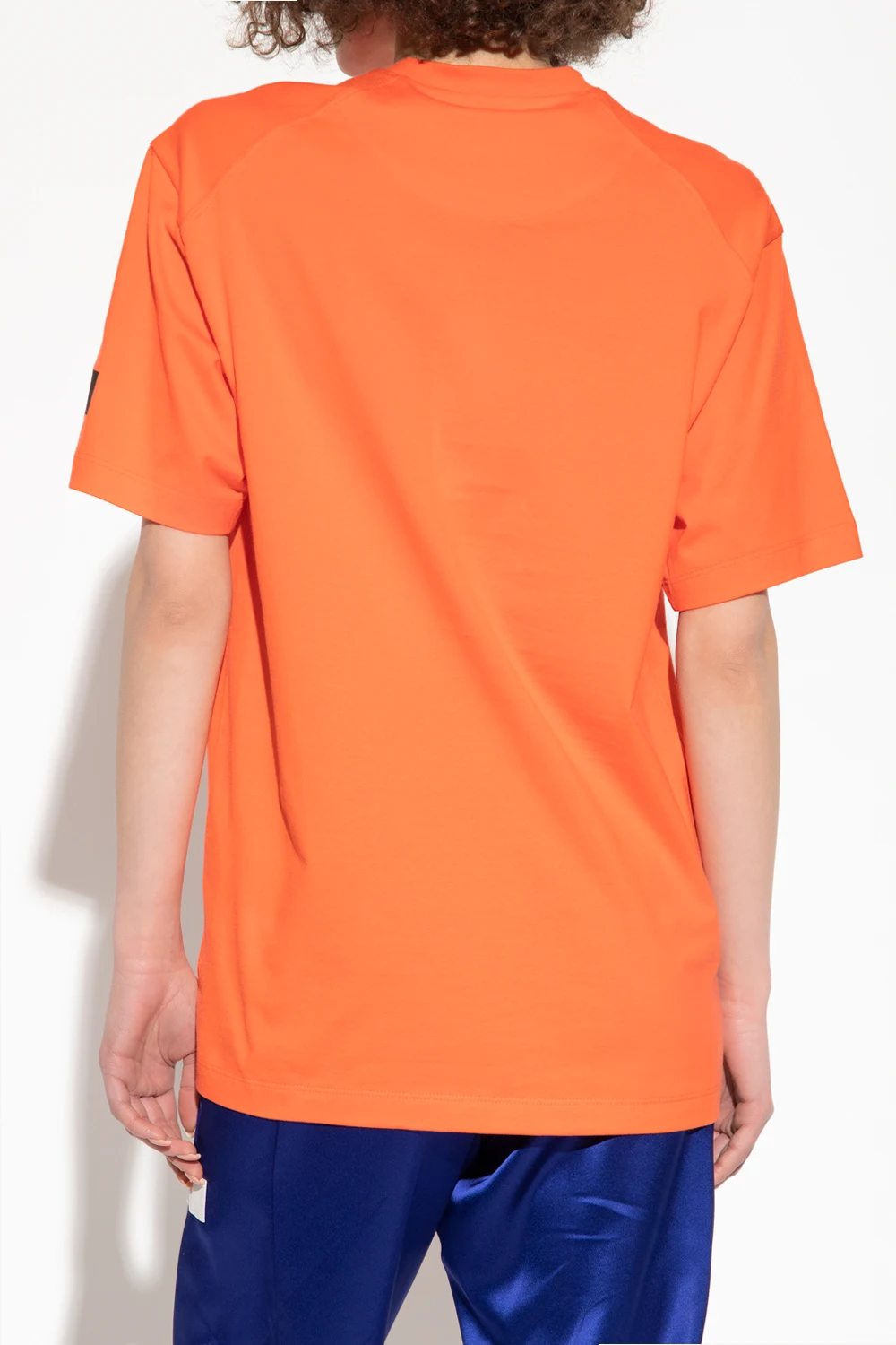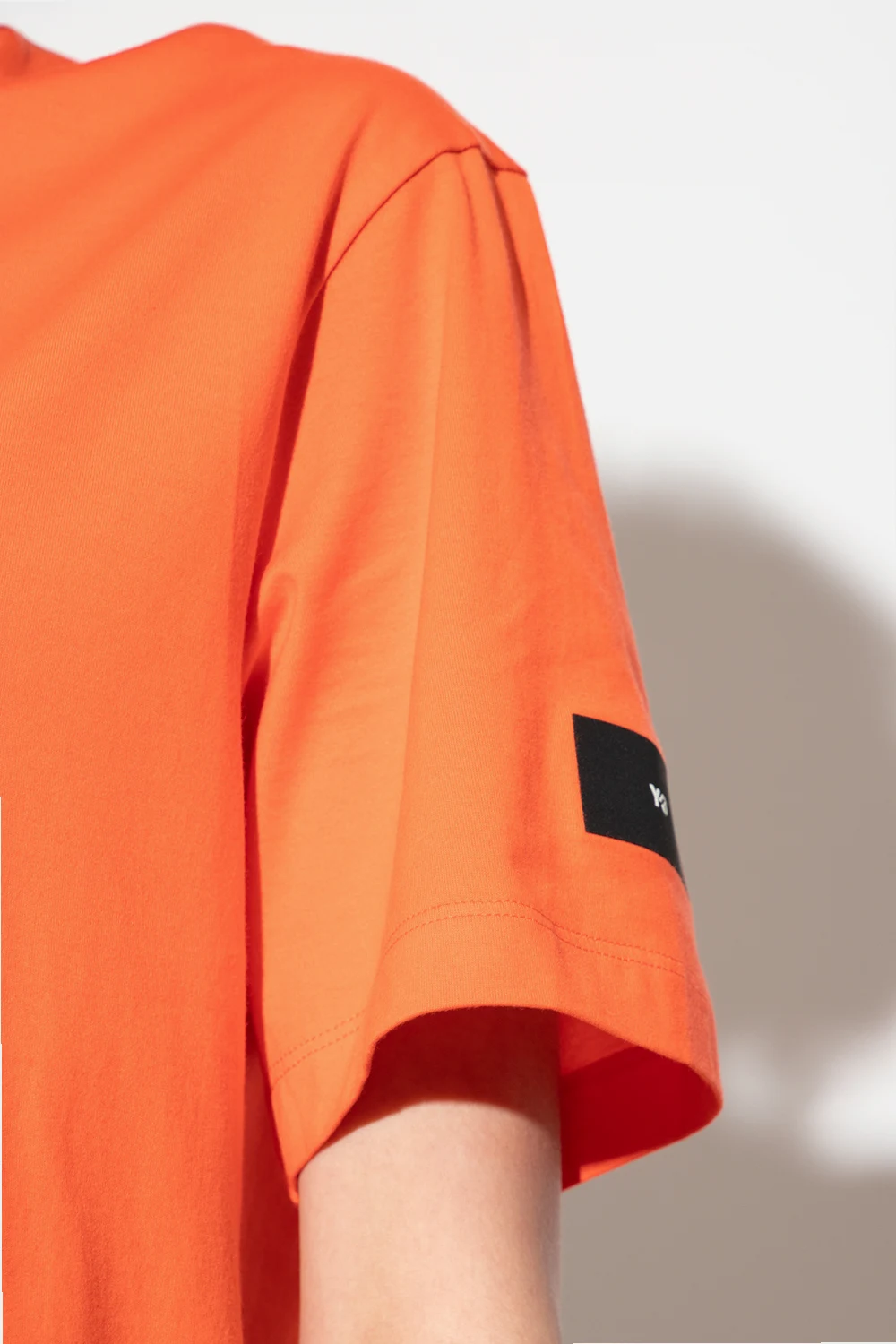 Pomarańczowy, bawełniany t-shirt Y-3 Yohji Yamamoto. Okrągły dekolt. Krótkie rękawy - na jednym naszywka z logo.