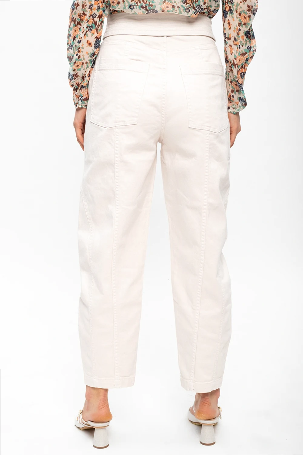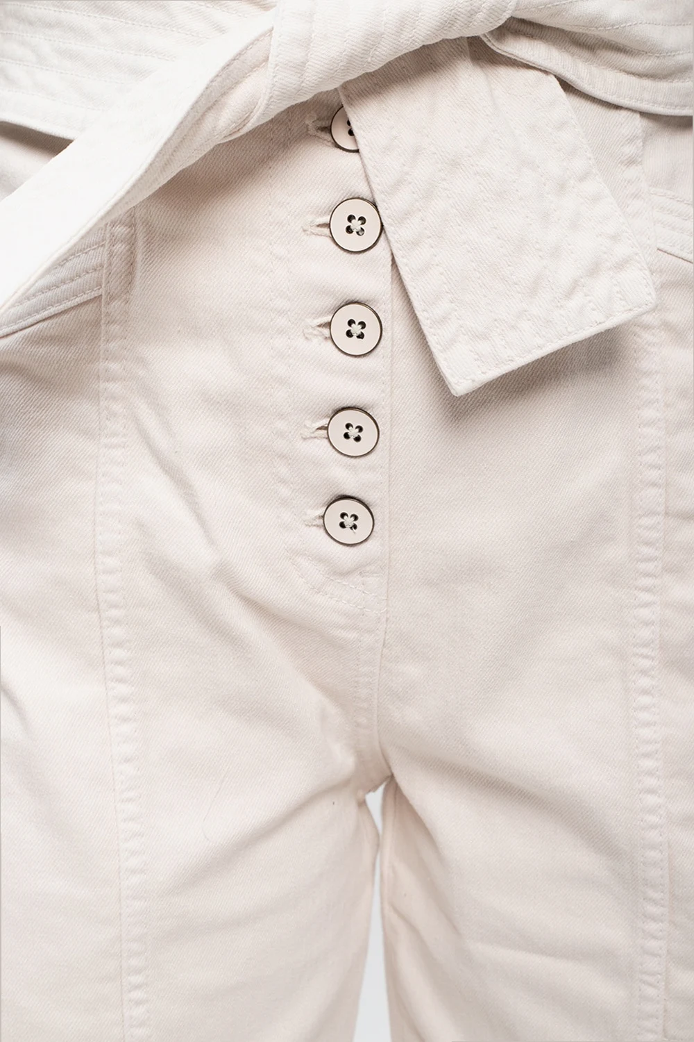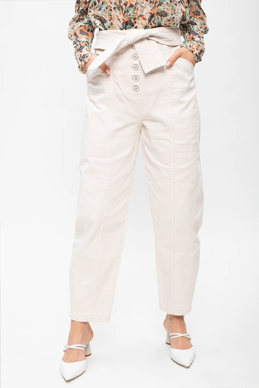 Białe, sztruksowe spodnie, model ‘Otto’ Ulla Johnson. Wykonane z bawełny. Zapinane na guziki oraz wiązane w talii. Cztery wsuwane kieszenie: dwie z przodu oraz dwie z tyłu. Zwężane nogawki.