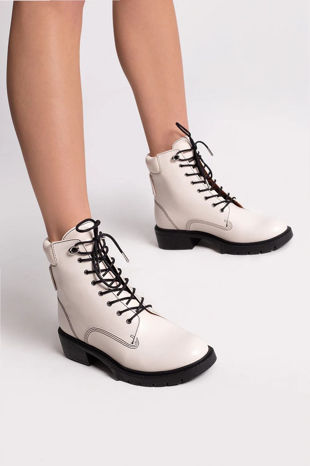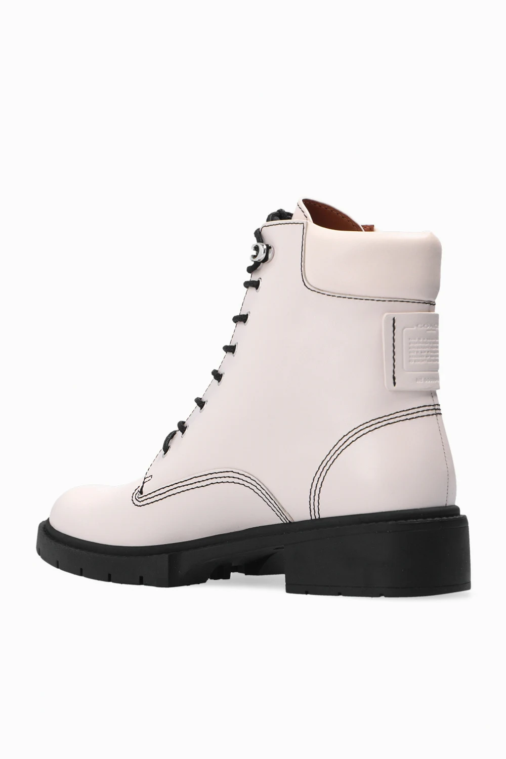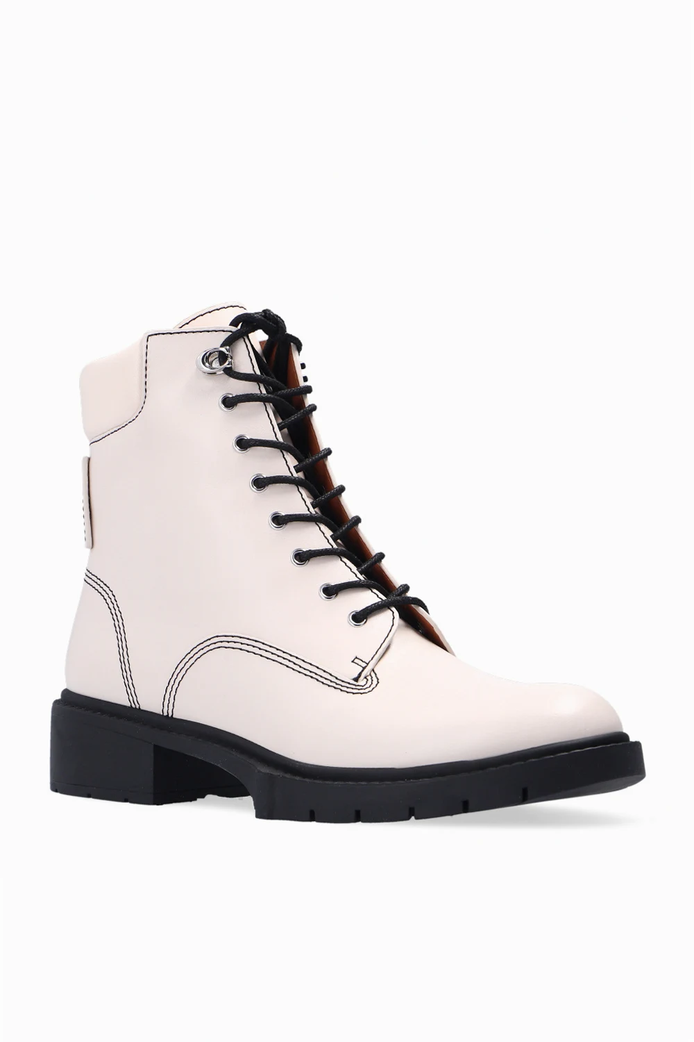 Kremowe, sznurowane botki za kostkę, model ‘Lorimer’ Coach. Wykonane ze skóry. Ozdobione wzorem z wytłoczonym logo. Czarna, gumowa podeszwa.