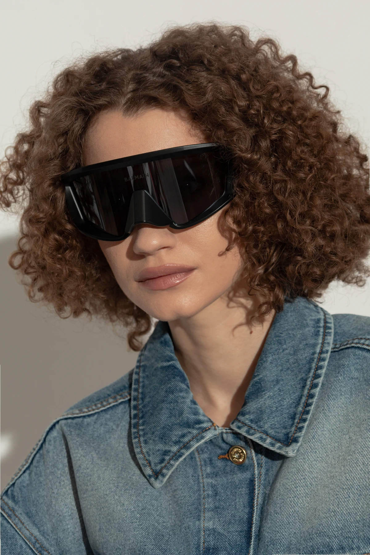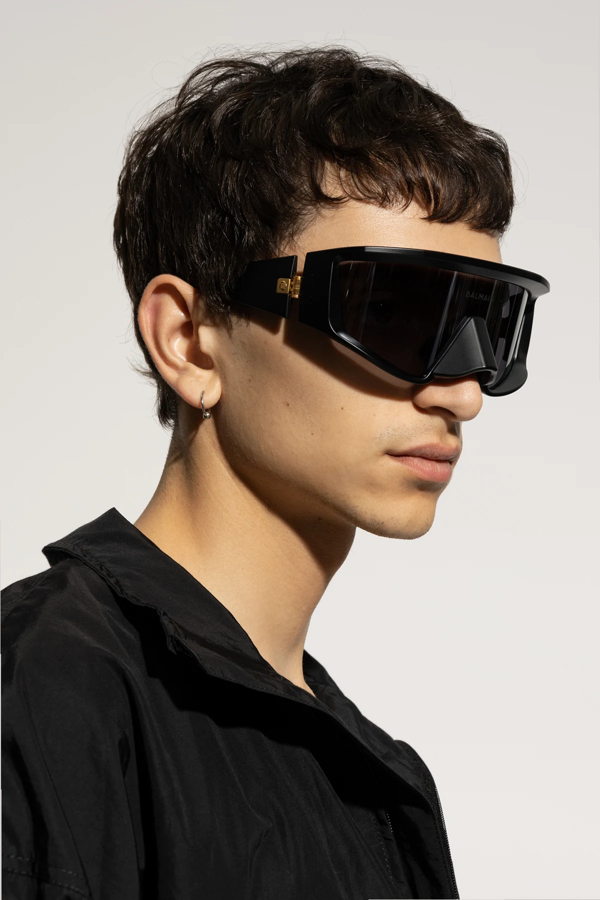 Charakteryzujące się jednoczęściowymi, dużymi soczewkami w kolorze głębokiej czerni, okulary te doskonale chronią przed promieniowaniem UV i UVB, jednocześnie nadając twarzy futurystycznego, tajemniczego wyrazu. Czarne oprawki zdobi wyrazisty napis marki, co podkreśla ich prestiżowe pochodzenie. Dodatkowo, złote detale na zausznikach oraz eleganckie etui z kontrastującym złotym zamknięciem tworzą spójny zestaw, który wzbogaci każdą stylizację o nutę ekskluzywności.