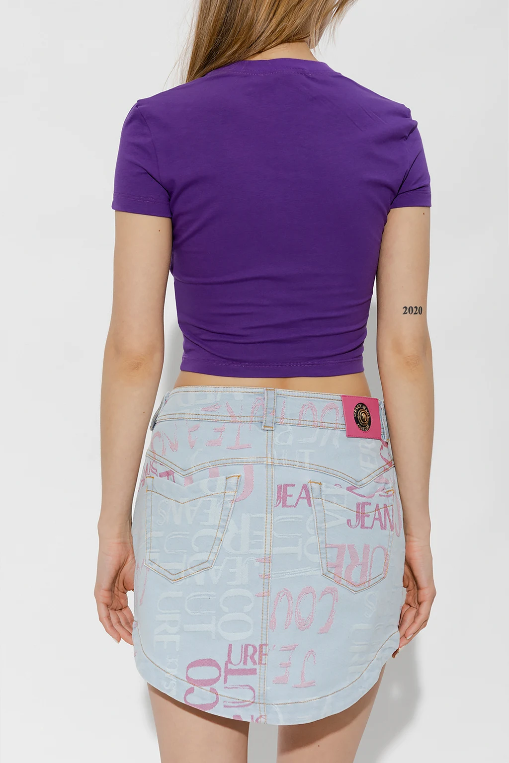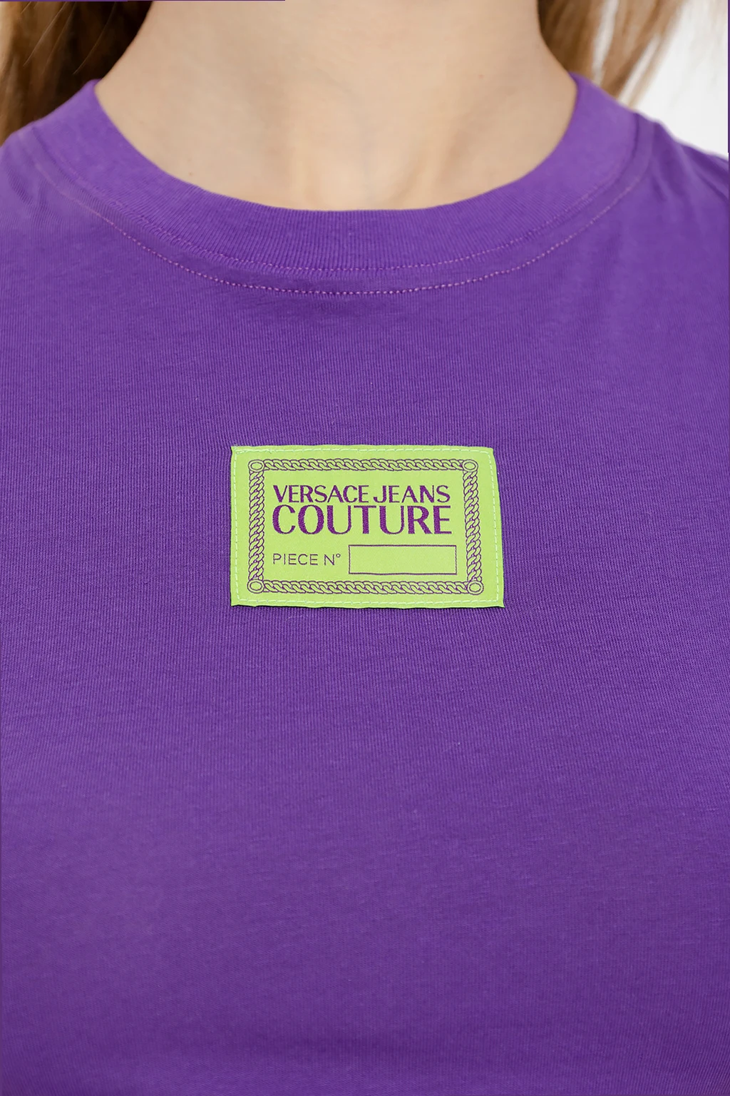 Fioletowy, krótki t-shirt Versace Jeans Couture. Wykonany z bawełny. Z przodu ozdobiony zieloną naszywką z logo. Okrągły dekolt wykończony ściągaczem. Krótkie rękawy.