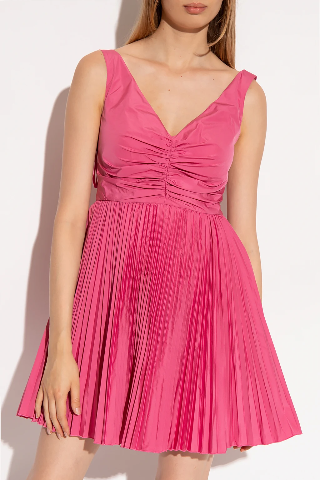 Różowa, krótka sukienka bez rękawów Red Valentino. Wykonana z połyskującej tafty. Zapinana z boku na kryty zamek oraz haftkę. Odcinana pod biustem, z dekoracyjnym marszczeniem z przodu. Rozszerzany, plisowany dół.
