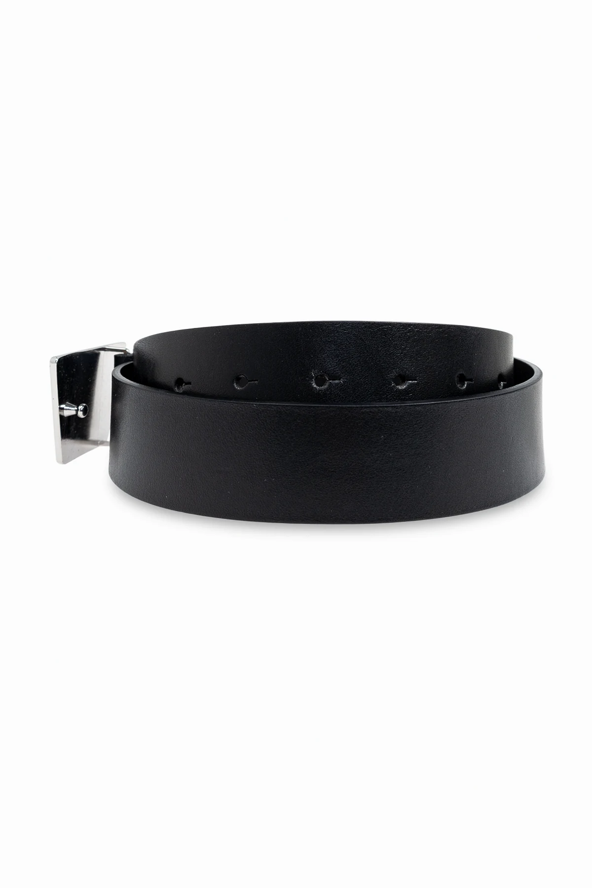 Centralnym punktem paska jest duże, trapezowe zapięcie , wykonane z metalu o srebrnym wykończeniu. Kontrastuje ono z czernią skóry, dodając tym samym szczyptę luksusu do każdej stylizacji. Zapięcie ozdobione jest wyraźnie widocznym logo projektanta, które podkreśla ekskluzywny charakter produktu.