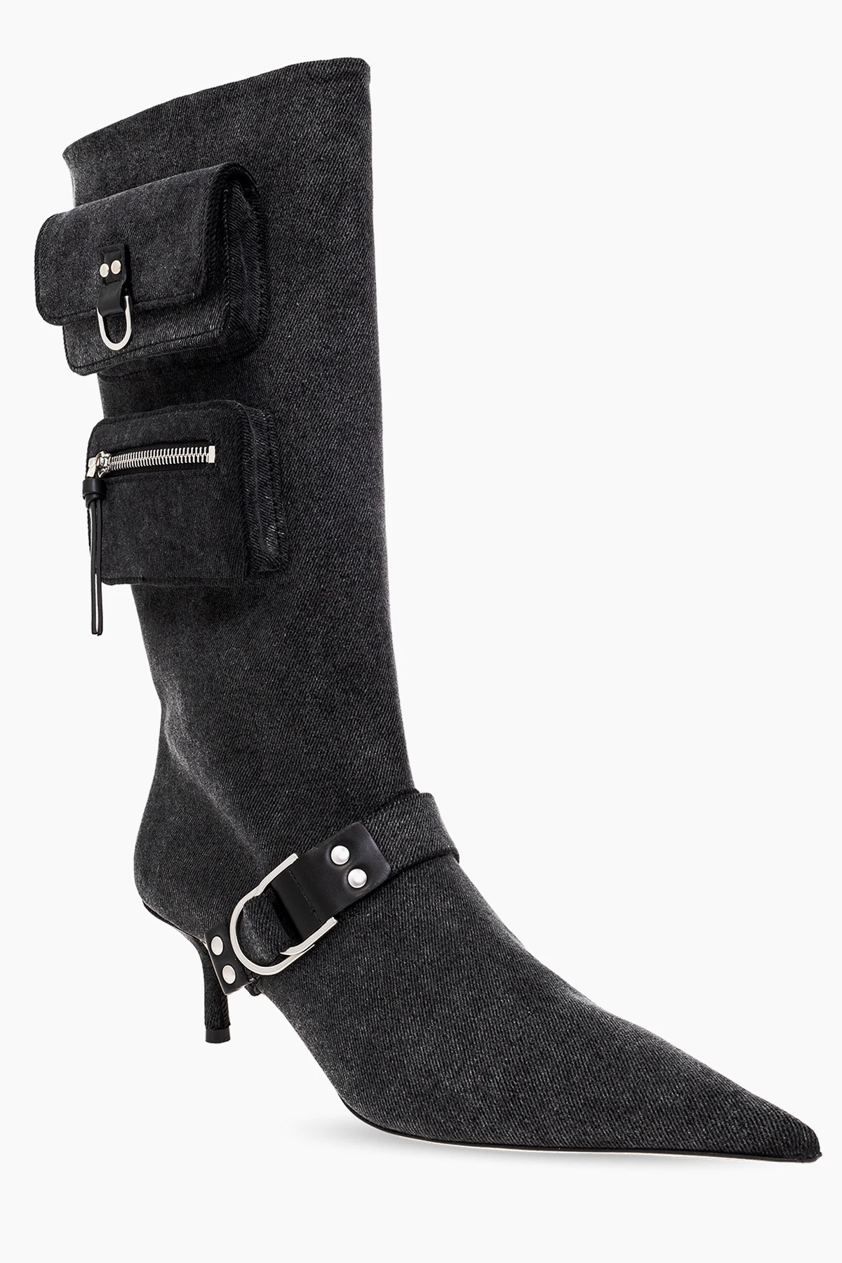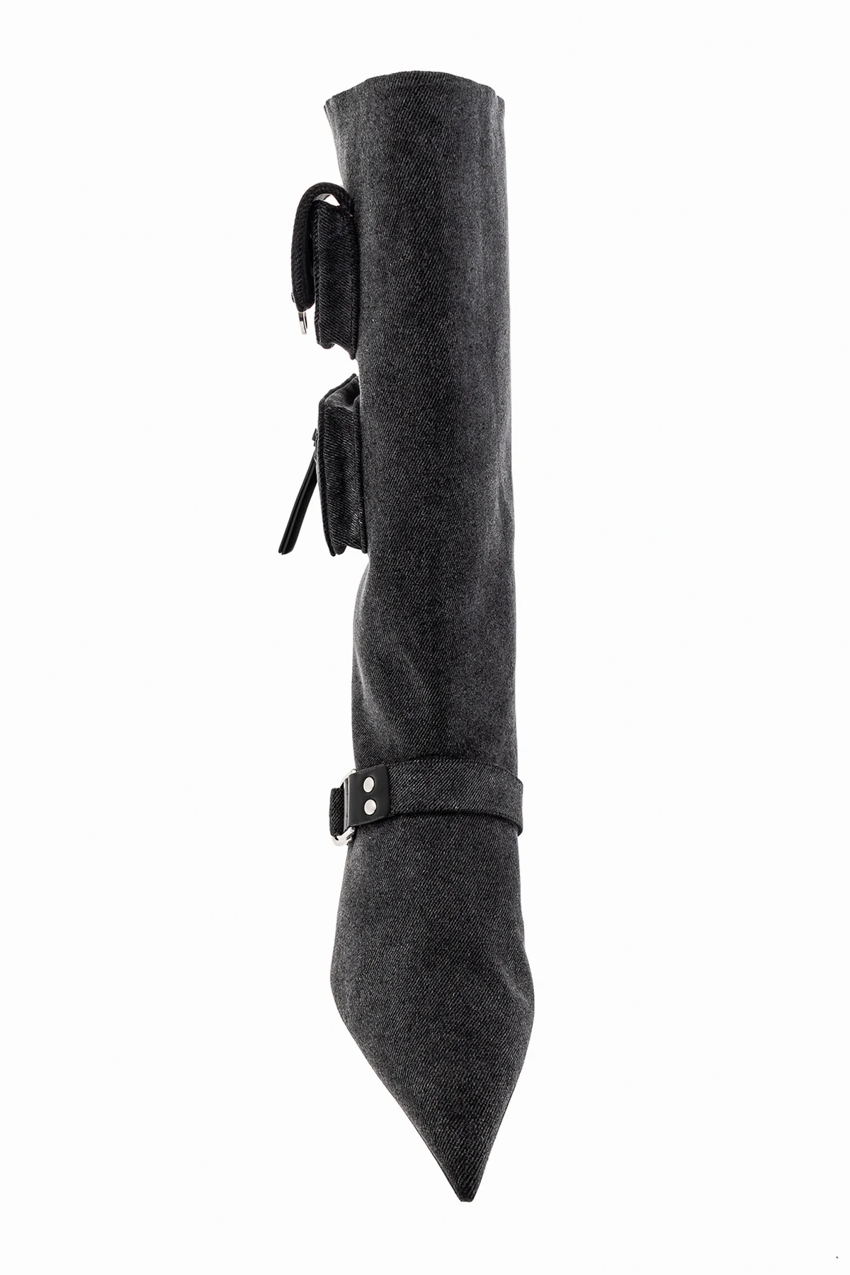 Ciemnoszare, wsuwane kozaki na obcasie, model ‘Jeannie’ Blumarine. Ozdobione paskiem z klamrą oraz kieszeniami z boku cholewki. Nosek w szpic. Beżowa, skórzana podeszwa.