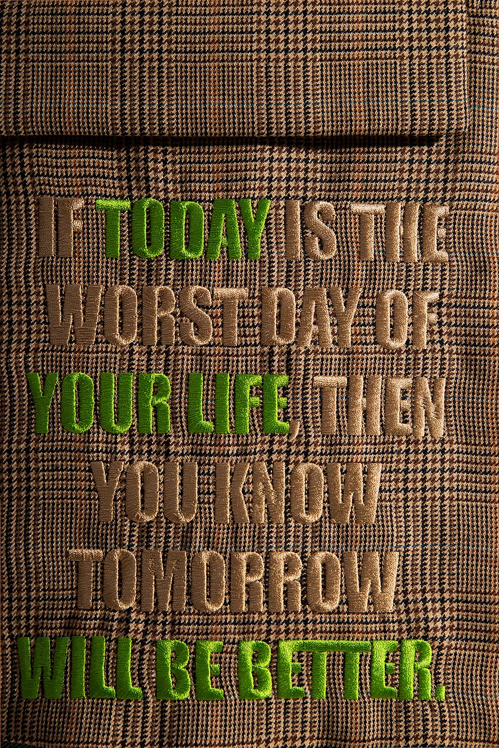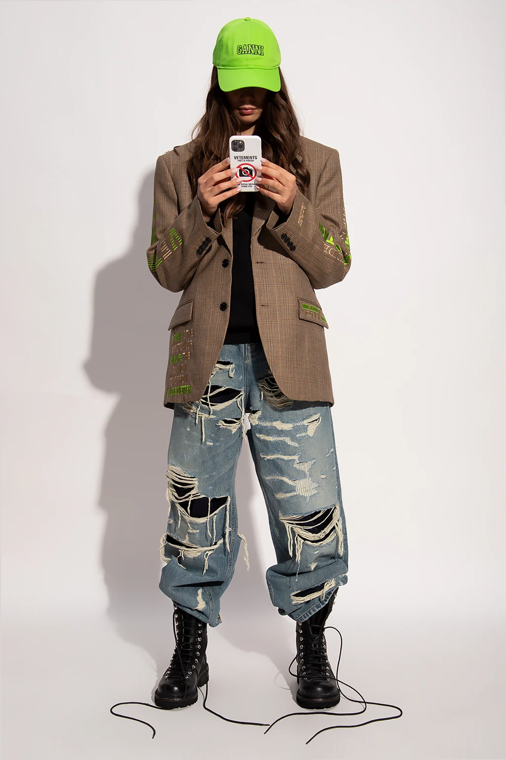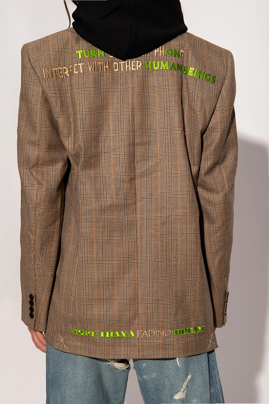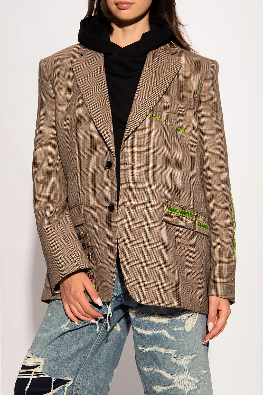 Beżowo-brązowo-czarna marynarka w kratę VETEMENTS. Wykonana z wełny. Zapinana na guziki. Ozdobiona wyszytym wzorem w kolorze zielono-beżowym. Dwie kieszenie z patką oraz wsuwana. Z tyłu dwa pojedyncze rozcięcia. Długie rękawy zakończone zapięciem na guziki.