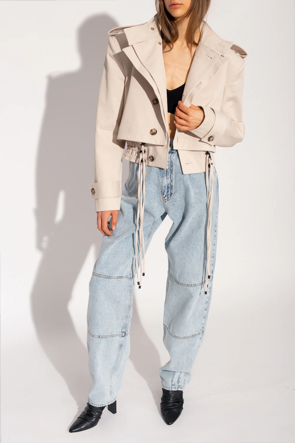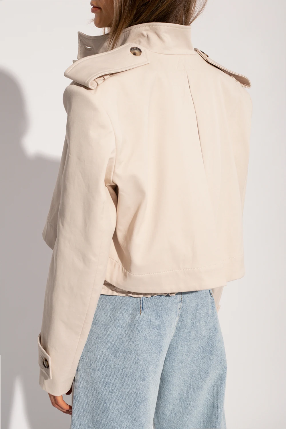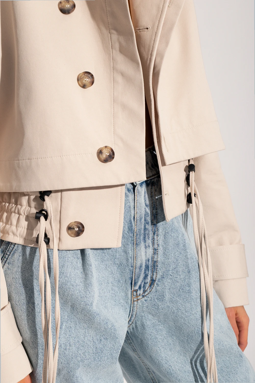 Kremowa, bawełniana dwuwarstwowa kurtka, model ‘Akaba’ The Mannei. Zapinana na guziki. Na ramionach pagony. Długie rękawy zapinane na pas z guzikiem. Dół wykończony marszczonym ściągaczem oraz ściągany potrójnymi trokami.