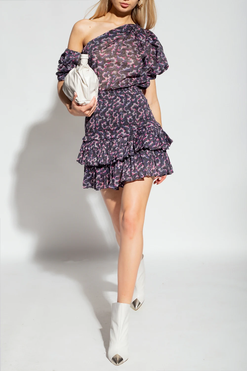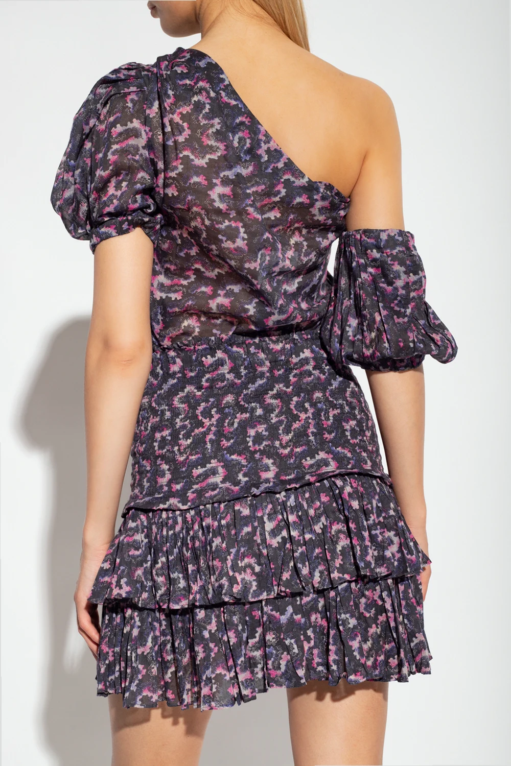 Czarny, asymetryczny top, model ‘Liddy’ Isabel Marant Etoile. Wykonany z bawełny organicznej. Zapinany z boku na kryty zamek. Ozdobiony kolorowym wzorem. Krótkie, bufiaste rękawy, w tym jeden odpinany.