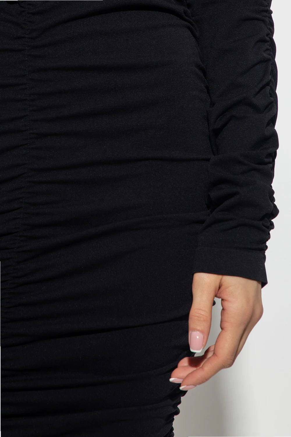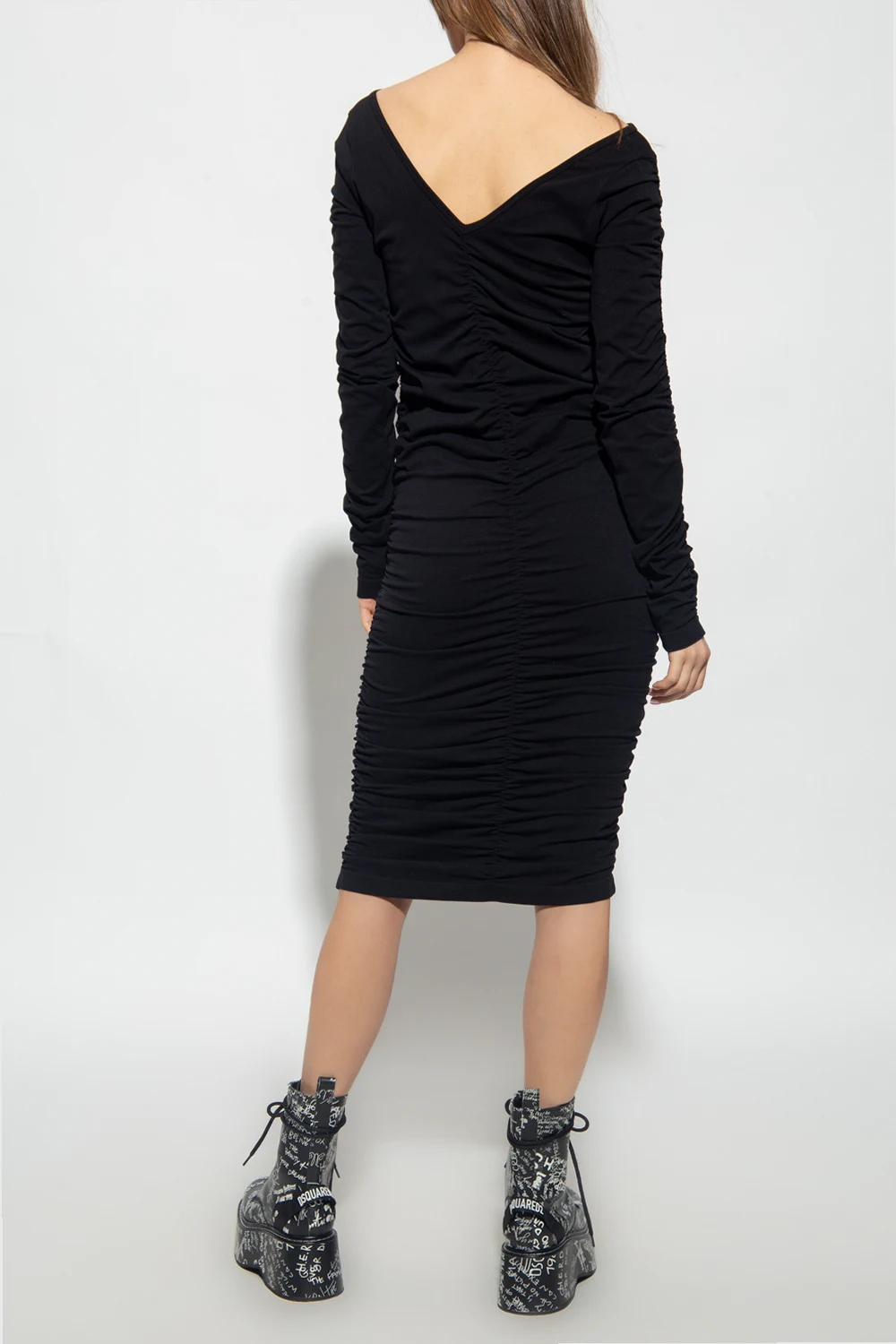 Czarna, dopasowana sukienka Helmut Lang. Dekoracyjne marszczenia. Dekolt w serek. Długie rękawy.