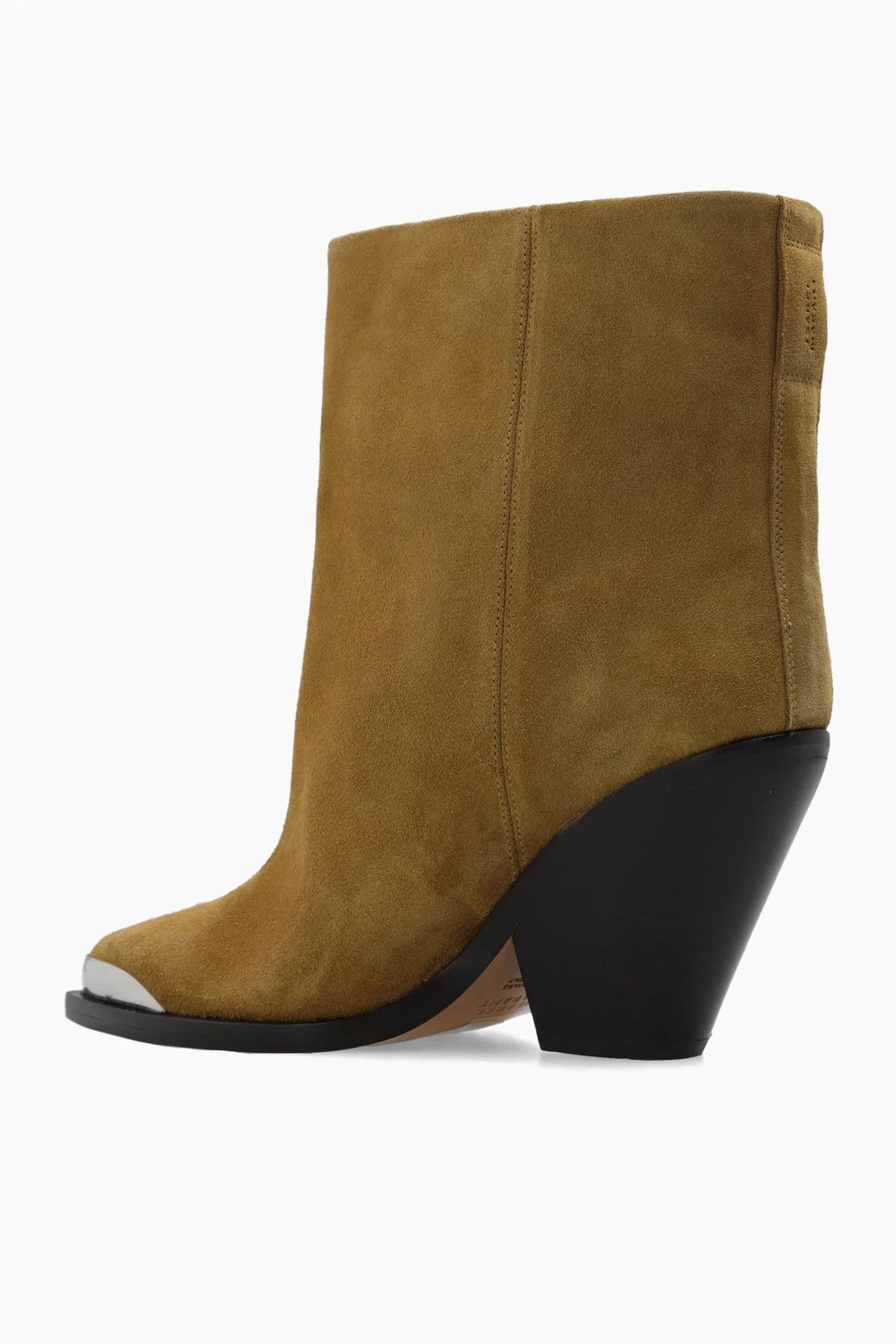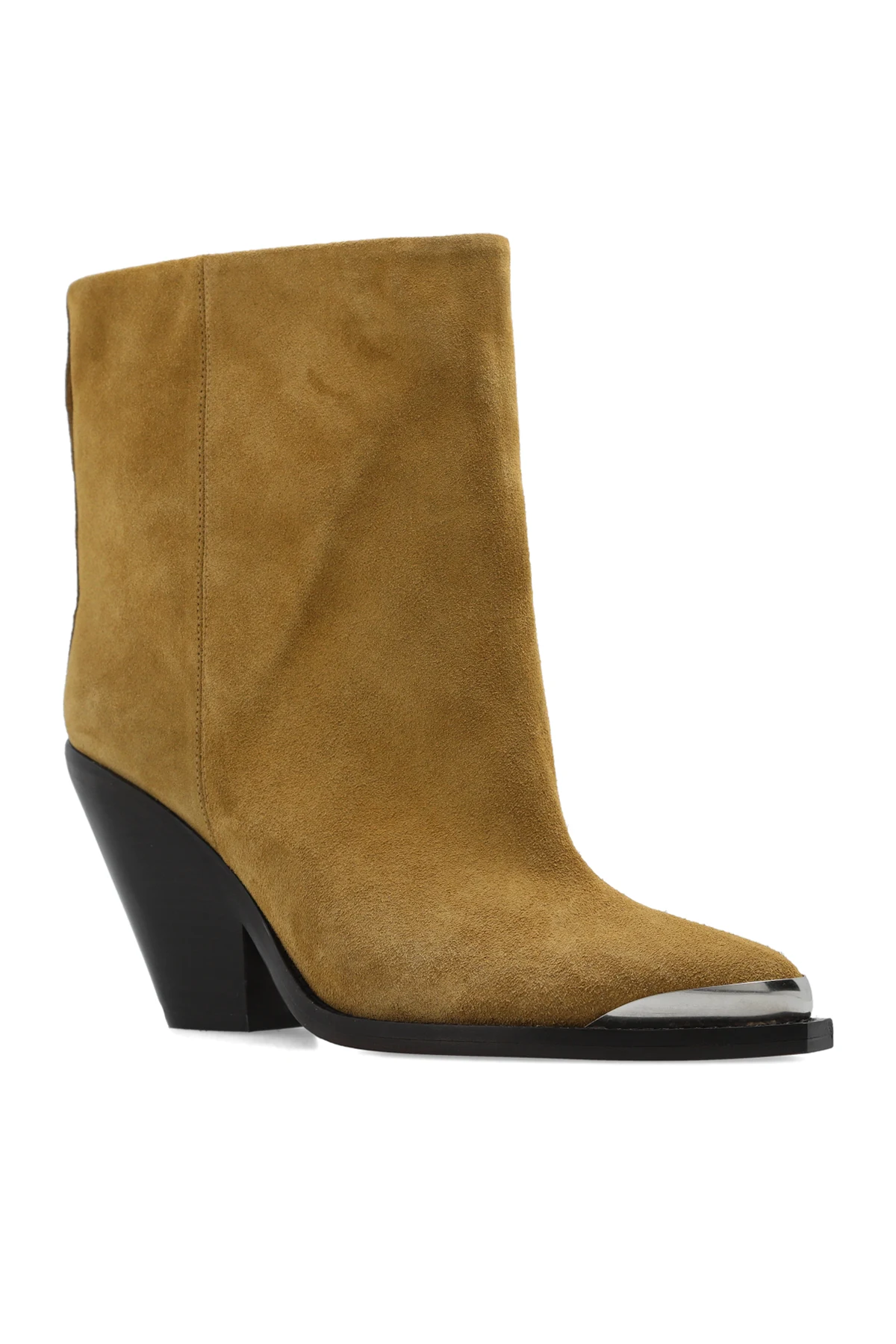 Beżowe, wsuwane botki na obcasie, model ‘Ladel’ Isabel Marant. Wykonane z zamszu cielęcego. Z tyłu ozdobione wytłoczonym logo. Nosek w szpic wykończony metalową aplikacją w kolorze srebrnym. Ciemnobrązowy obcas. Beżowa, skórzana podeszwa.