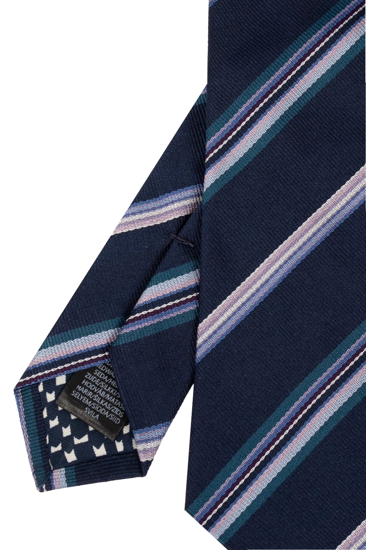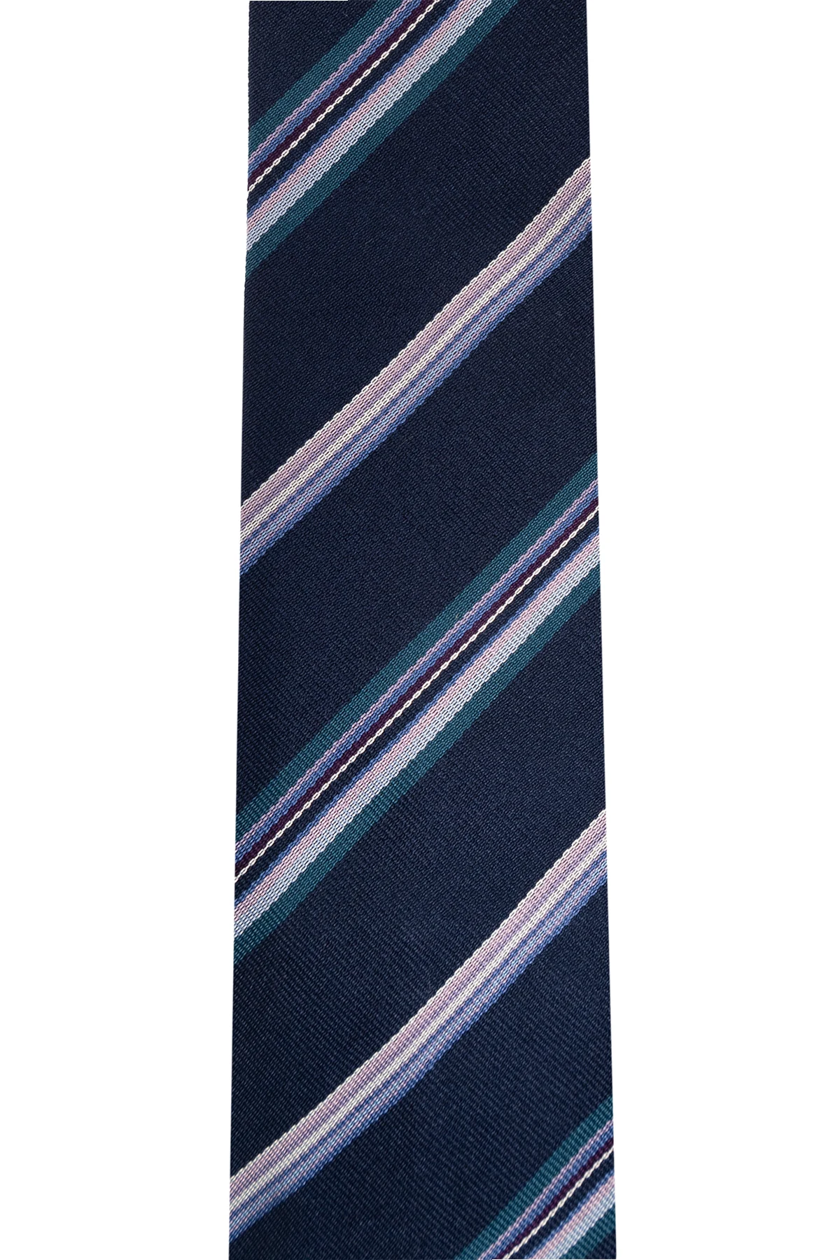 Granatowy, jedwabny krawat Paul Smith. Ozdobiony kolorowym wzorem w ukośne paski.