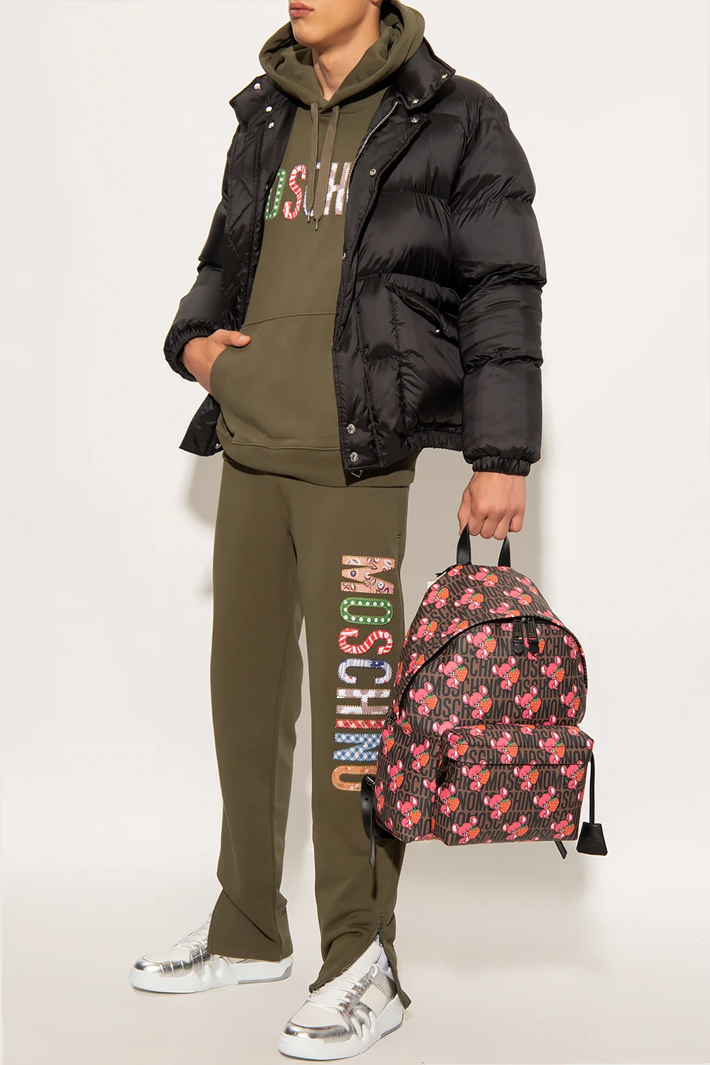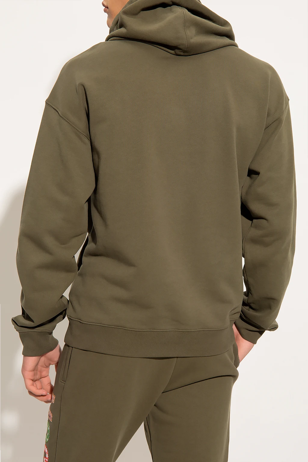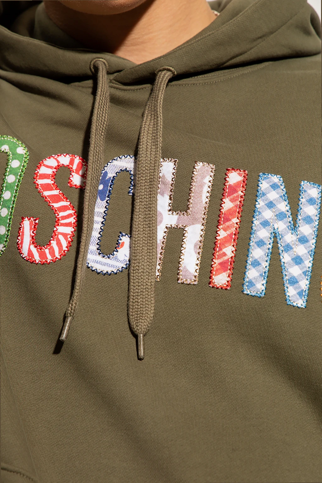 Ciemnozielona bluza Moschino. Wykonana z bawełny organicznej. Z przodu kolorowe, naszyte logo. Kaptur ściągany trokami, wsuwana kieszeń. Długie rękawy oraz dół wykończone ściągaczem.