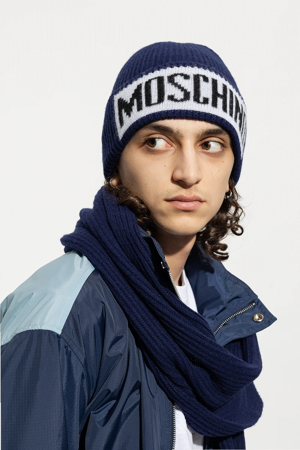 Granatowa czapka Moschino. Wykonana z mieszanki wełny i kaszmiru. Z przodu ozdobiona wyszytym logo w kolorze biało-czarnym.