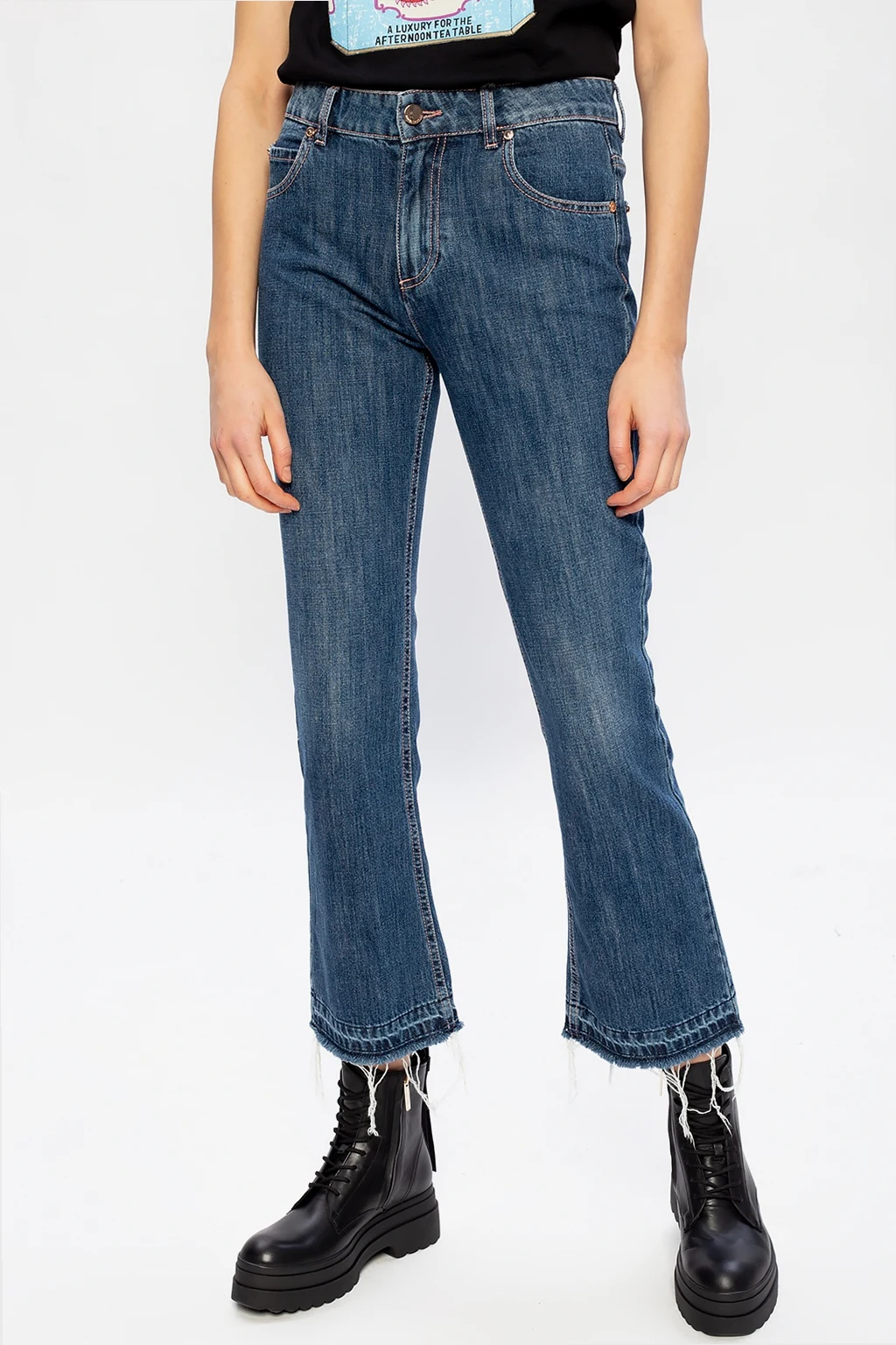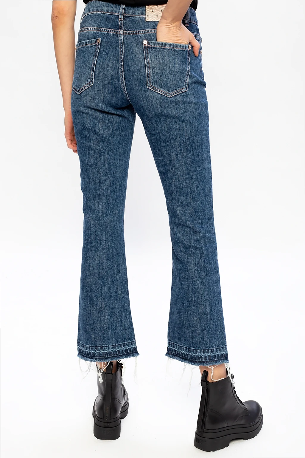 Niebieskie jeansy z rozszerzanymi nogawkami Red Valentino. Zapinane na zamek i guzik. Surowe wykończenie. Pięć kieszeni: trzy z przodu i dwie wsuwane z tyłu.