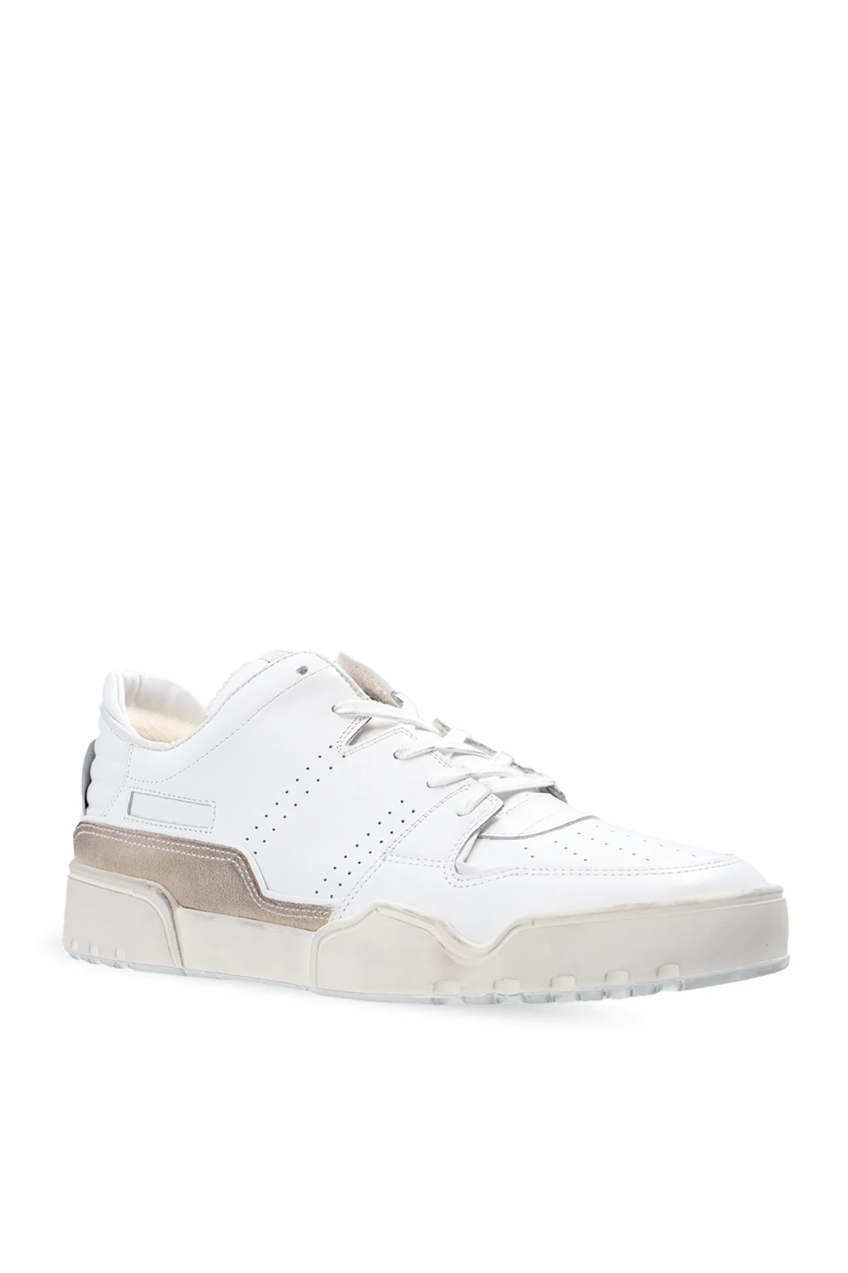 Biało-beżowe, sznurowane buty sportowe, model ‘Emreeh’ MARANT. Wykonane ze skóry i wykończone zamszem. Na języku naszywka. Z boku i tyłu wytłoczone logo oraz ozdobna perforacja. Kremowo-biała, gumowa podeszwa.