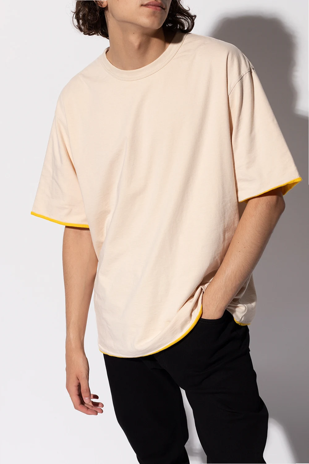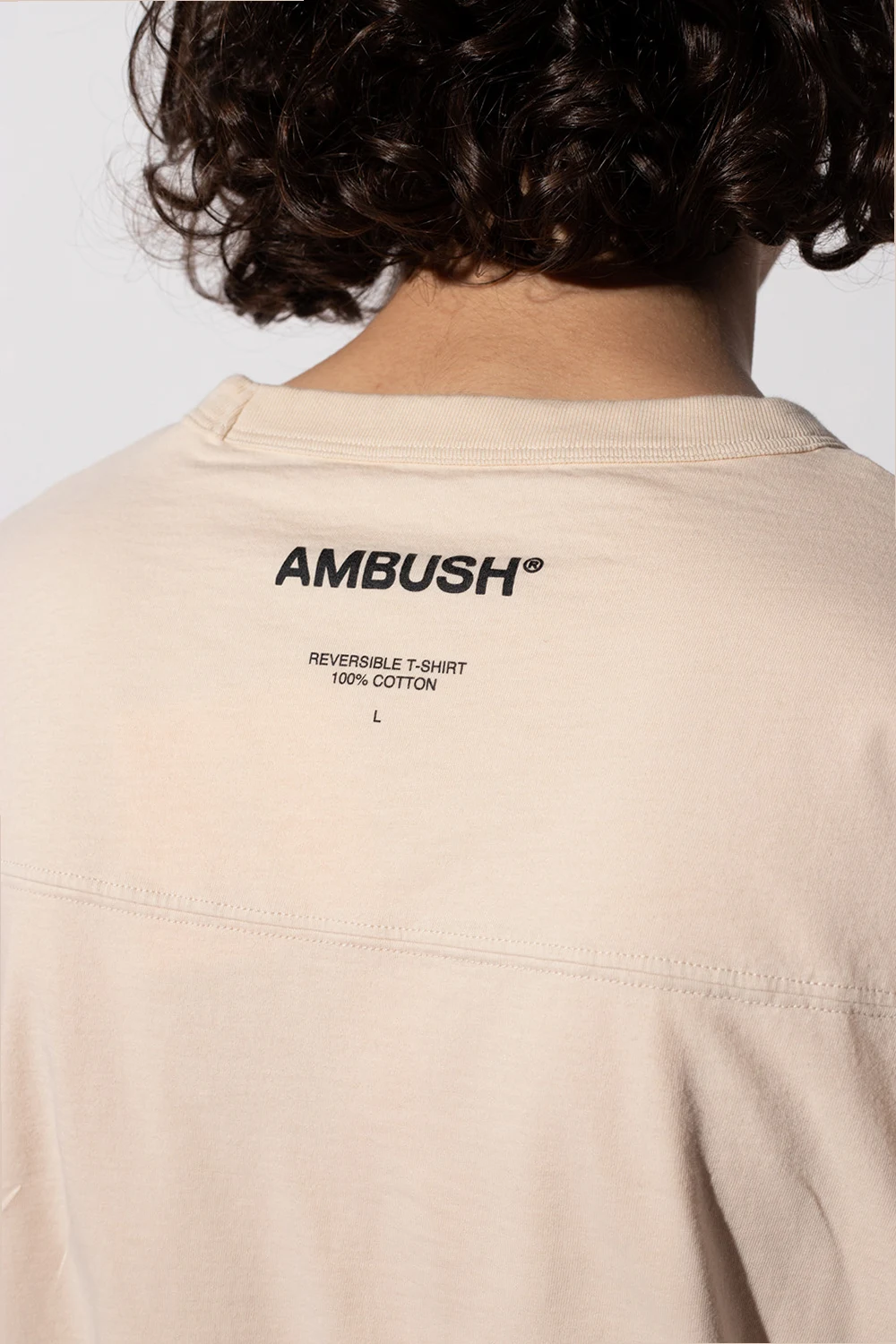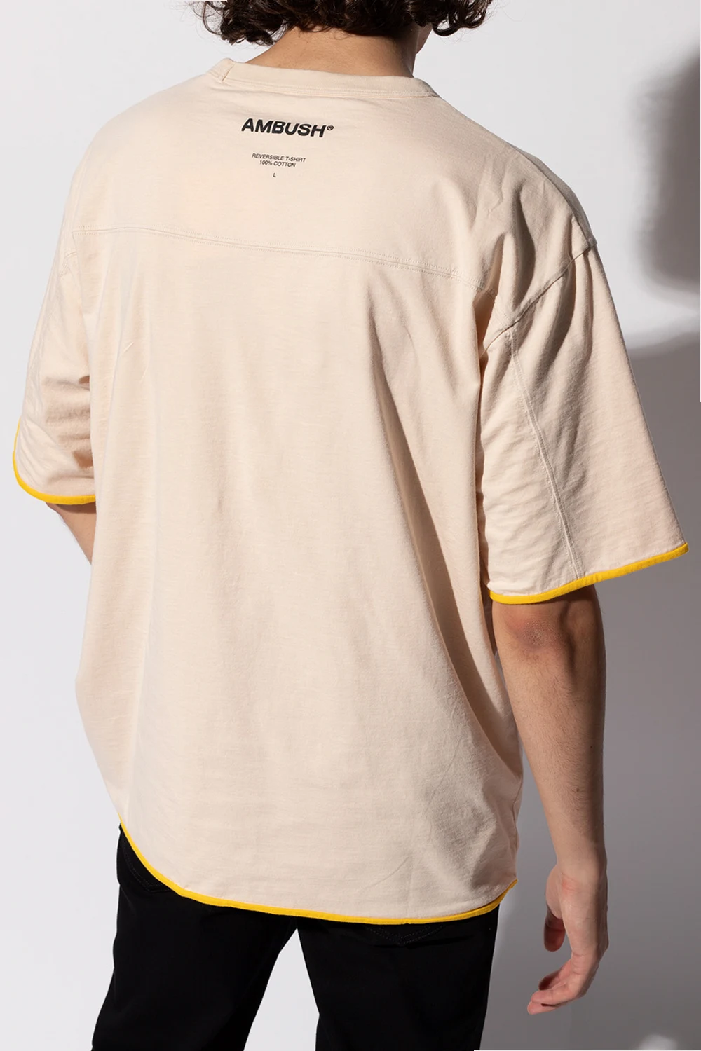 Beżowo-żółty, dwustronny t-shirt Ambush. Wykonany z bawełny. Z tyłu nadrukowany wzór z logo w kolorze czarnym. Okrągły dekolt wykończony ściągaczem. Krótkie rękawy.