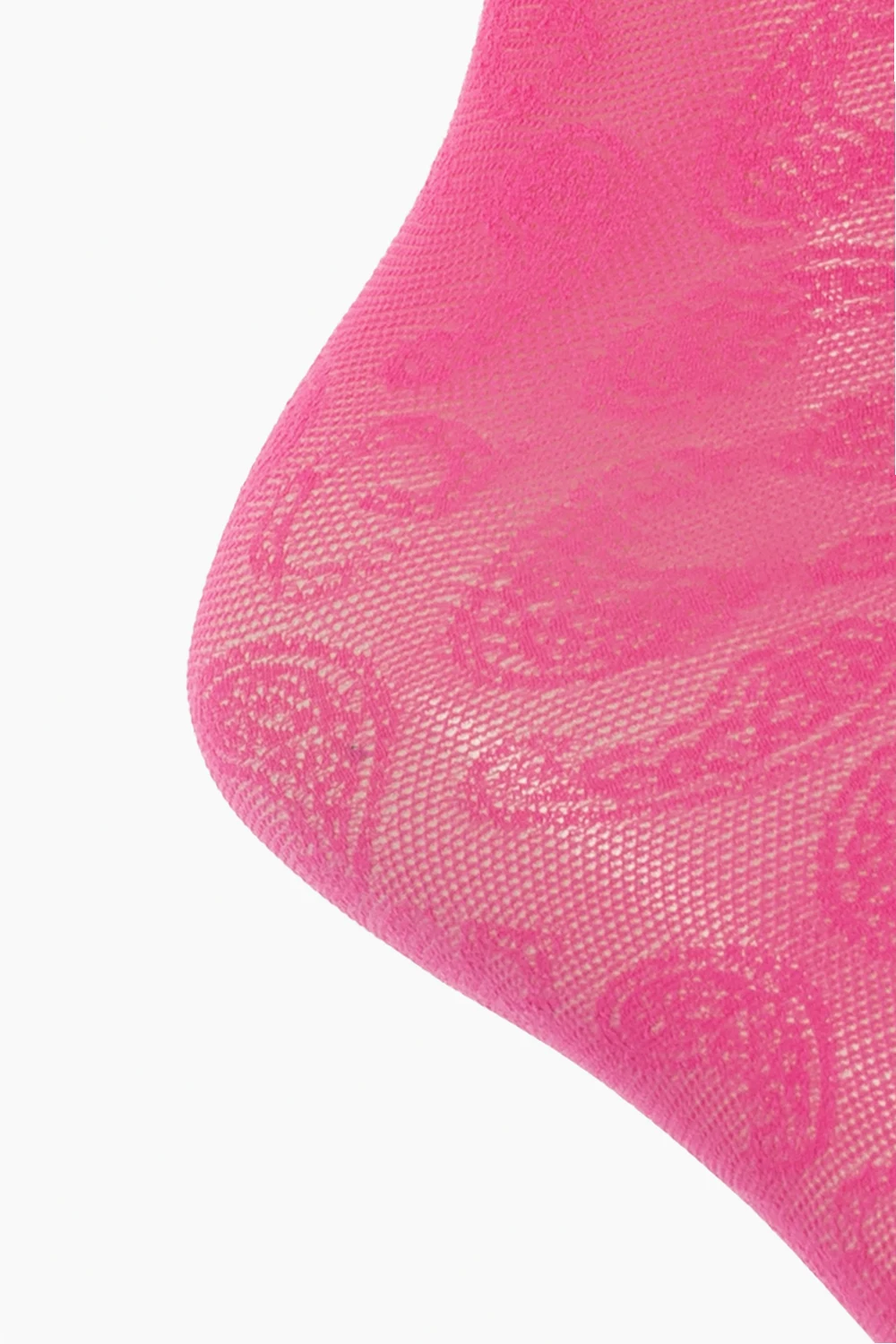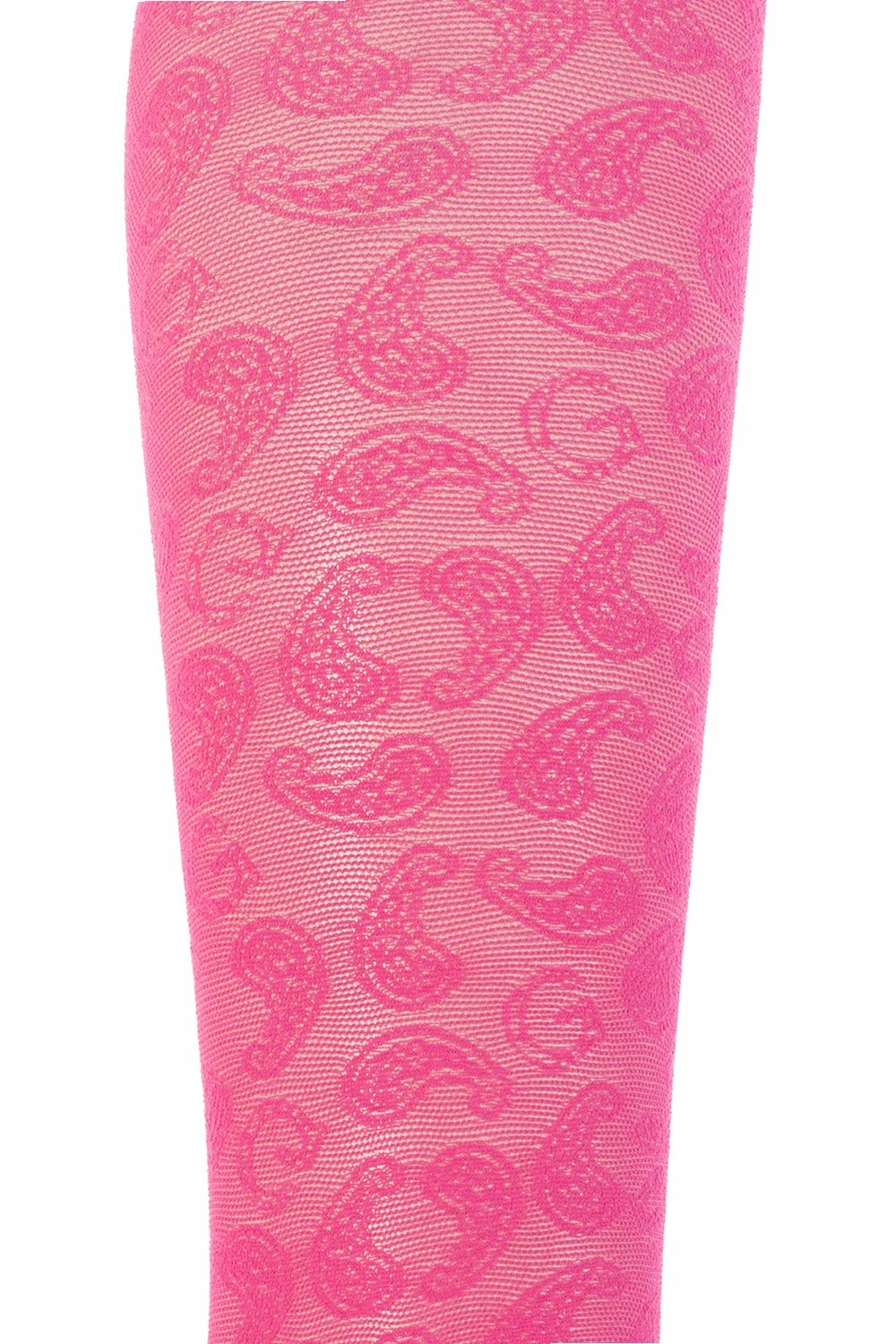 Różowe, ażurowe rajstopy Ganni. Ozdobione wyszytym wzorem 'paisley'. Grubość 50 den.