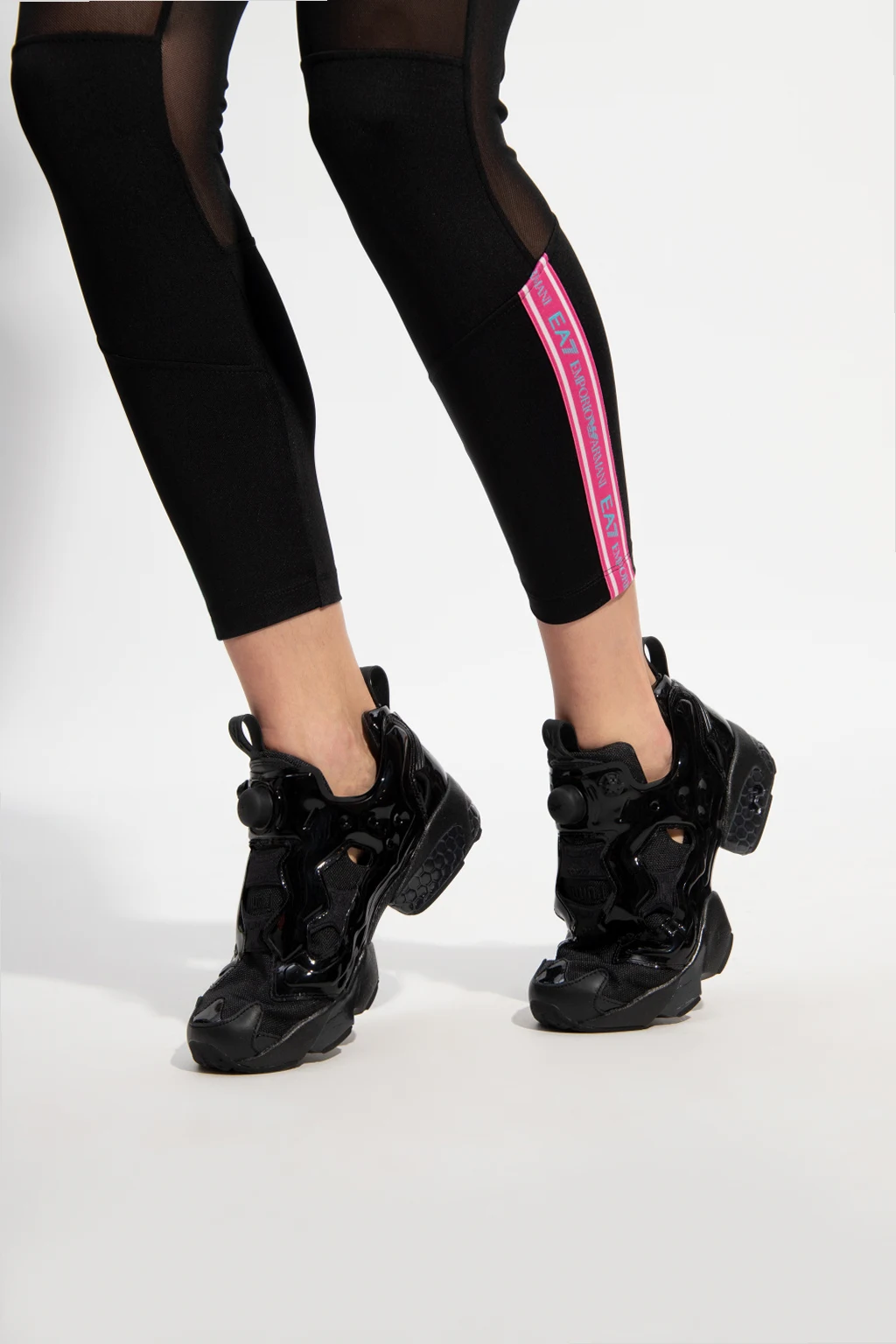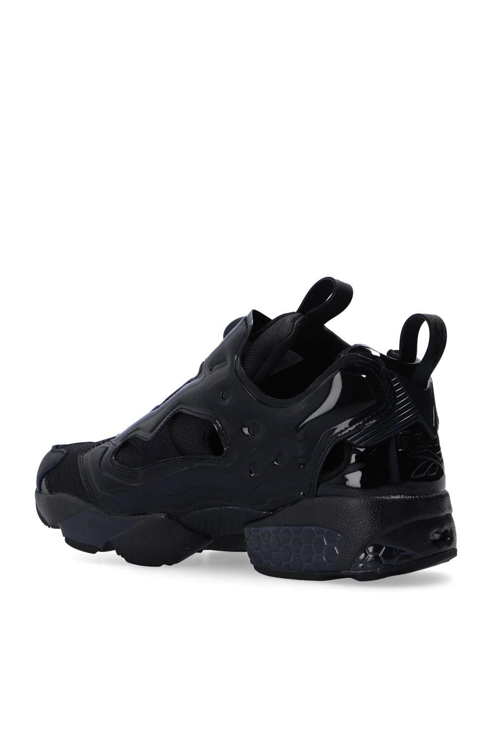 Czarne buty sportowe, model ‘Instapump Fury OG’ Reebok x Juun.J. Wykończone lakierowanym materiałem. Z przodu aplikacja z technologią ‘Pump’ zapewniającą indywidualne dopasowanie do stopy. Wyszyte logo. Dekoracyjne wycięcia. Amortyzacja Hexalite o strukturze plastra miodu zapewnia niezwykłą wygodę podczas ruchu. Czarna, gumowa podeszwa.