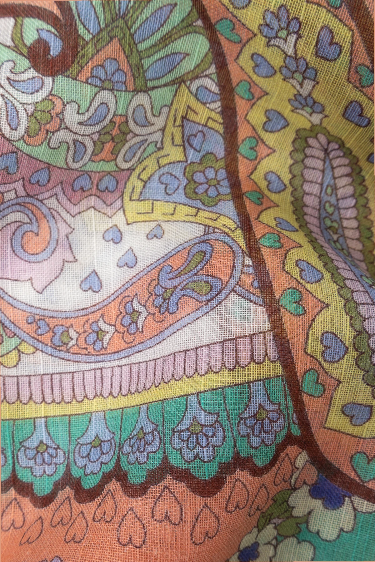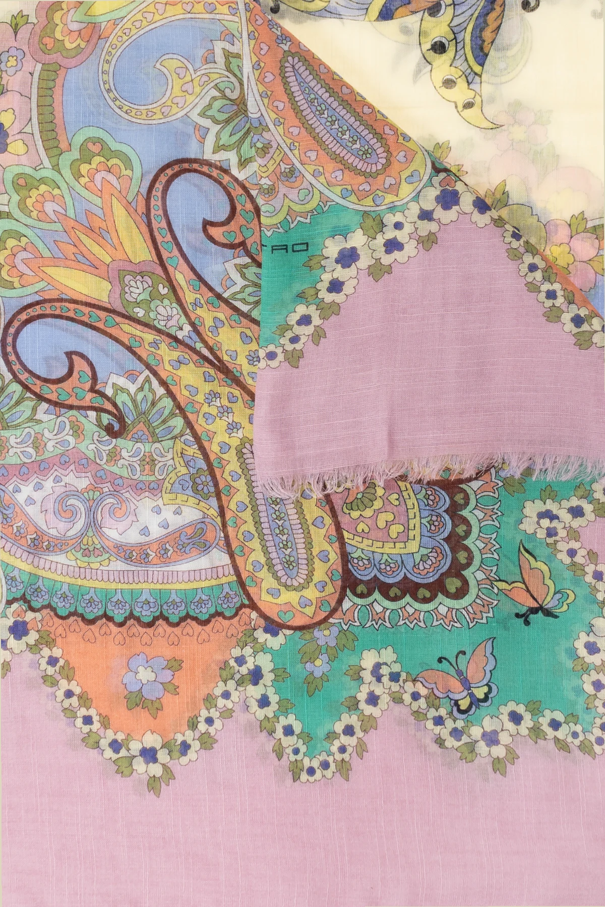 Brzegi szala są lekko postrzępione, co dodaje mu nieformalnego charakteru i czyni go idealnym do zestawienia z prostymi, eleganckimi strojami. Bogaty wzór, pełen motywów roślinnych, kwiatowych oraz subtelnych motyli, stanowi ukłon w stronę azjatyckiego wzornictwa, z którego Etro czerpie inspiracje od lat 60. pod kierownictwem dyrektora kreatywnego Marco De Vincenzo .