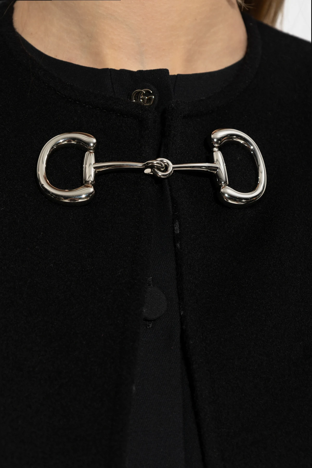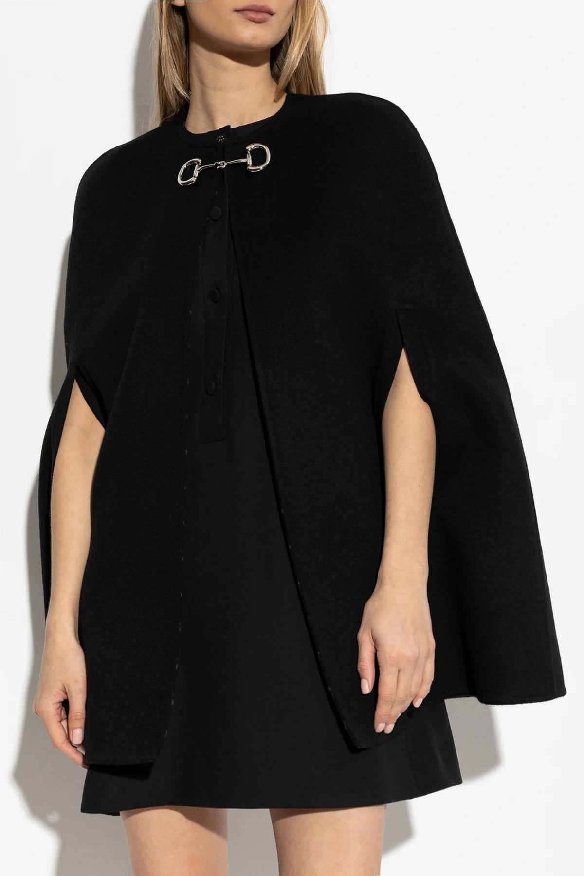 Ponczo wyróżnia się subtelnym, a zarazem efektownym zapięciem z metalowym elementem, który stanowi jego centralny punkt dekoracyjny. Wnętrze wykończone podszewką z logo marki Gucci dodaje ekskluzywności, a głęboka czerń nadaje mu uniwersalności.