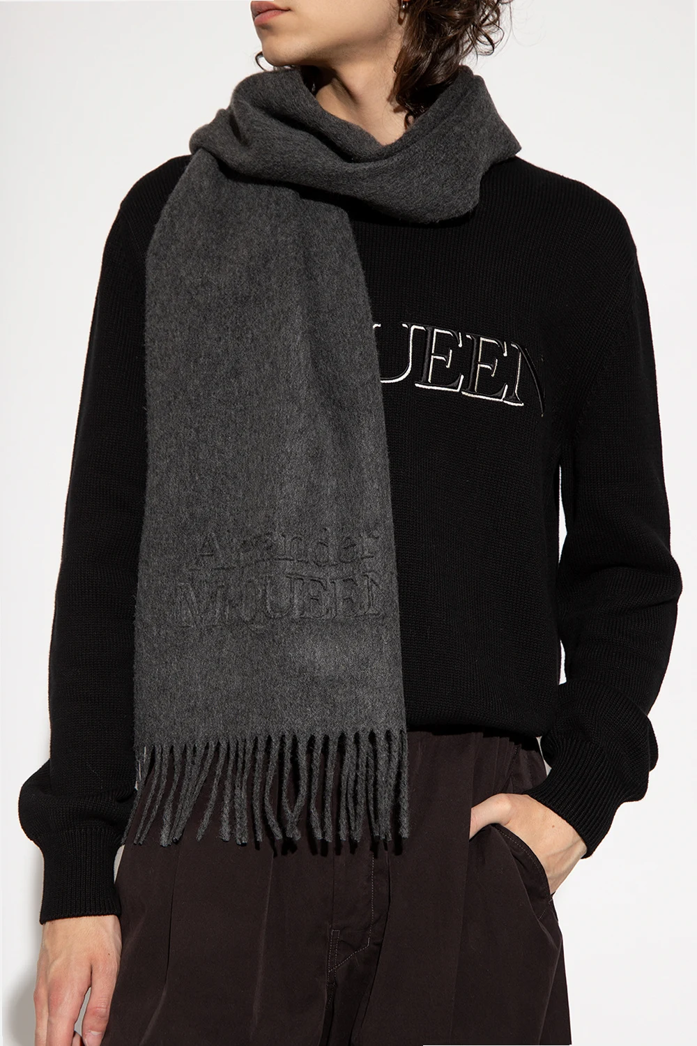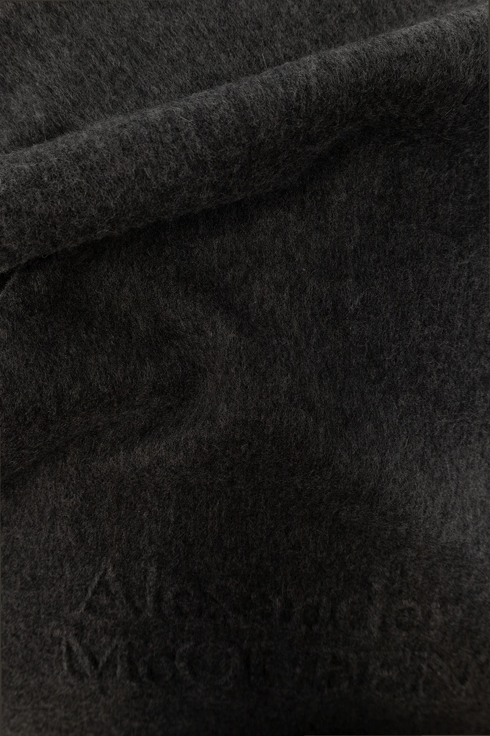 Ciemnoszary, kaszmirowy szal Alexander McQueen. Ozdobiony wytłoczonym logo. Wykończony frędzlami.