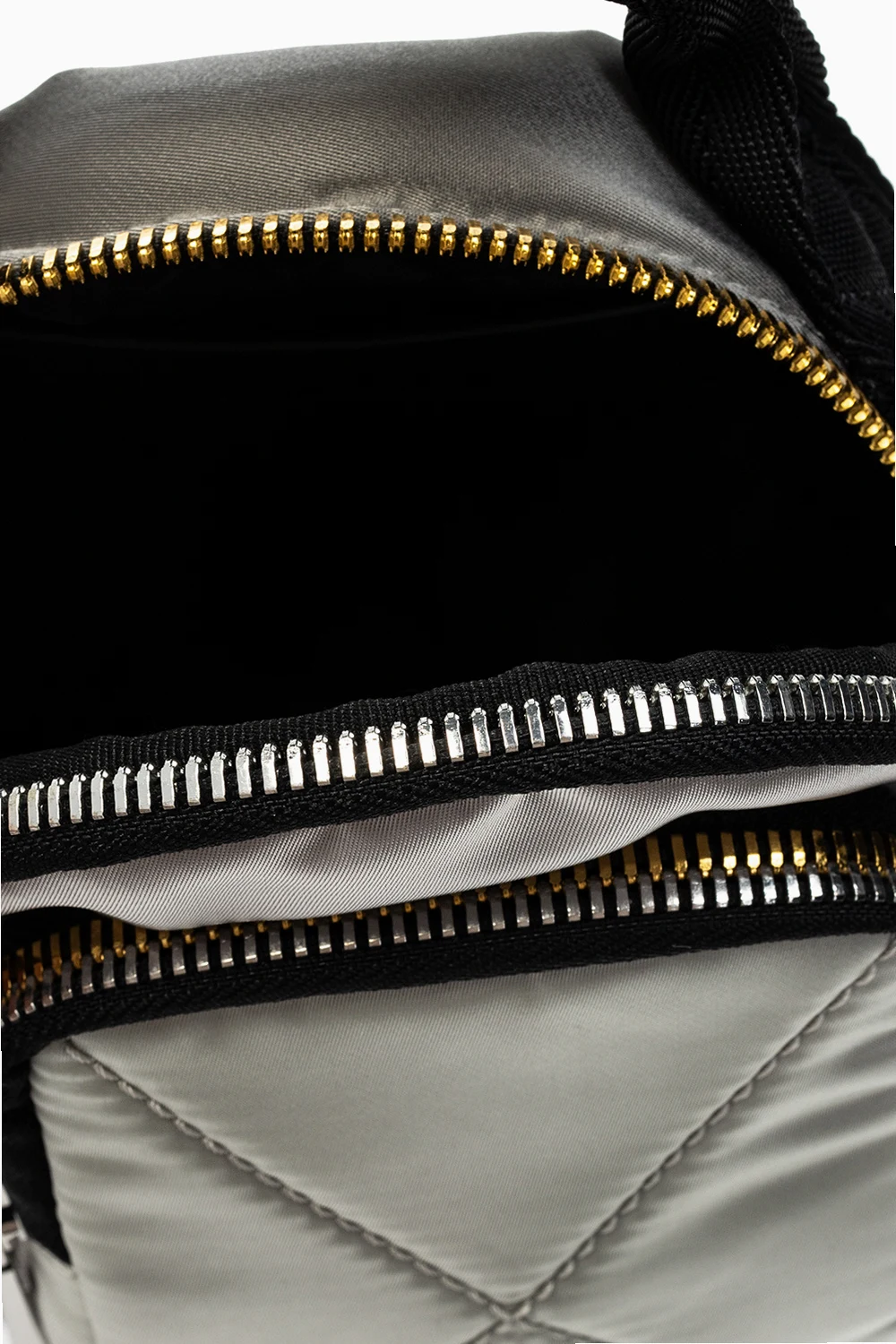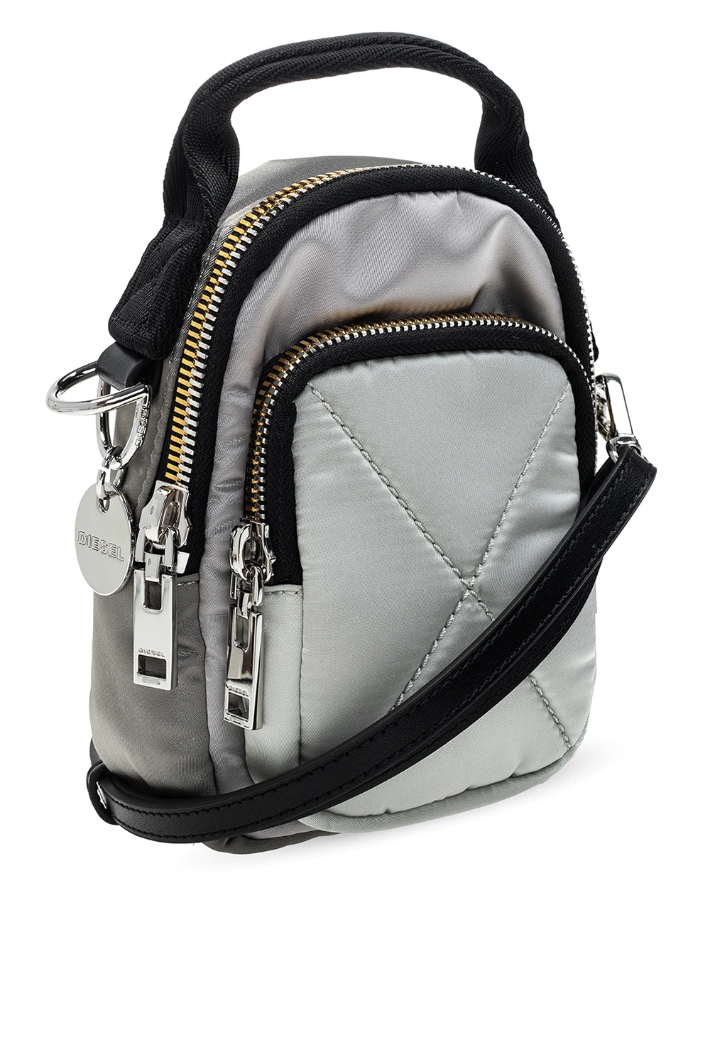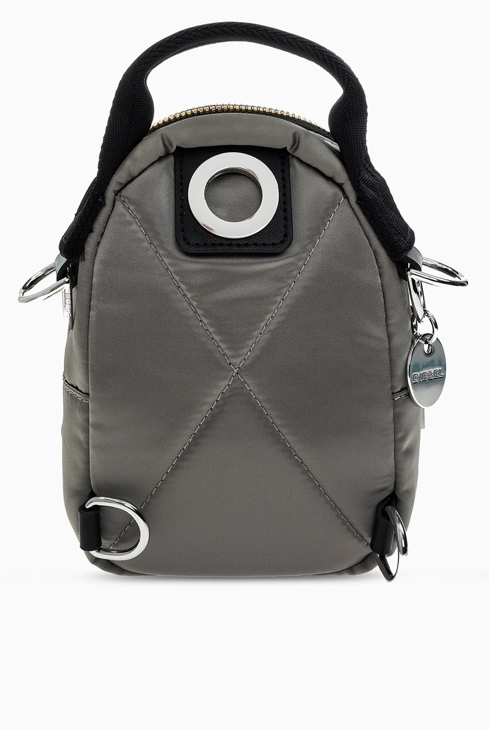 Plecak w kolorze srebrnym, model ‘Ledybag’ Diesel. Zamykany na zamek w kolorze złoto-srebrnym. Z przodu kieszeń zamykana na zamek. Dołączona zawieszka z wytłoczonym logo w kolorze srebrnym. Półokrągła rączka. Odpinany, regulowany pasek. Wewnątrz komora.