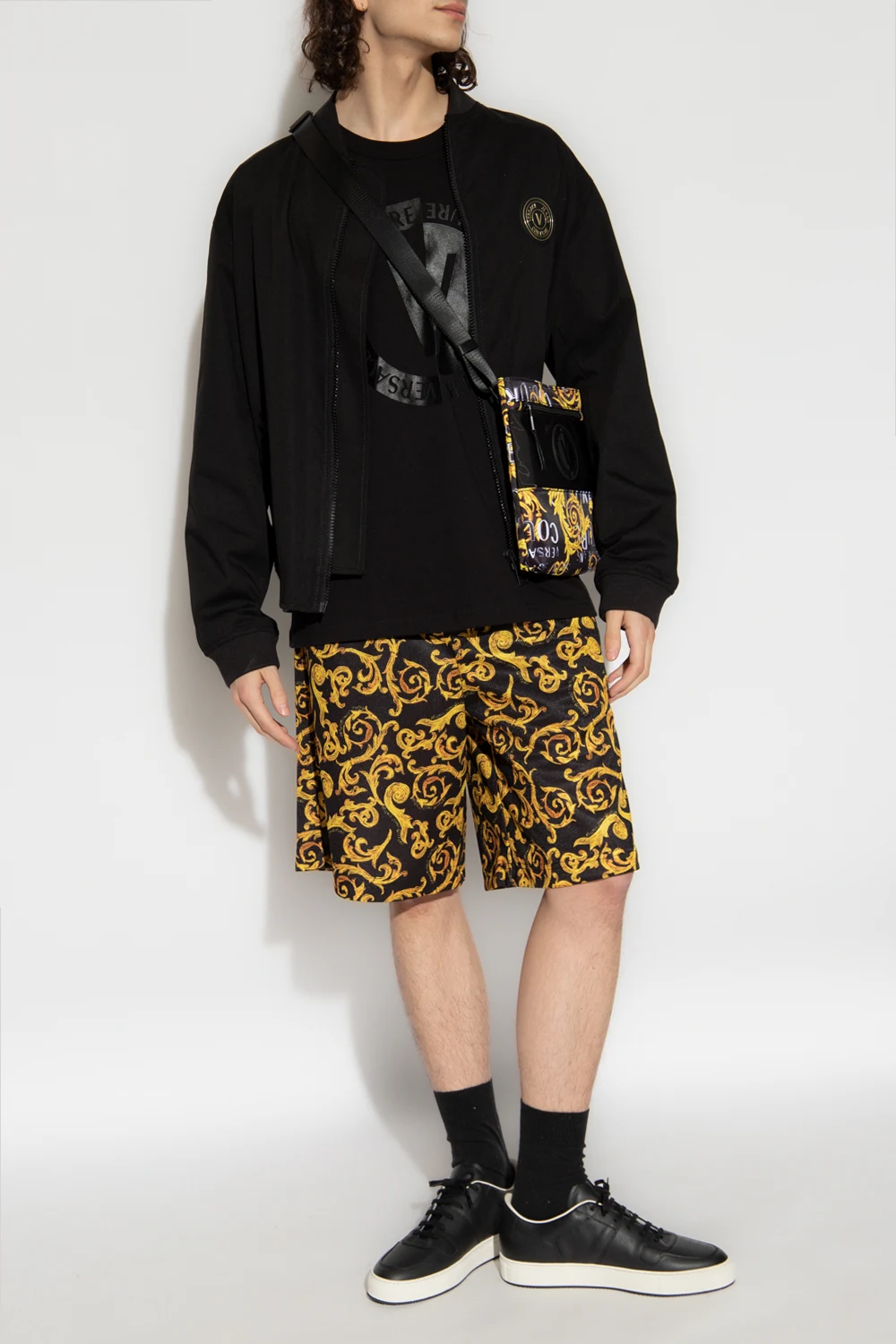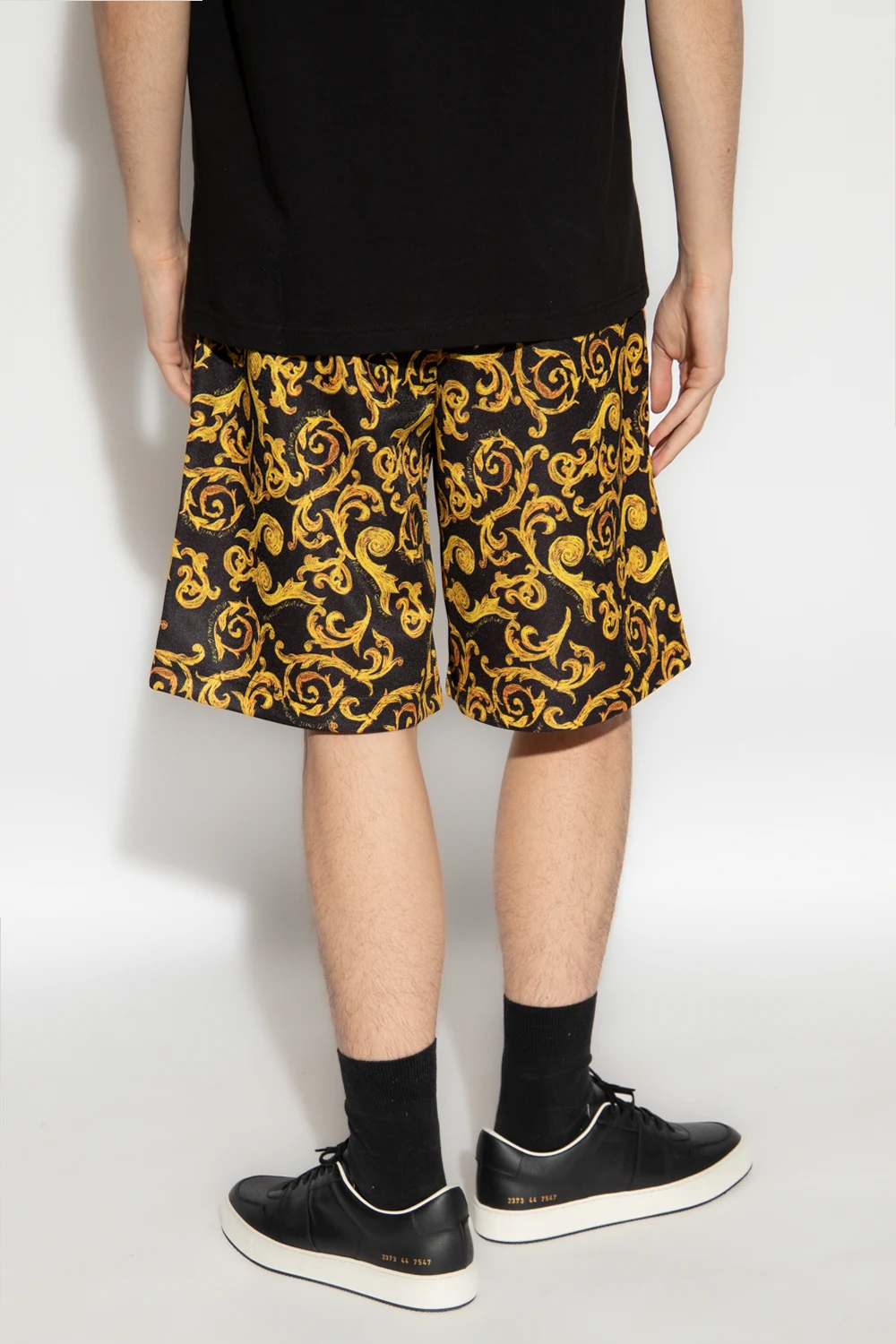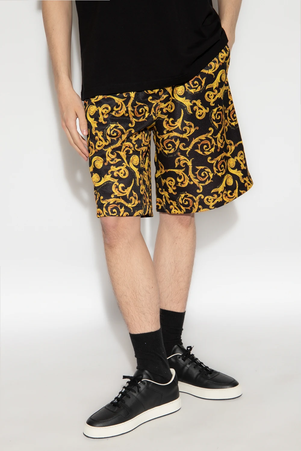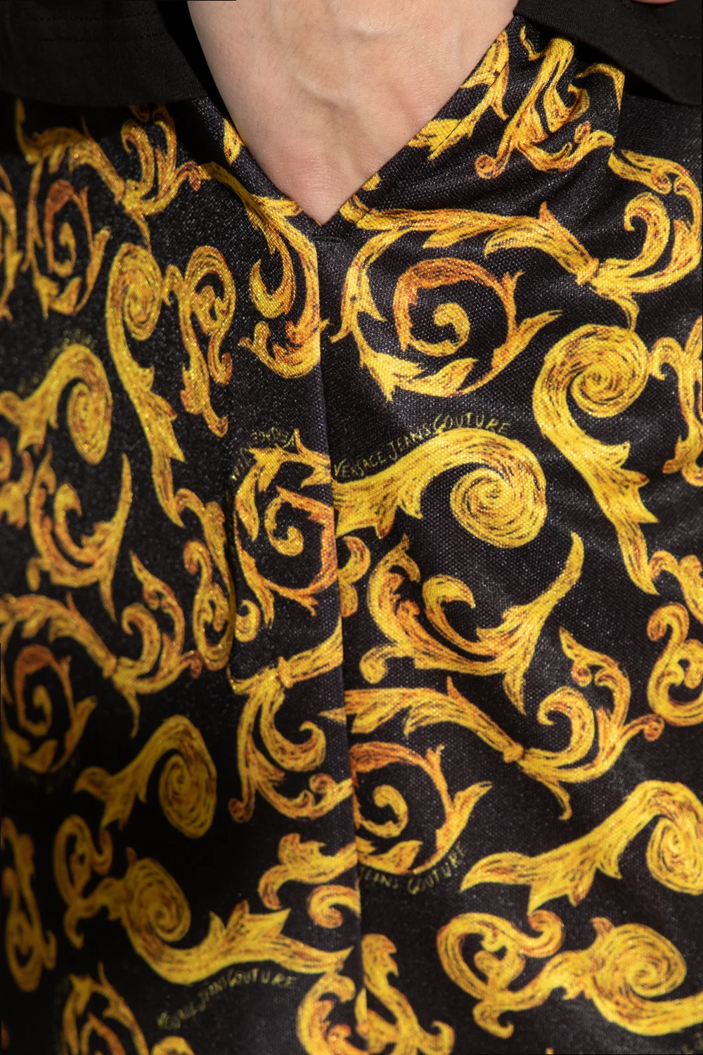 Czarno-żółte szorty Versace Jeans Couture. W pasie wszyta guma ściągana trokami. Ozdobione charakterystycznym dla marki wzorem. Dwie kieszenie wsuwane.