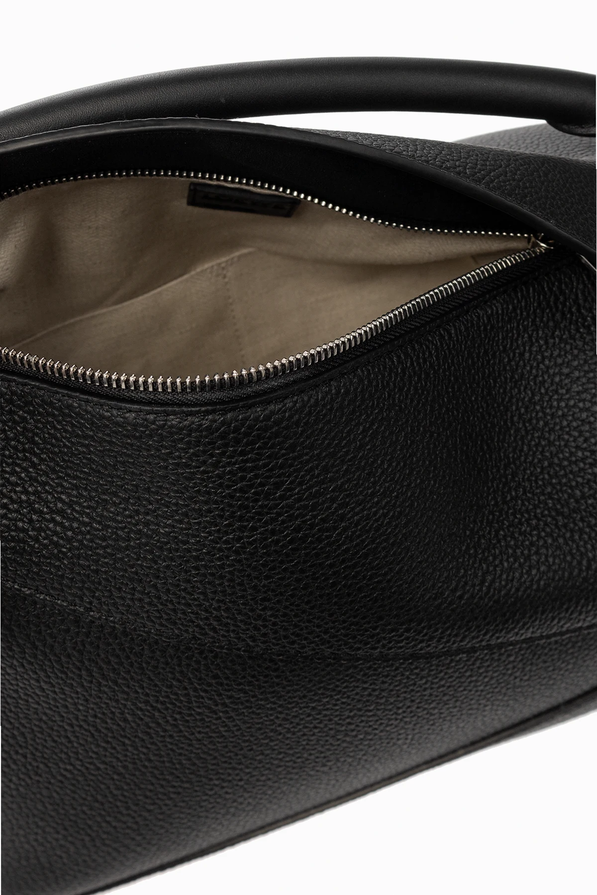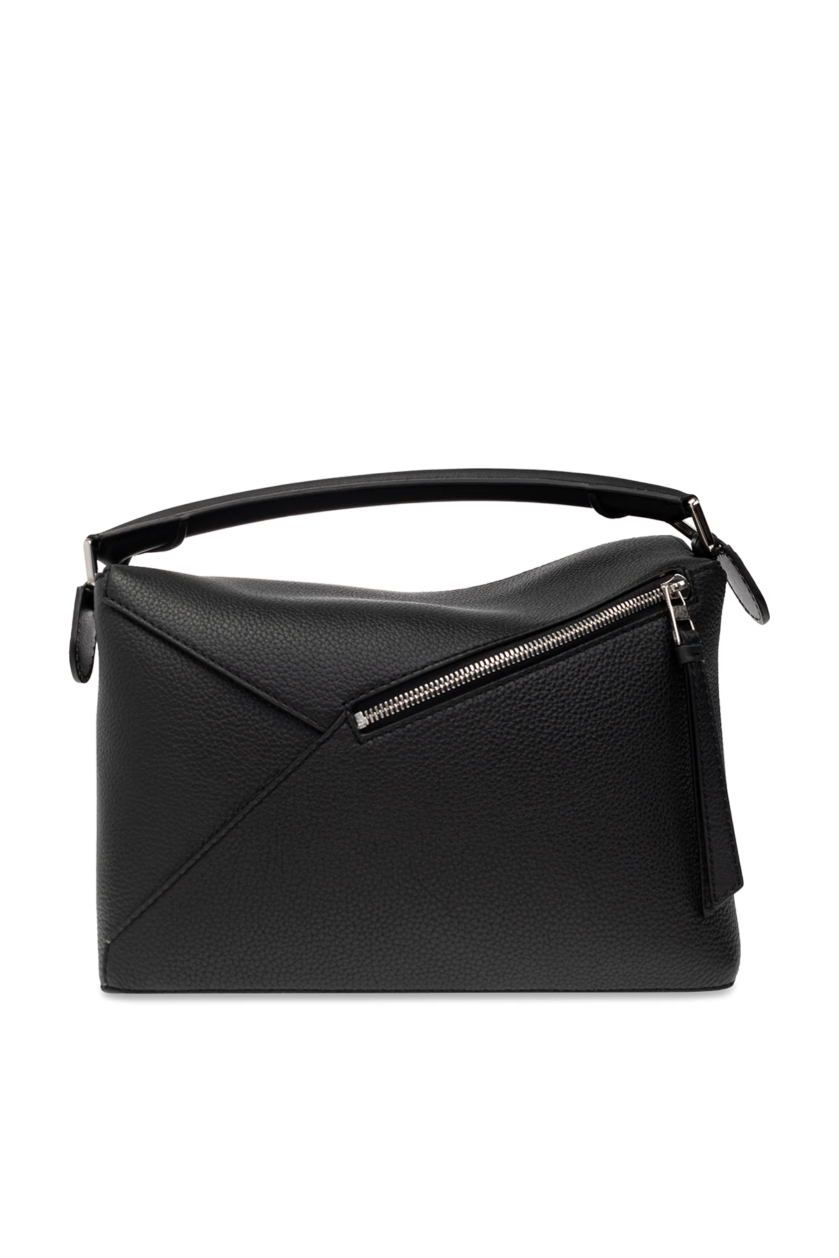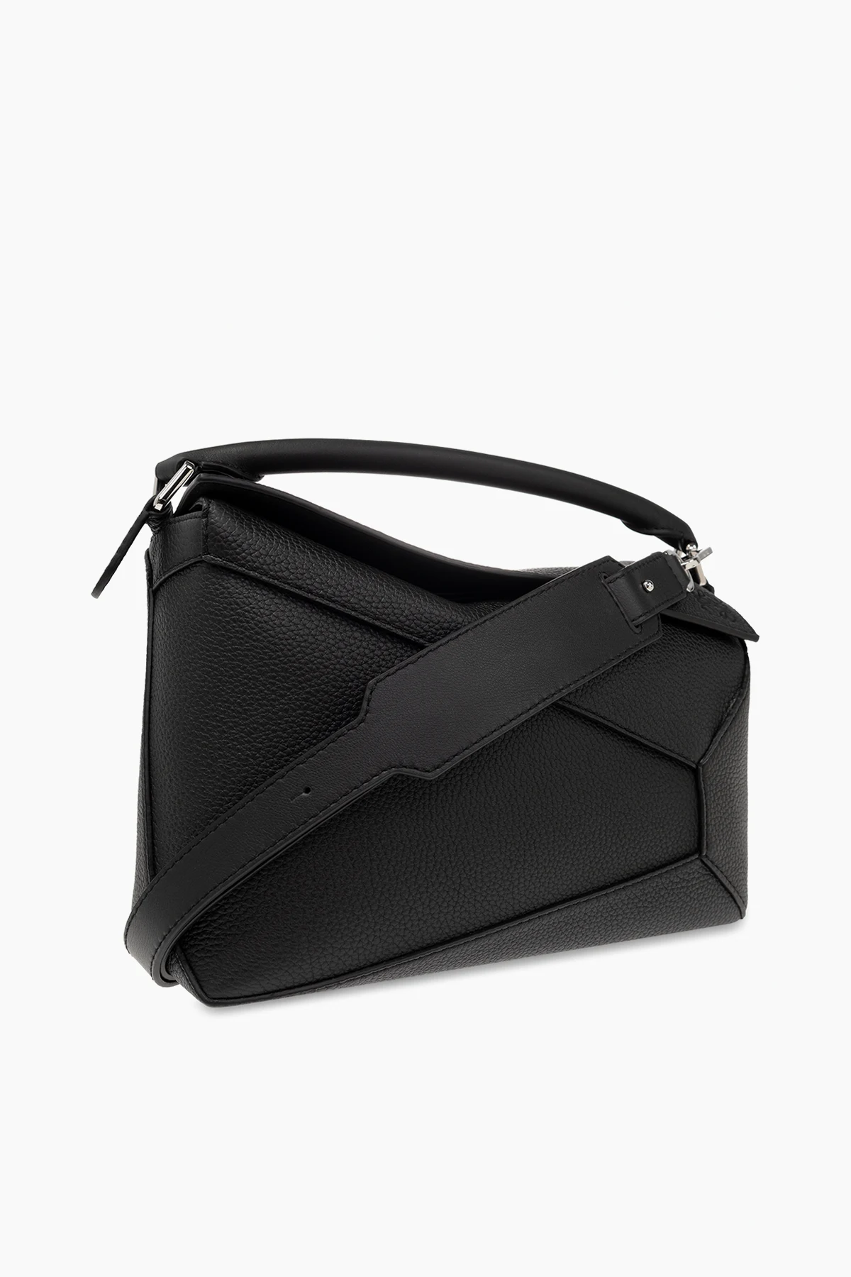 Czarna torba na ramię, model ‘Puzzle’ Loewe. Wykonana ze skóry. Zamykana na patkę z wytłoczonym logo oraz zamek. Ozdobiona asymetrycznymi szwami. Z tyłu kieszeń zamykana na zamek. Półokrągła rączka. Odpinany, regulowany pasek. Wewnątrz komora i dwie wsuwane kieszenie. Metalowe wykończenie w kolorze srebrnym.