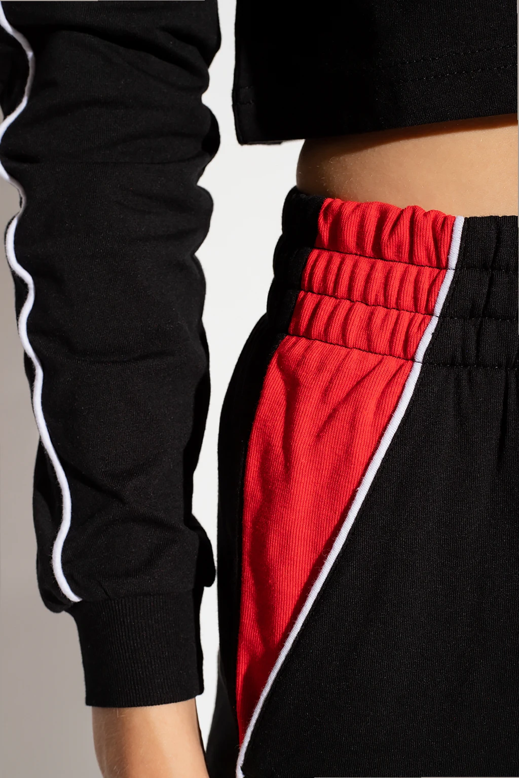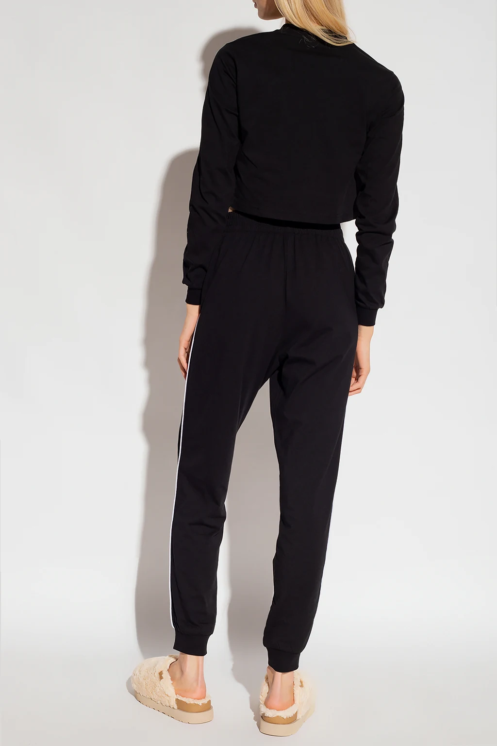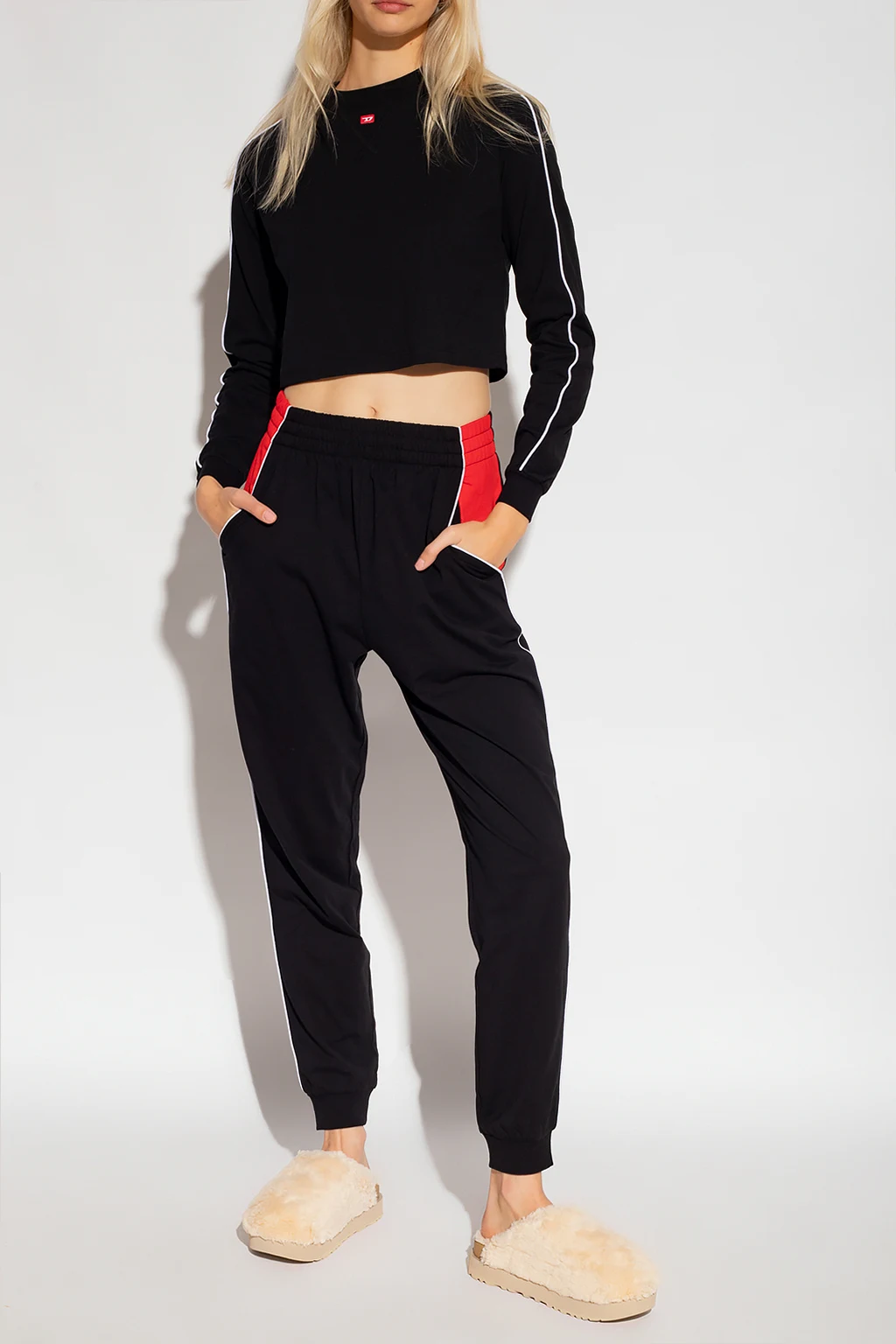 Czarna, dwuczęściowa piżama, model ‘UFSET-SLIMMY-TOOL’ Diesel. Wykonana częściowo z bawełny. Krótki top z czerwoną naszywką z logo na przodzie, okrągłym dekoltem i długimi rękawami zakończonymi ściągaczem z białymi paskami na ramionach. Długie spodnie z wszytą w pasie gumą, czerwonymi wstawkami po bokach i dwiema kieszeniami. Długie nogawki z naszytymi paskami w kolorze białym, zakończone ściągaczem.