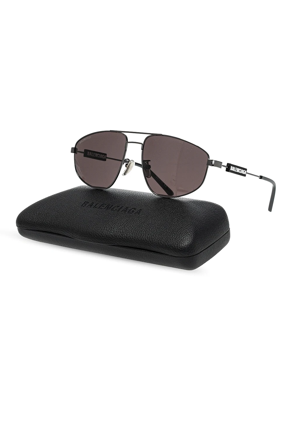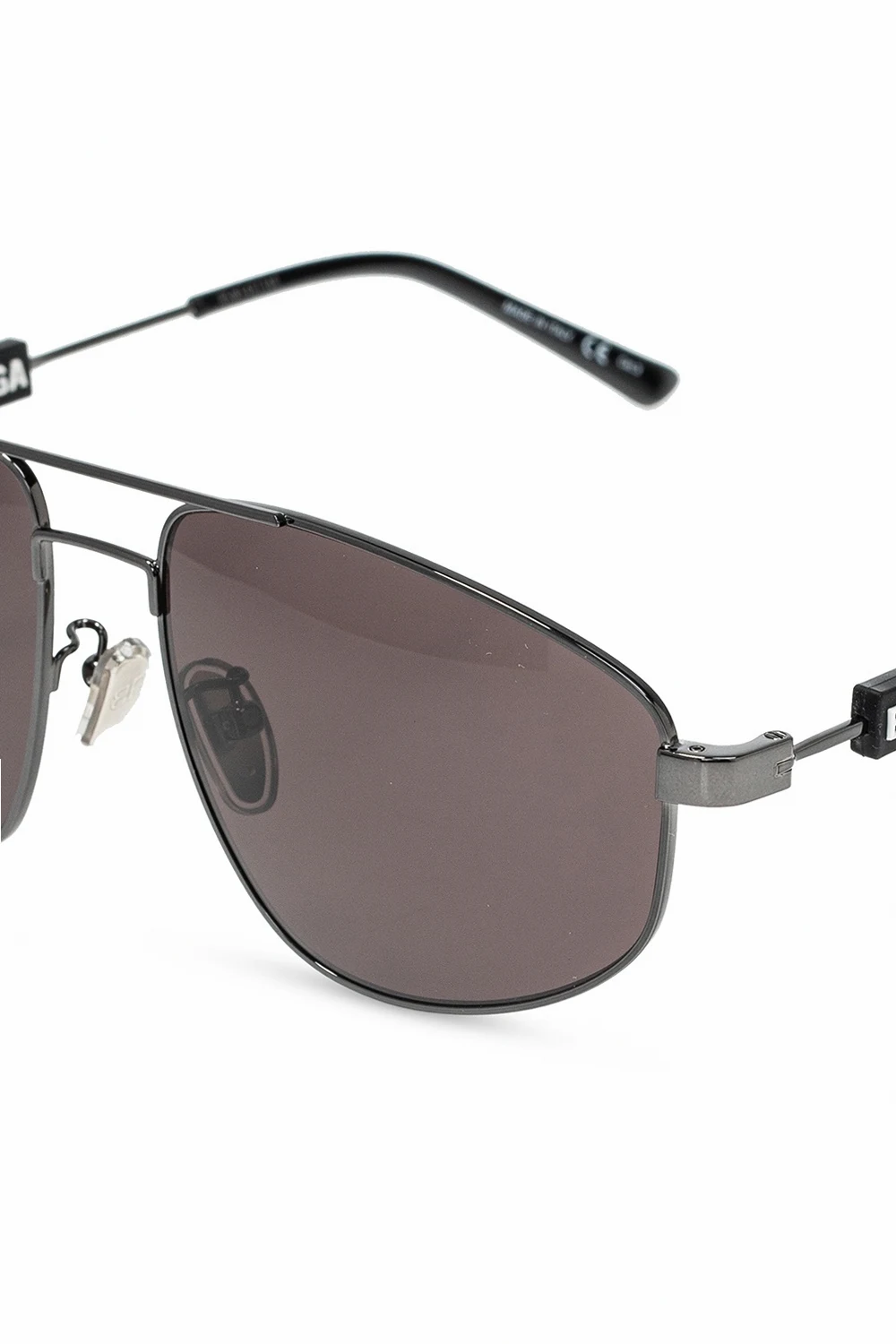 Czarne okulary przeciwsłoneczne Balenciaga. Ozdobione gumową aplikacją i nadrukowanym logo w kolorze czarno-białym. Certyfikowane soczewki UVA/UVB w kolorze srebrnym z wytłoczonym logo.