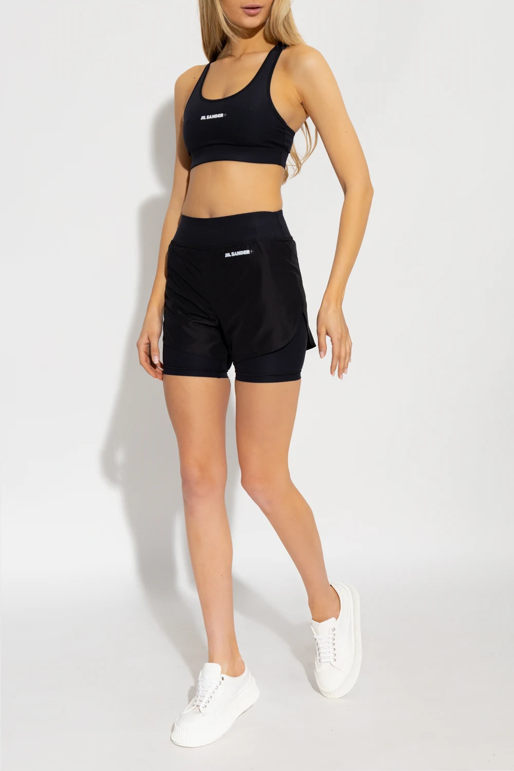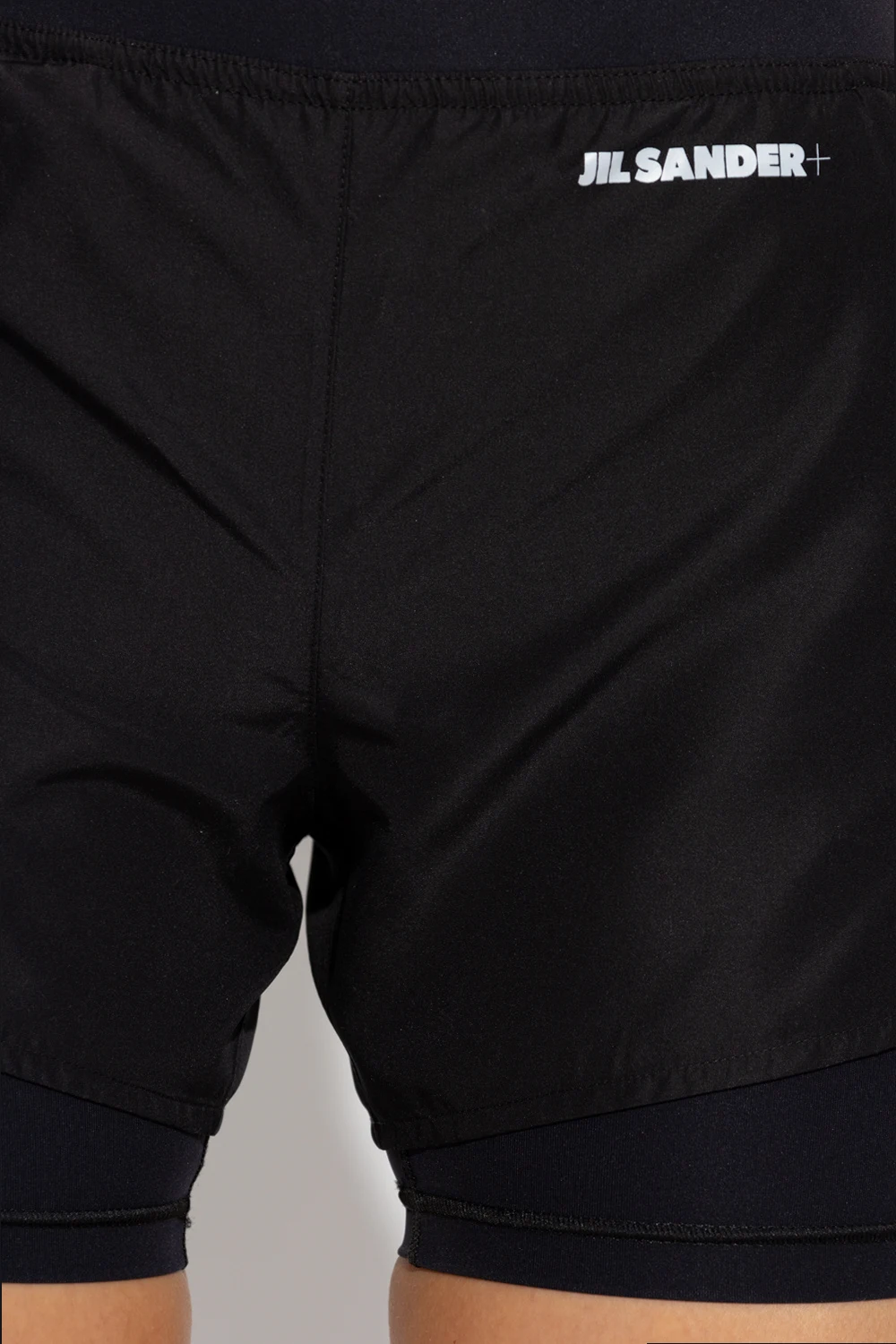 Czarne, dwuwarstwowe szorty treningowe Jil Sander+. Wykonane z materiału częściowo pochodzącego z recyklingu. W pasie wszyta guma. Z przodu nadrukowane białe logo. Dopasowana warstwa wewnętrzna.