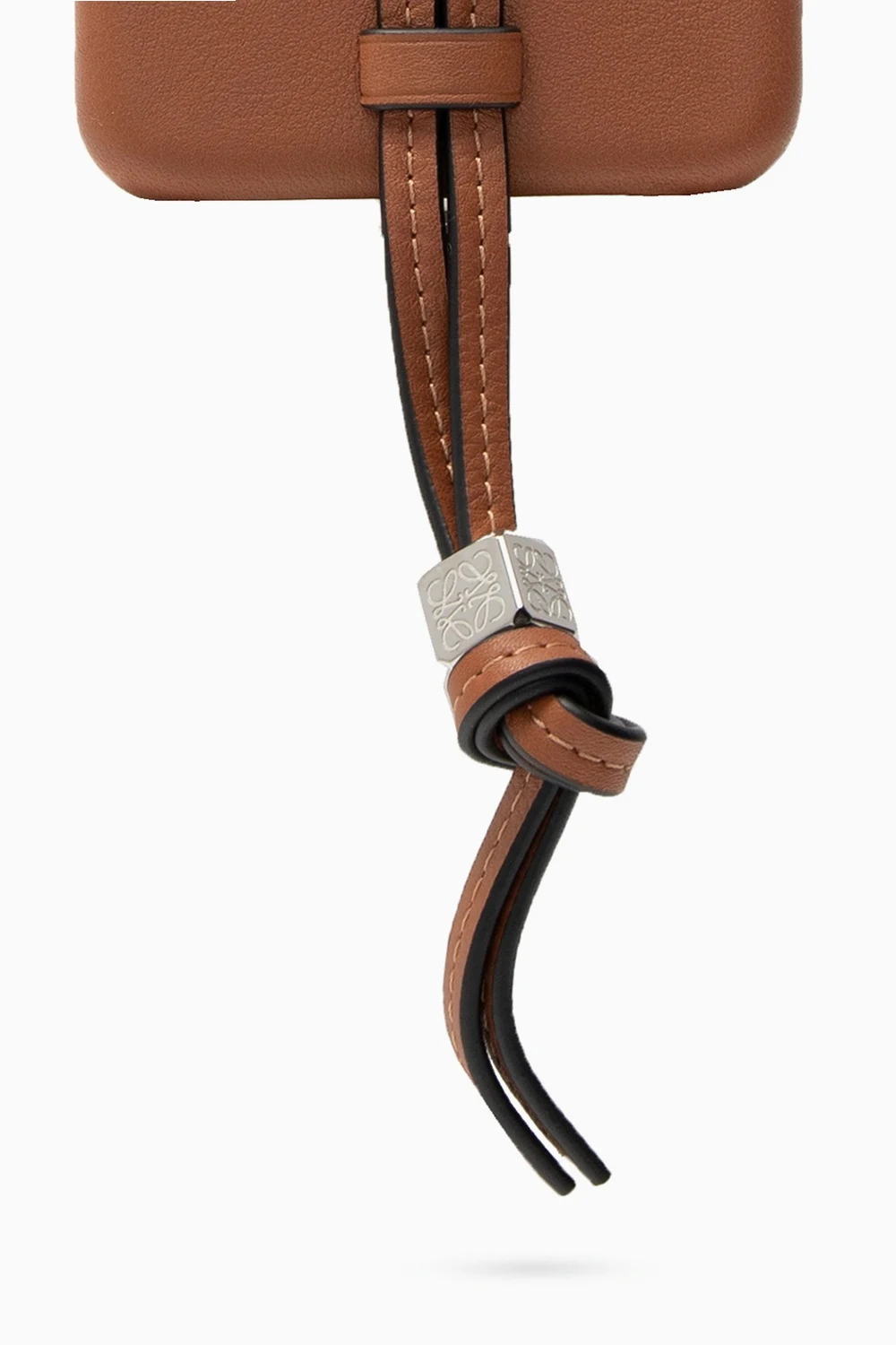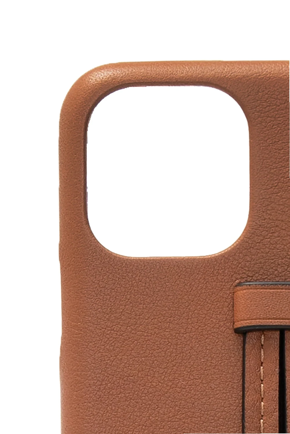 Brązowe etui na iPhone 11 Loewe. Wykonane ze skóry cielęcej. Ozdobione wytłoczonym logo. Dołączona skórzana zawieszka z metalową aplikacją w kolorze srebrnym.