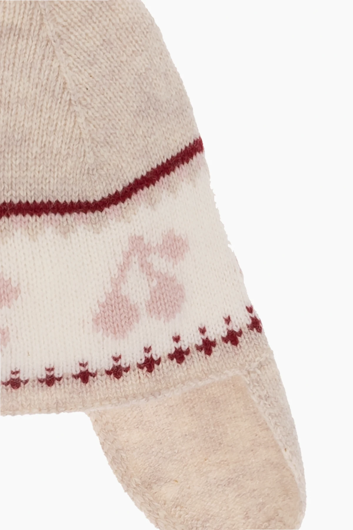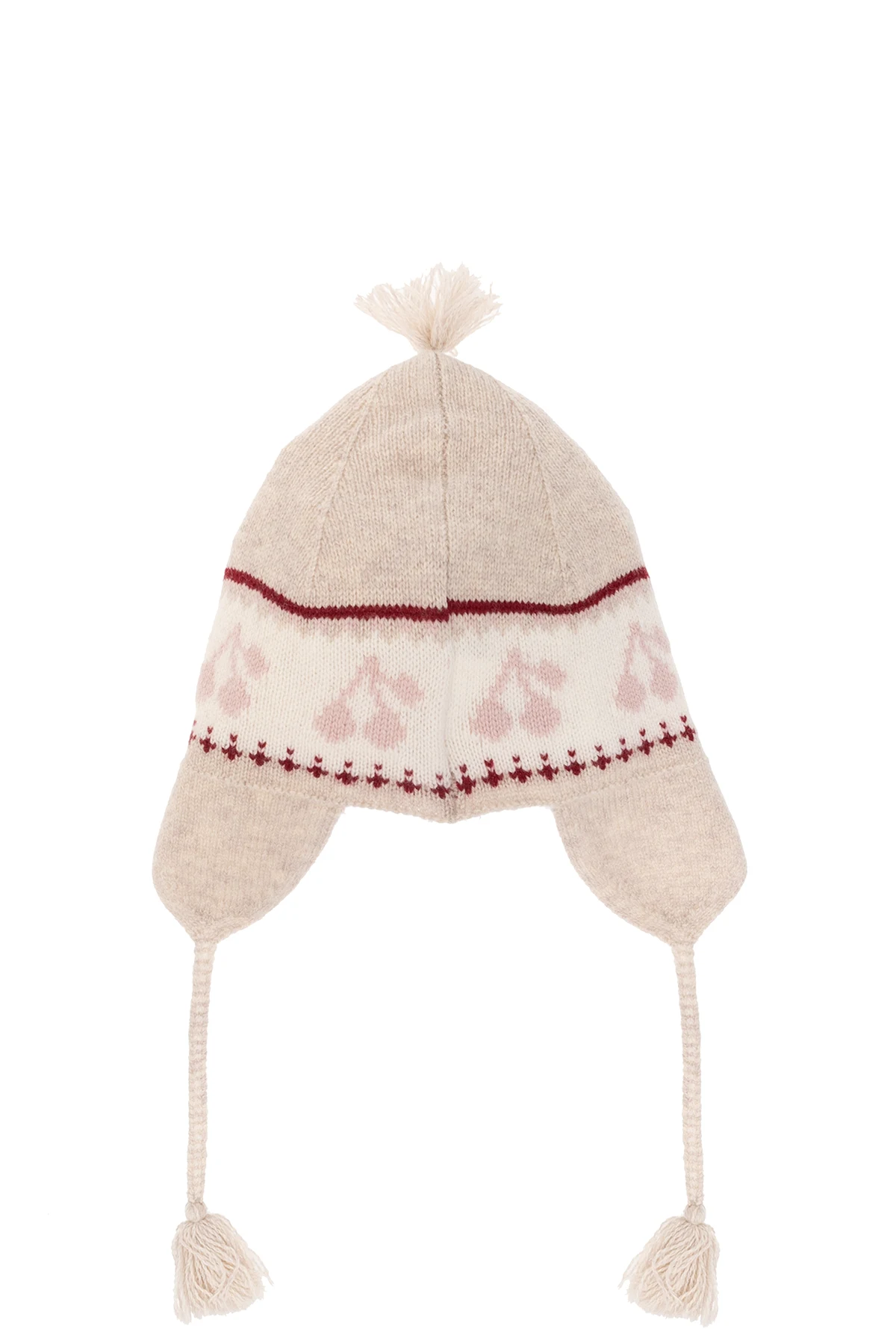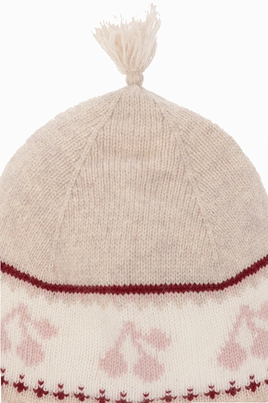 Beżowa, wełniana czapka, model ‘Dinna’ Bonpoint. Ozdobiona kremowo-różowo-czerwonym, wyszytym wzorem z logo. Troki i góra wykończone frędzlami.