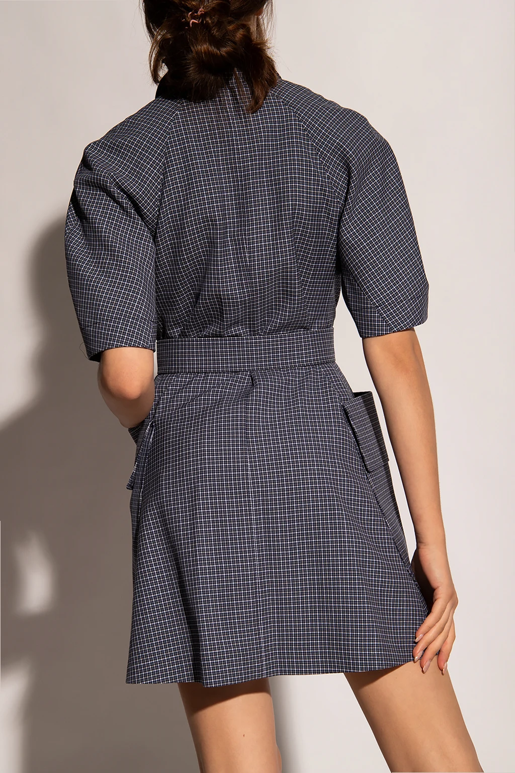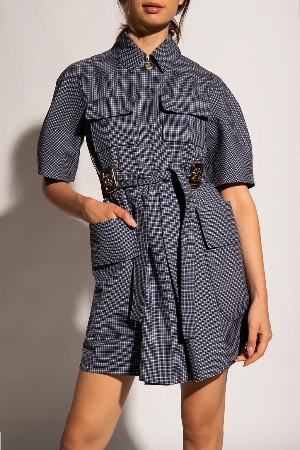 Granatowo-biała sukienka z krótkim rękawem Lanvin. Wykonana z wełny. Z przodu zapinana na zamek. Ozdobiona wzorem w kratę. W talii pasek. Z przodu dekoracyjne aplikacje w kolorze złotym oraz cztery wsuwane kieszenie z ozdobnymi patkami.