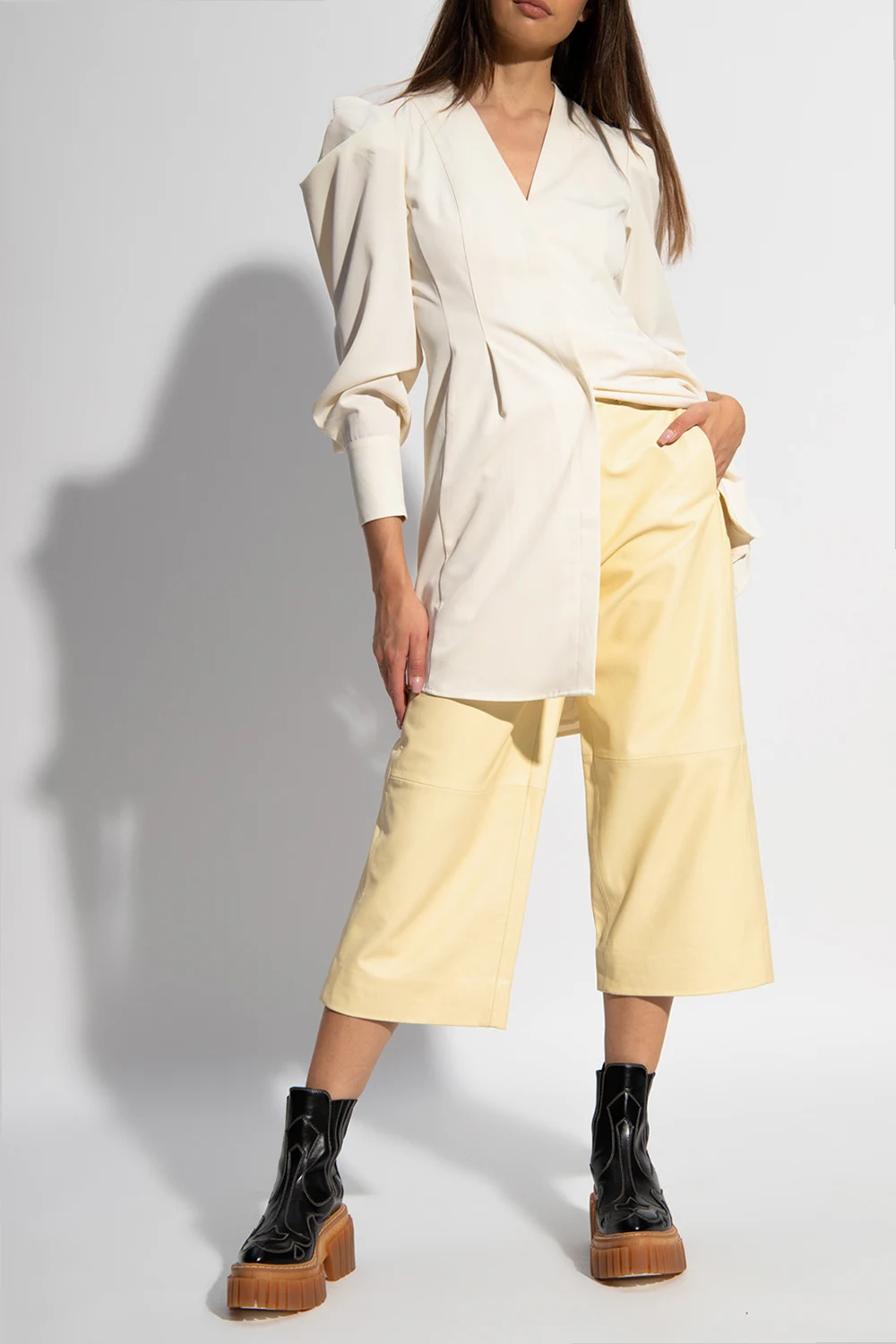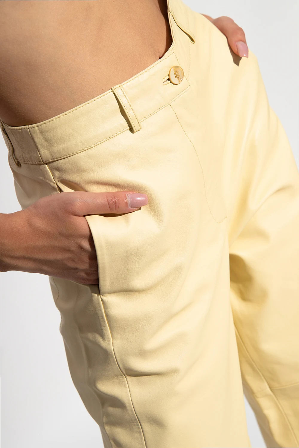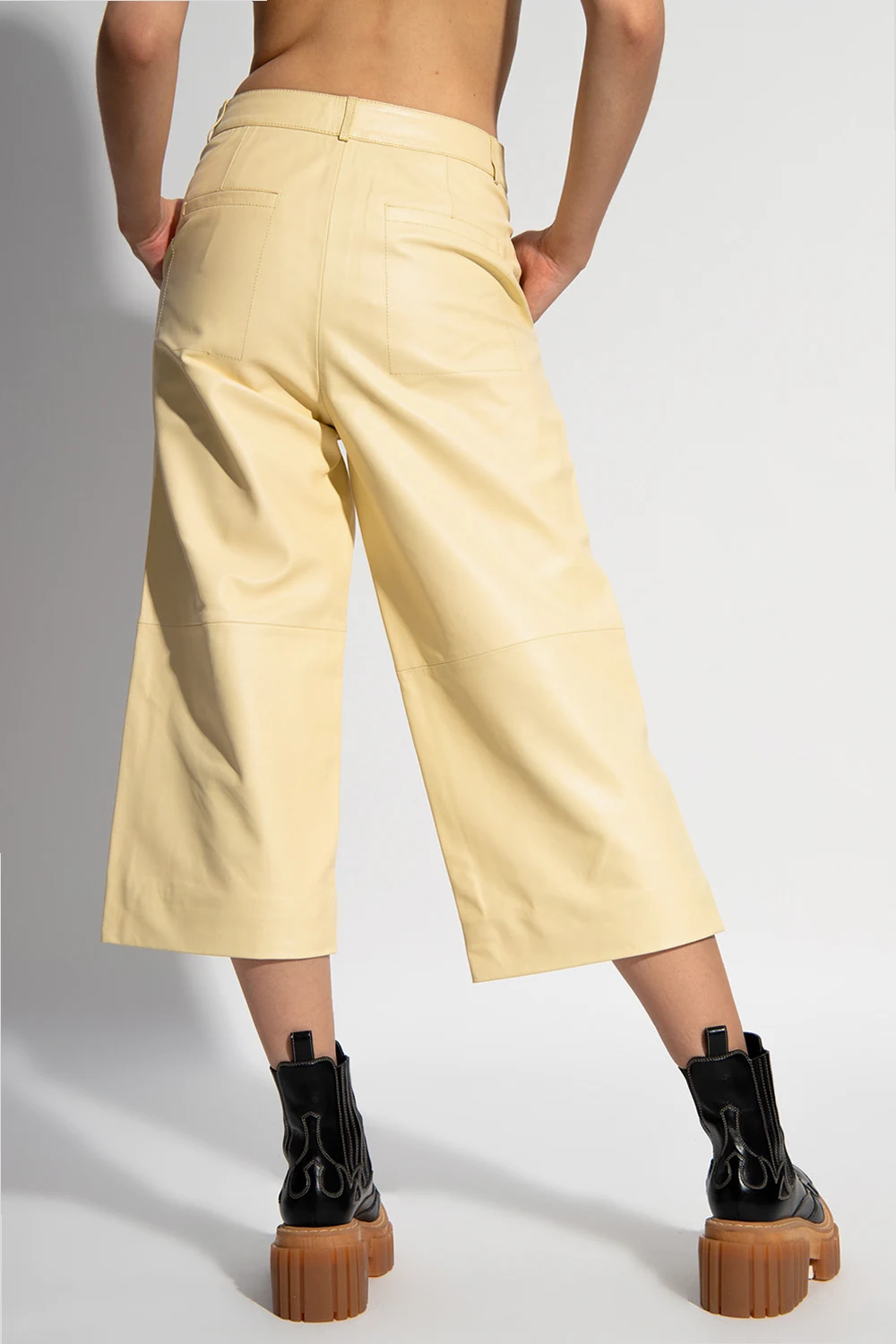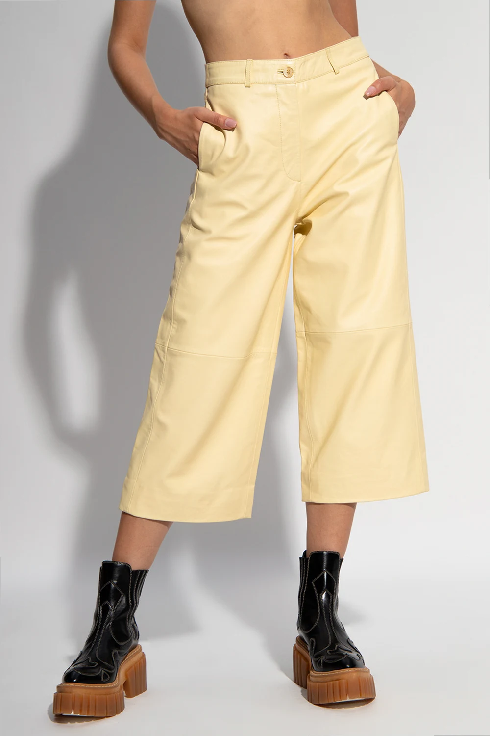 Żółte spodnie Holzweiler. Wykonane ze skóry jagnięcej. Zapinane na zamek oraz guzik. Cztery wsuwane kieszenie. Dekoracyjne przeszycia. Proste nogawki o długości trzy czwarte.