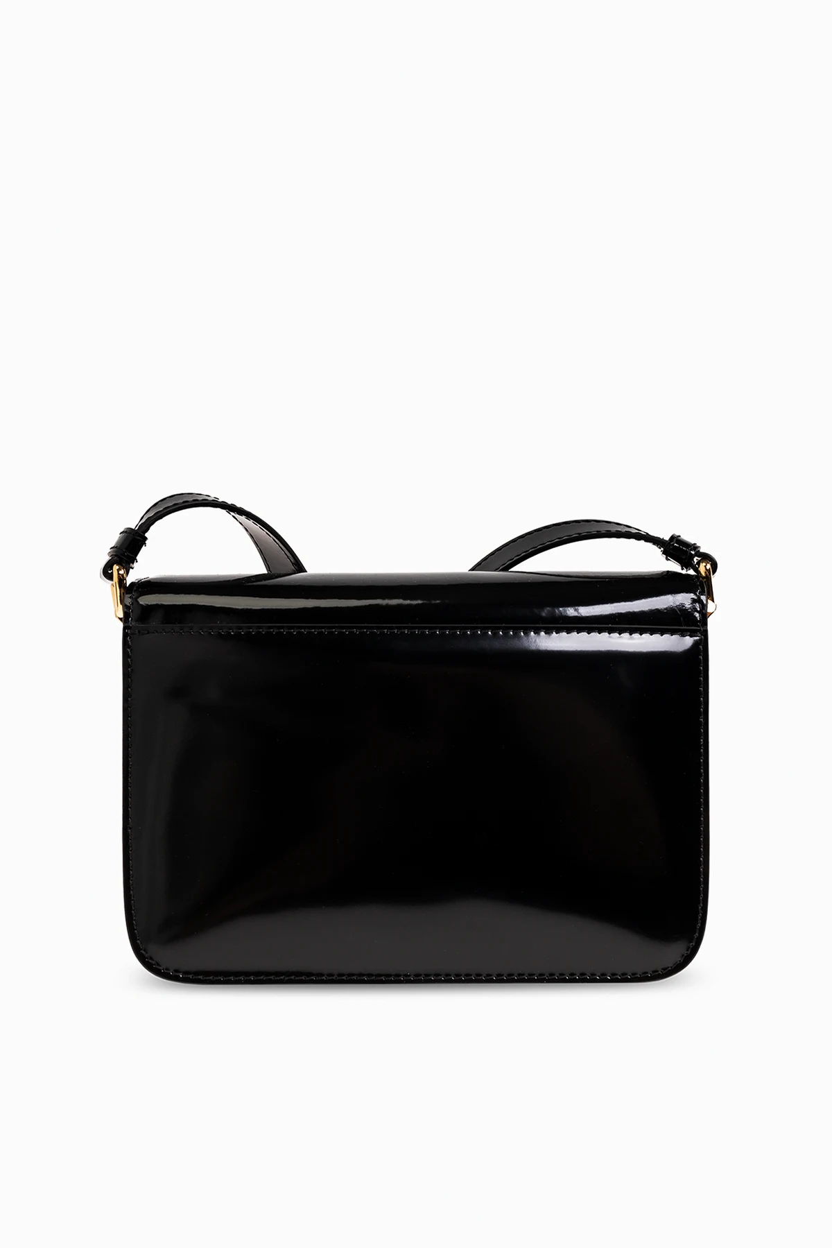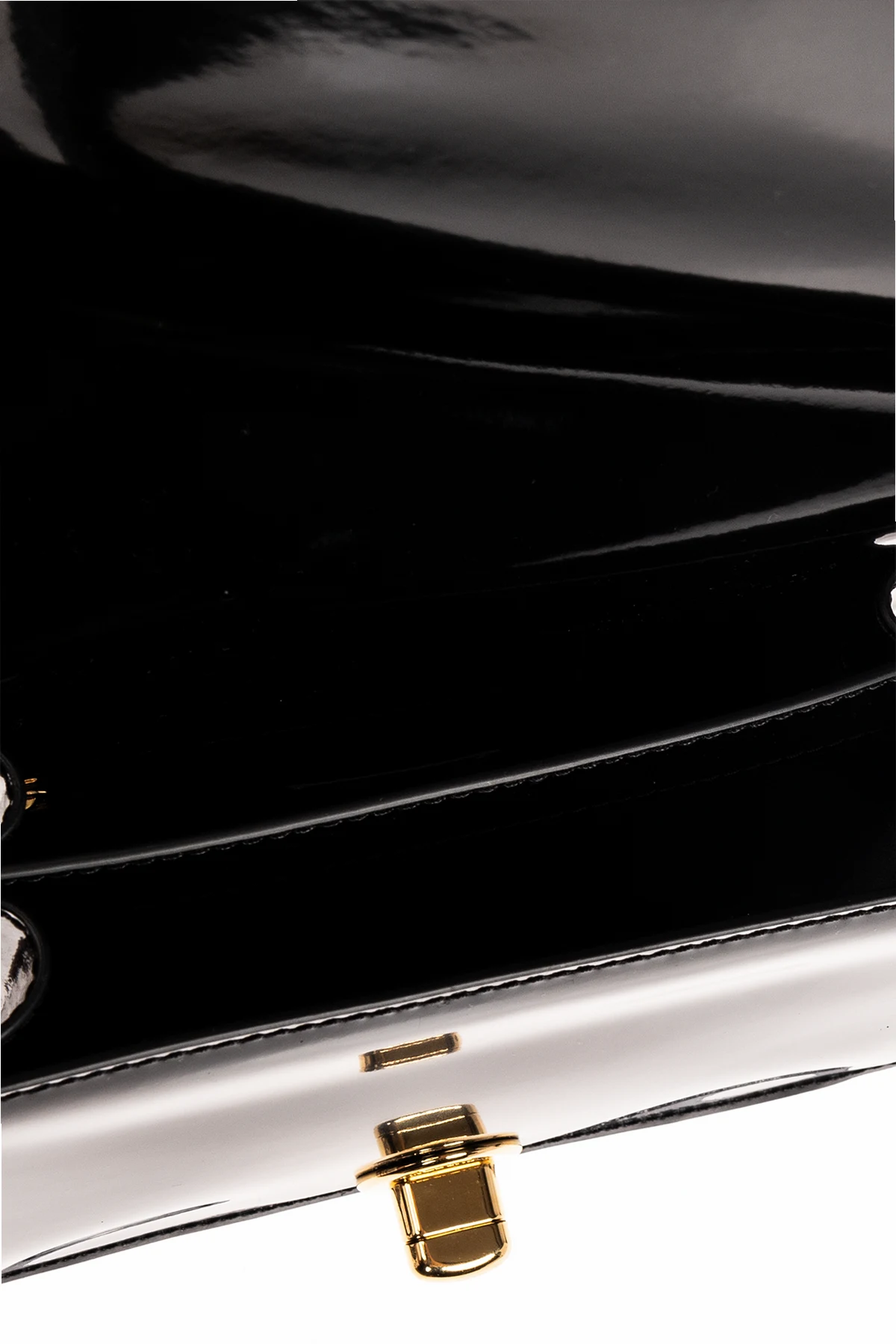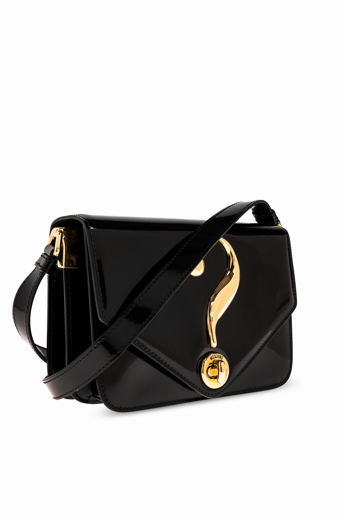 Czarna torba na ramię Moschino. Wykonana z połyskującej skóry. Ozdobiona aplikacją z logo. Regulowany pas na ramię. Wewnątrz dwie komory oraz kieszeń z zamknięciem na zamek. Metalowe wykończenie w kolorze złotym.