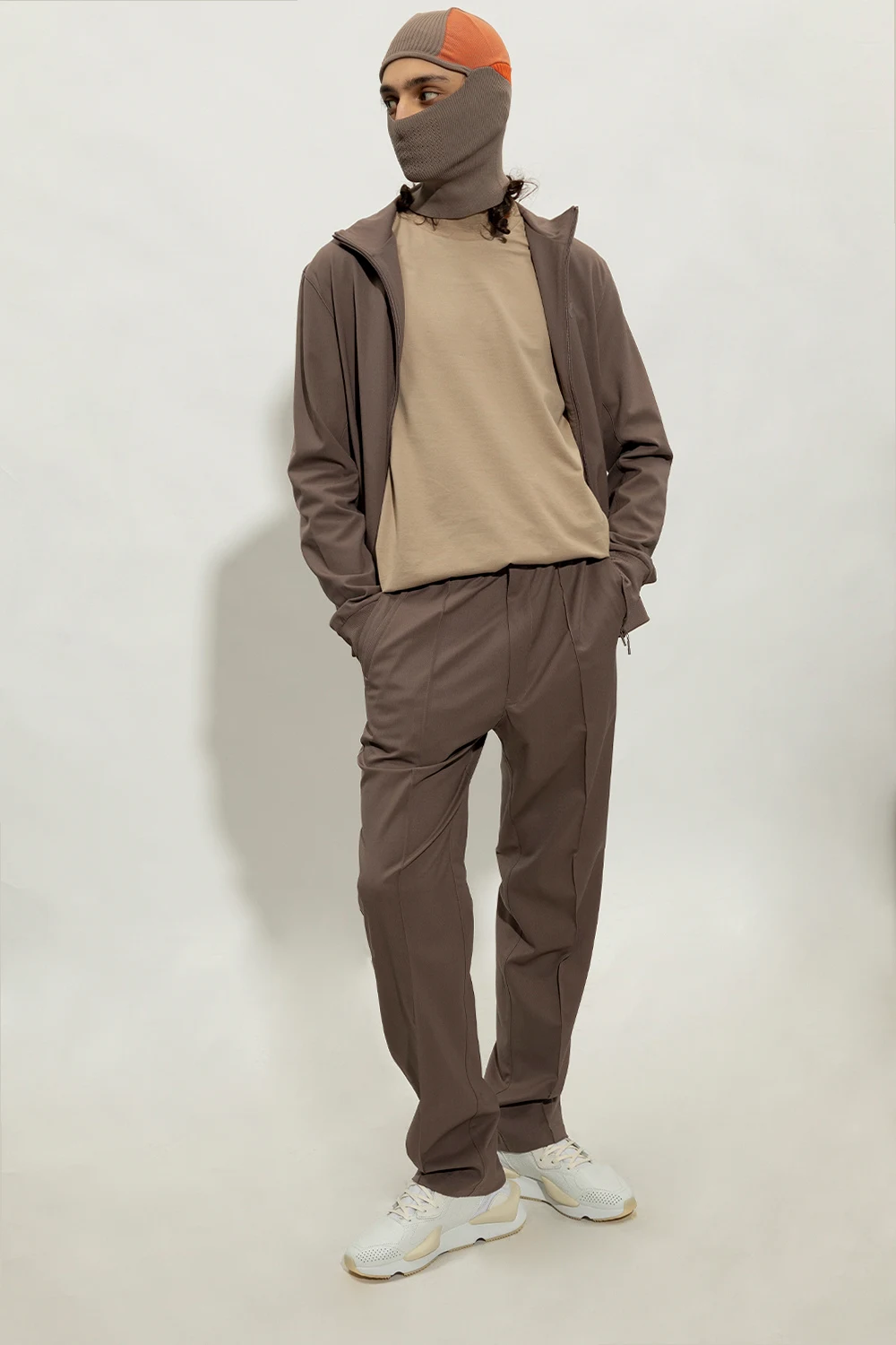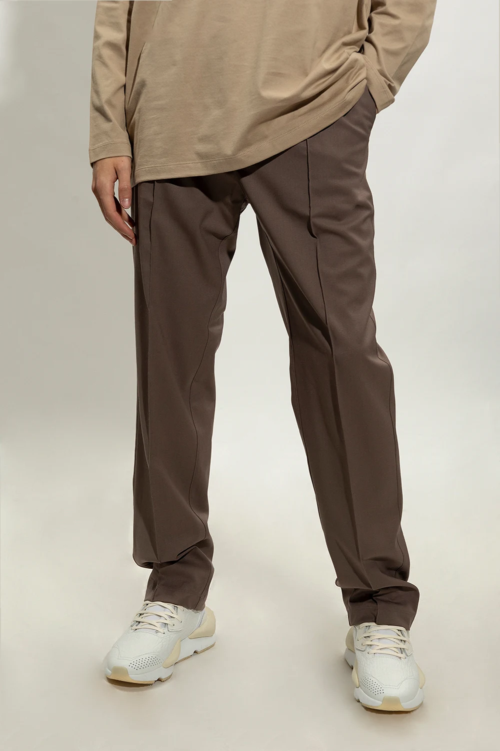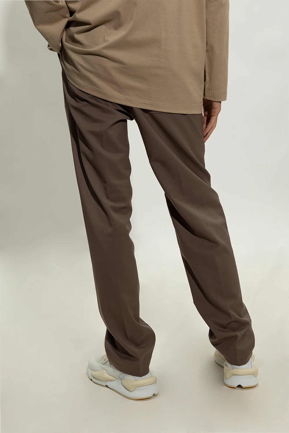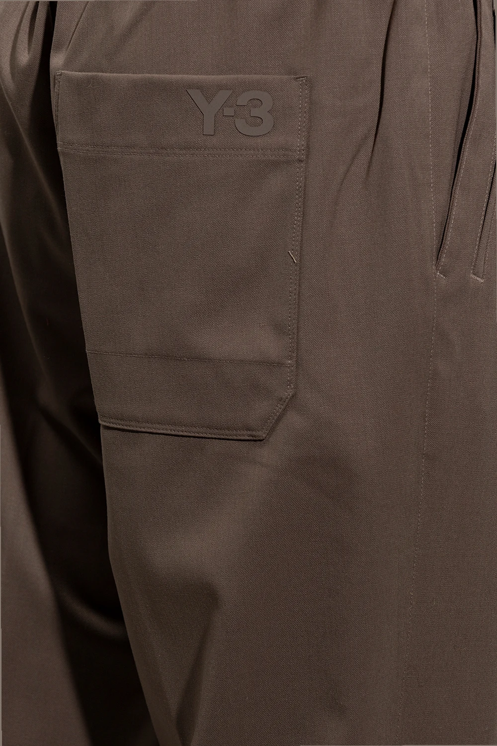 Brązowe spodnie w kant Y-3 Yohji Yamamoto. Wykonane z mieszanki wełny. W pasie wszyta guma ściągana trokami. Zapinane na zamek i guzik. Z tyłu nadrukowane logo. Cztery kieszenie: z przodu dwie wsuwane i zapinana na zamek, z tyłu wsuwana. Długie nogawki, lekko zwężane ku dołowi.