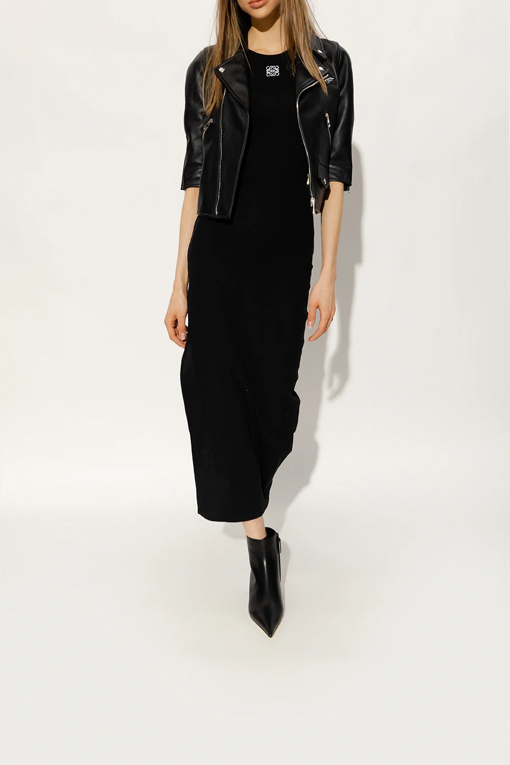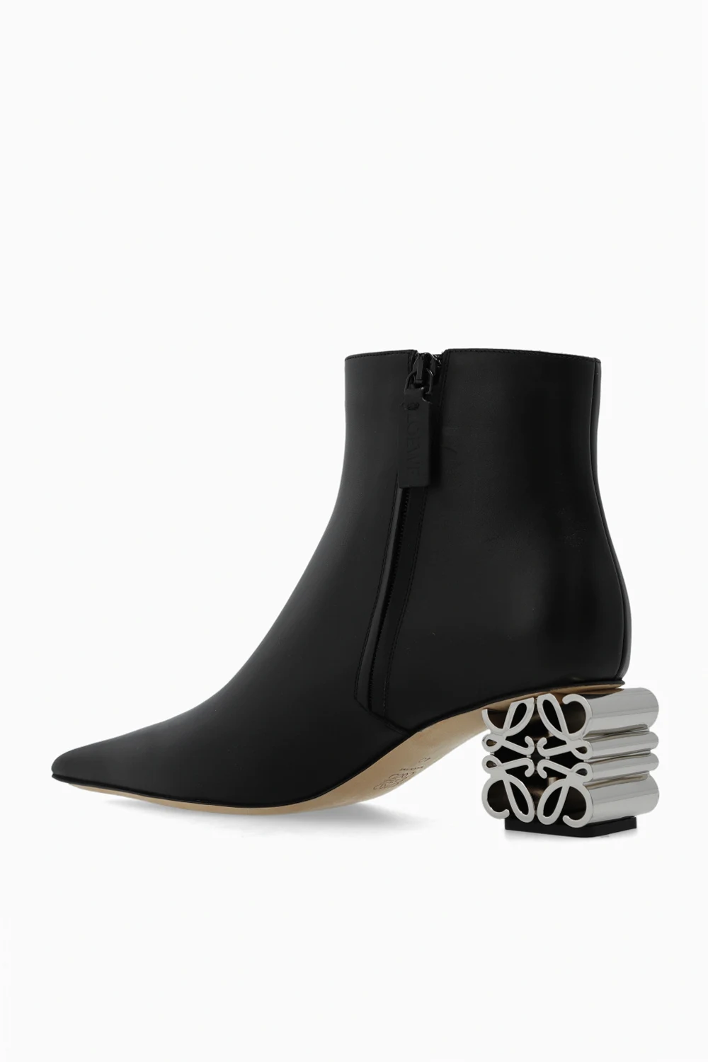 Czarne botki na obcasie, model 'Anagram' Loewe. Wykonane ze skóry cielęcej. Po bokach zapinane na zamek. Wydłużony nosek w szpic. Dekoracyjny obcas w kształcie sześcianu z anagramem w kolorze srebrnym. Beżowa, skórzana podeszwa.