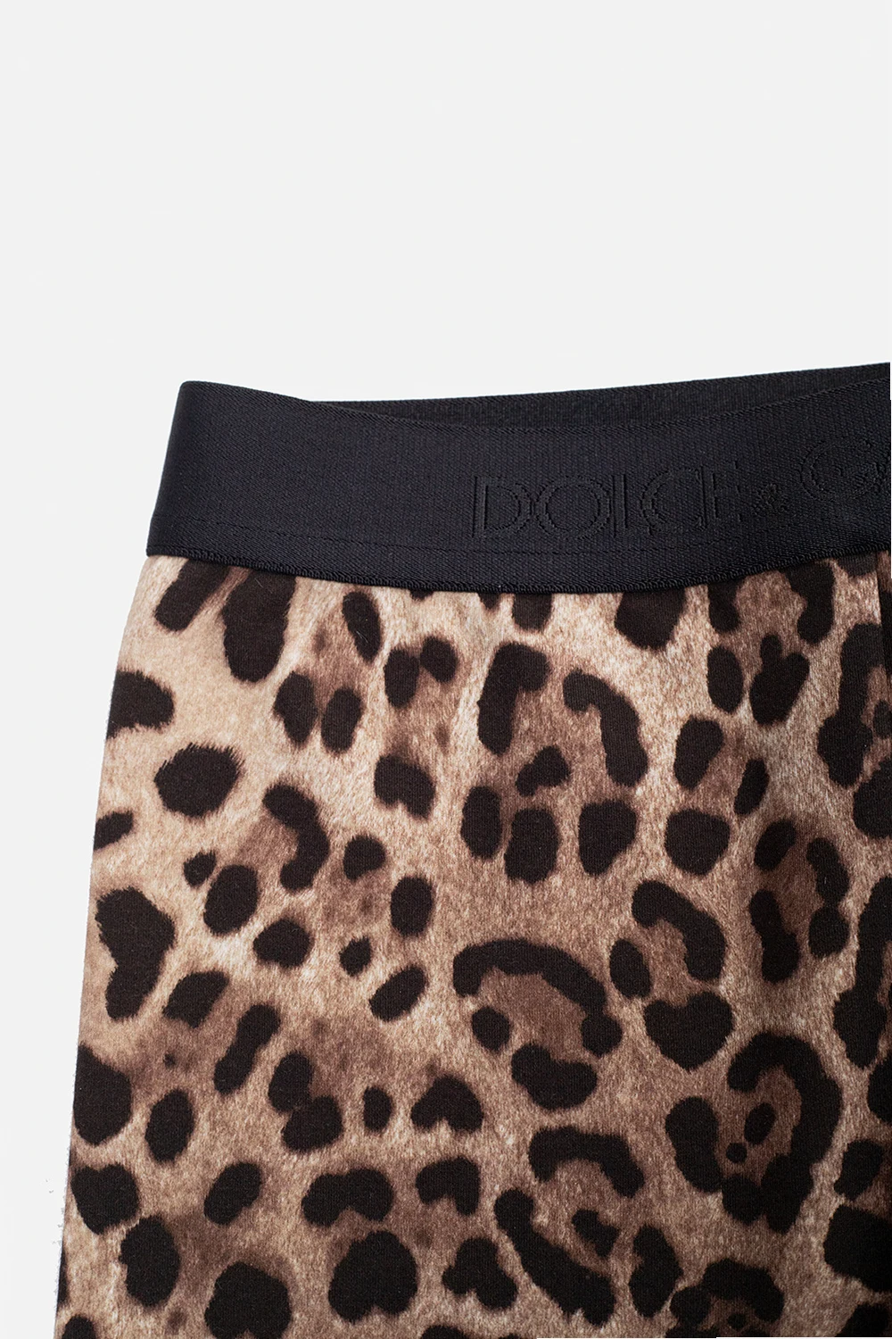 Brązowo-beżowo-czarne, krótkie legginsy Dolce & Gabbana Kids. Wykonane z bawełny. W pasie wszyta czarna guma z logo. Ozdobione wzorem z motywem zwierzęcym.