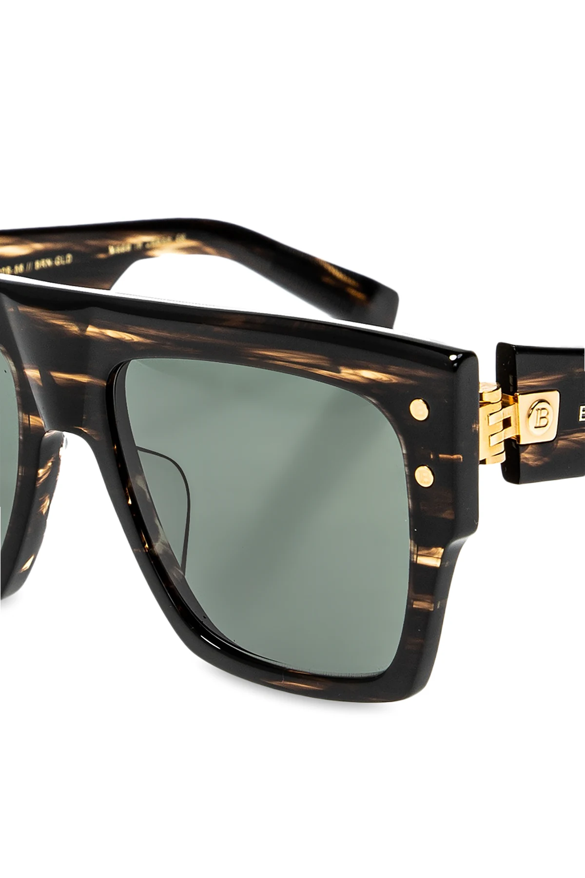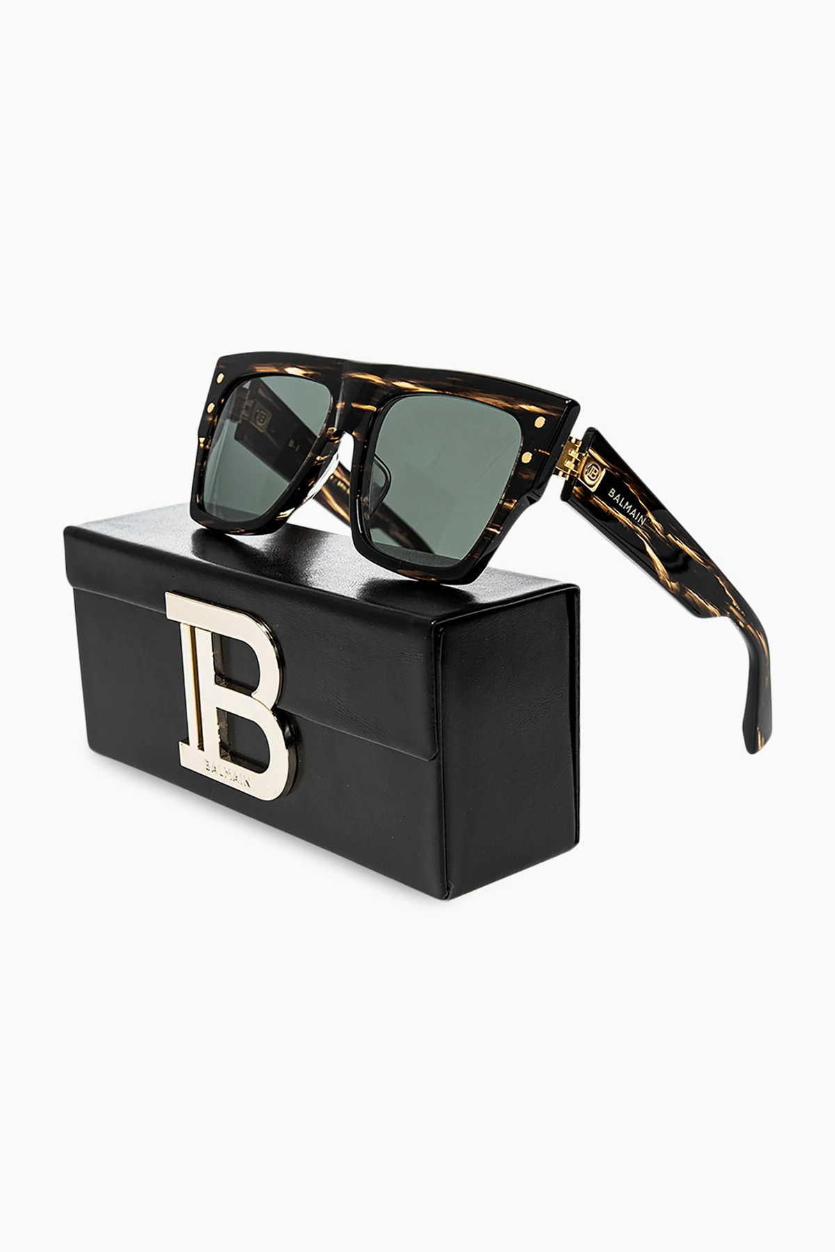 Czarno-brązowe okulary przeciwsłoneczne Balmain. Ozdobione metalową aplikacją z logo w kolorze złotym. Czarne, certyfikowane soczewki UVA/UVB. Dołączone etui.