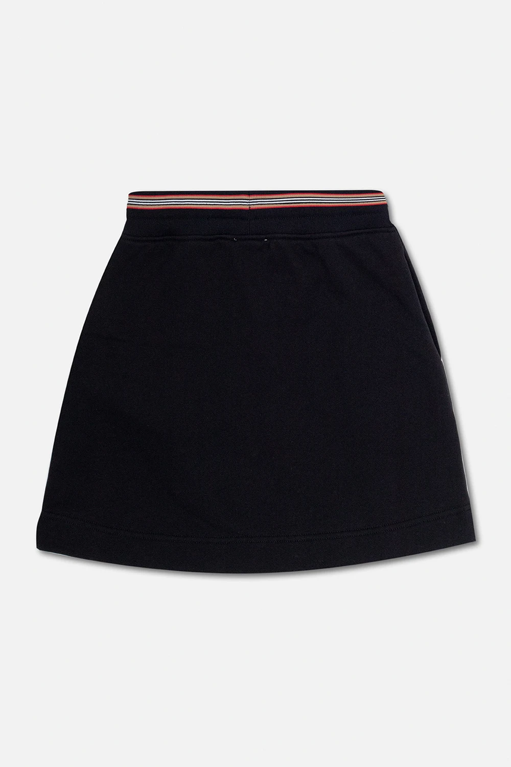 Czarna spódnica, model ‘Lisey’ Burberry Kids. Wykonana z bawełny. W pasie ściągana trokami. Wyszyty pasek w charakterystycznych dla marki kolorach. Nadrukowane logo w kolorze szarym. Dwie wsuwane kieszenie.