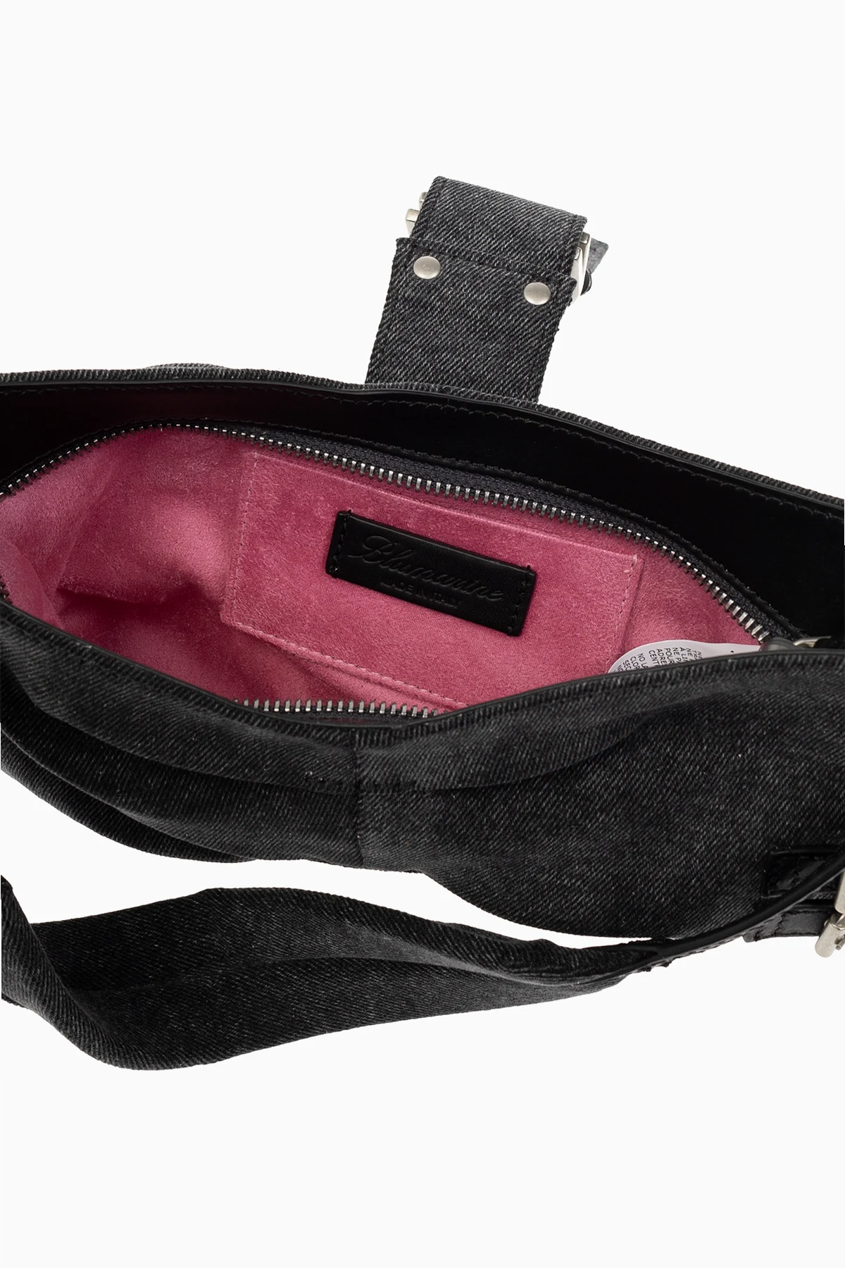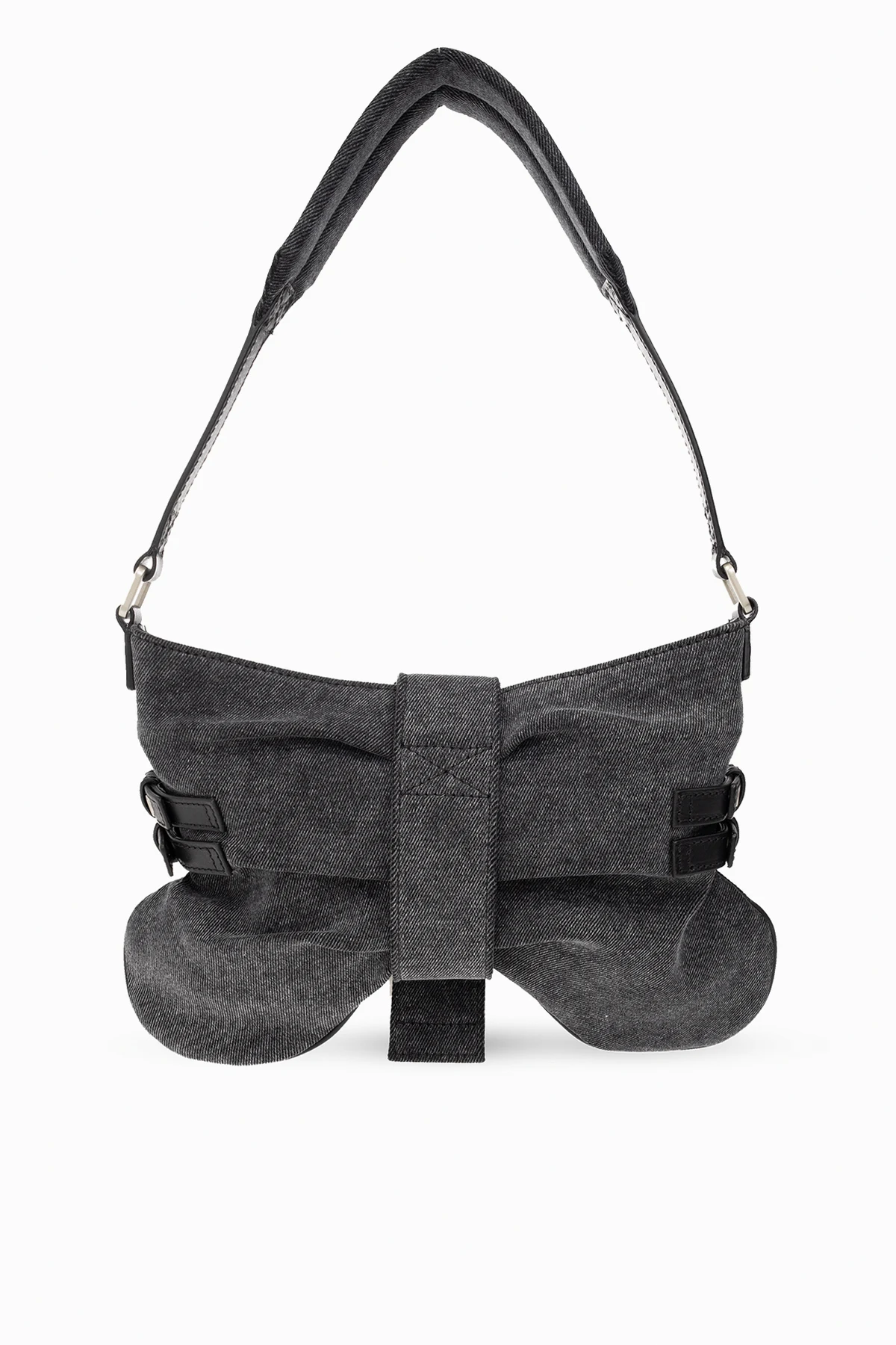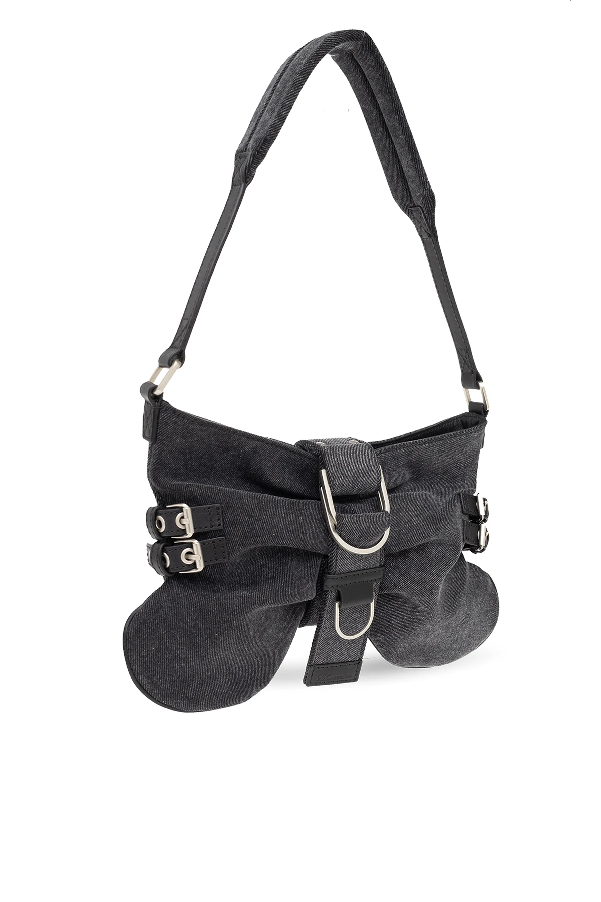 Ciemnoszara torba na ramię, model ‘Butterfly Large’ Blumarine. Wykonana z jeansu i skóry. Zamknięcie na pasek z magnetycznym zatrzaskiem oraz zamek. Po bokach regulowane paski. Ozdobiona dekoracyjnymi marszczeniami i wytłoczonym logo. Pas na ramię. Wewnątrz komora z miejscem na kartę. Metalowe wykończenie w kolorze srebrnym.