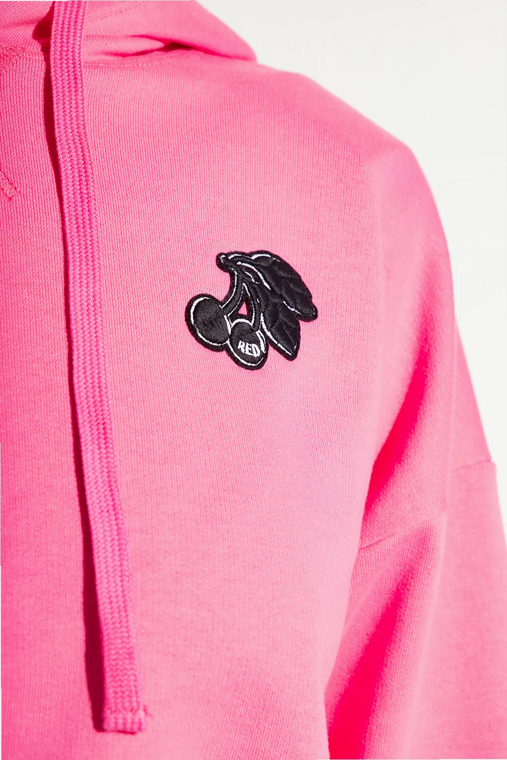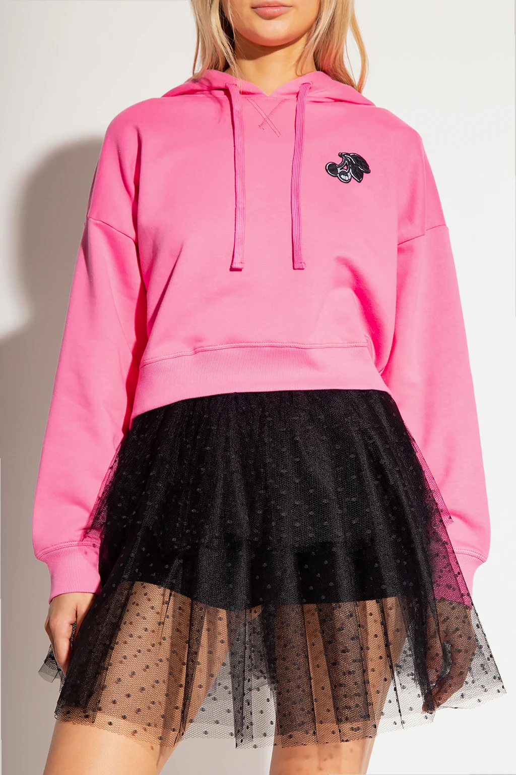 Różowa, krótka bluza o luźnym kroju Red Valentino. Wykonana z bawełny. Kaptur ściągany trokami i wykończony czarnym tiulem z charakterystycznym wzorem ‘Point d’Esprit’. Z przodu czarno-biała naszywka z motywem wiśni. Długie rękawy i dół zakończone ściągaczem.
