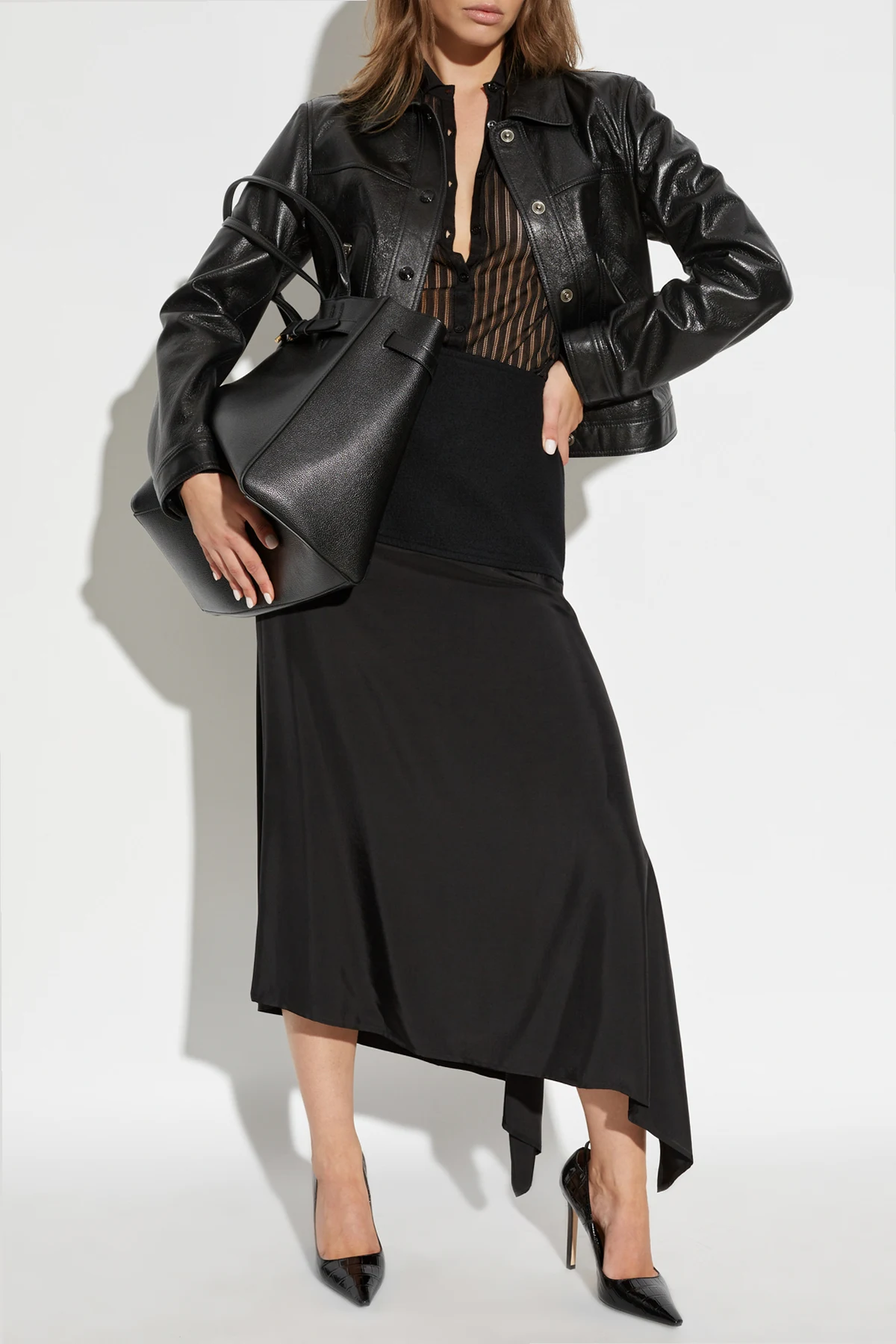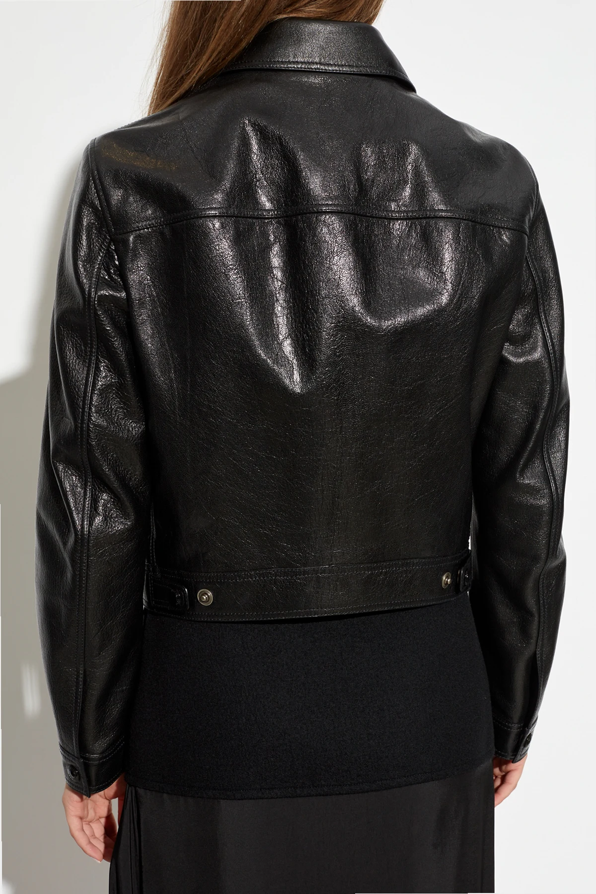 Wykonana z doskonałej czarnej skóry, kurtka ta zachwyca klasycznym, prostym krojem, który subtelnie podkreśla sylwetkę. Standardowy kołnierz oraz zapięcie na czarne guziki dodają jej ponadczasowego charakteru, doskonale harmonizując z resztą kurtki.