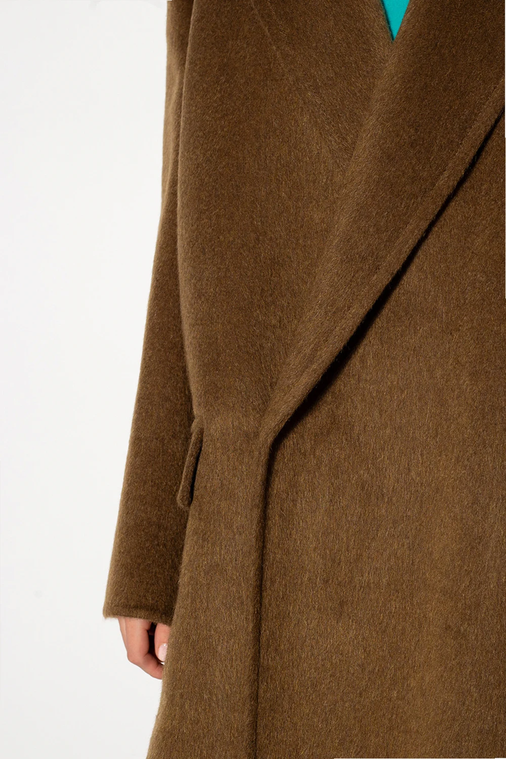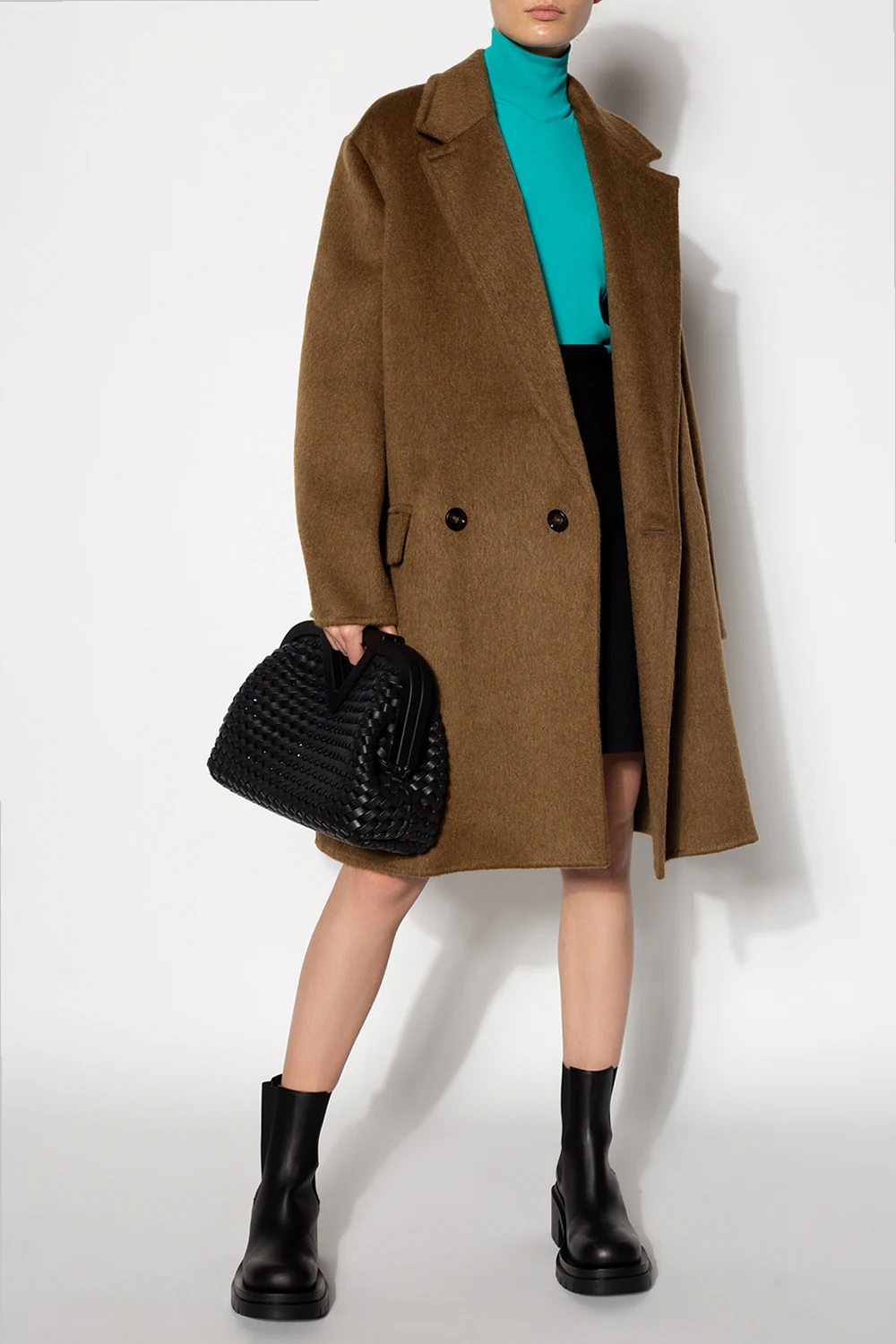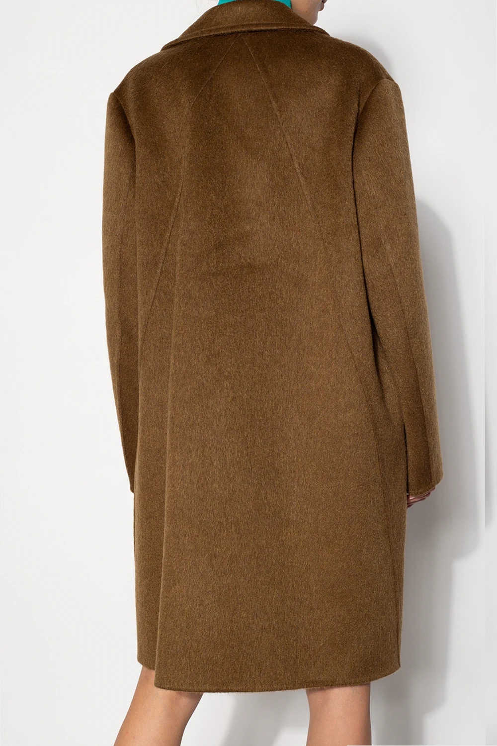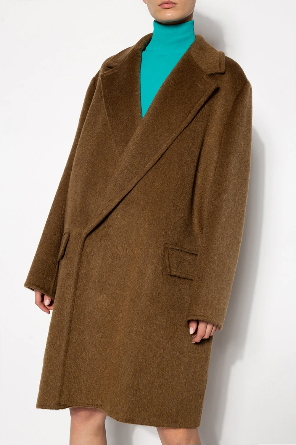 Brązowy, dwurzędowy płaszcz z otwartymi klapami typu ‘oversize’ Bottega Veneta. Zapinany na guziki. Z przodu dwie kieszenie z patką. Długie rękawy.