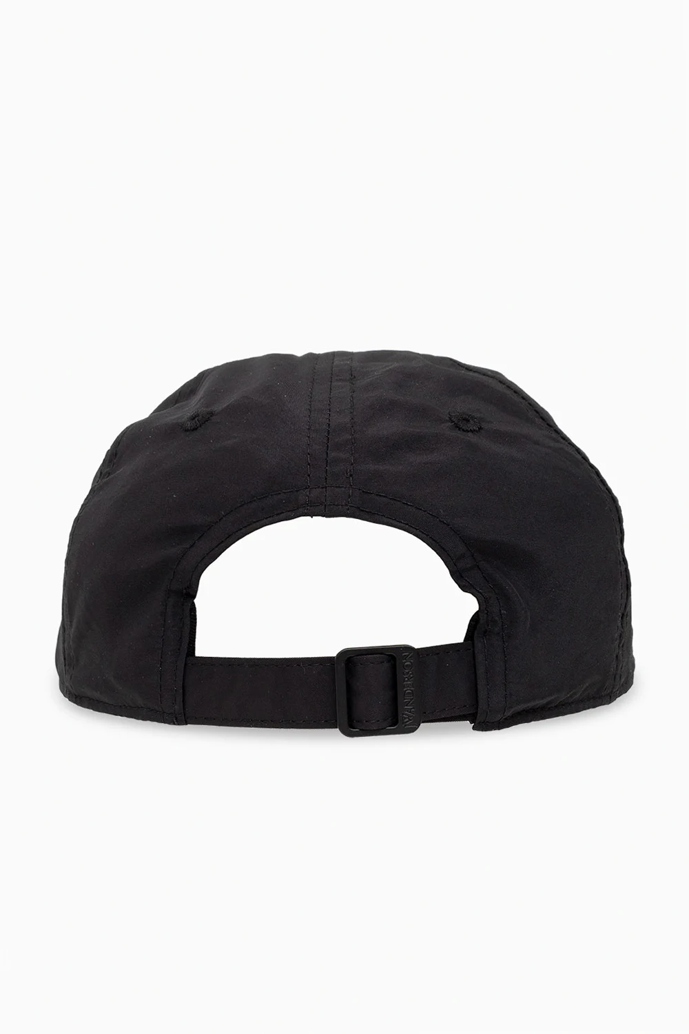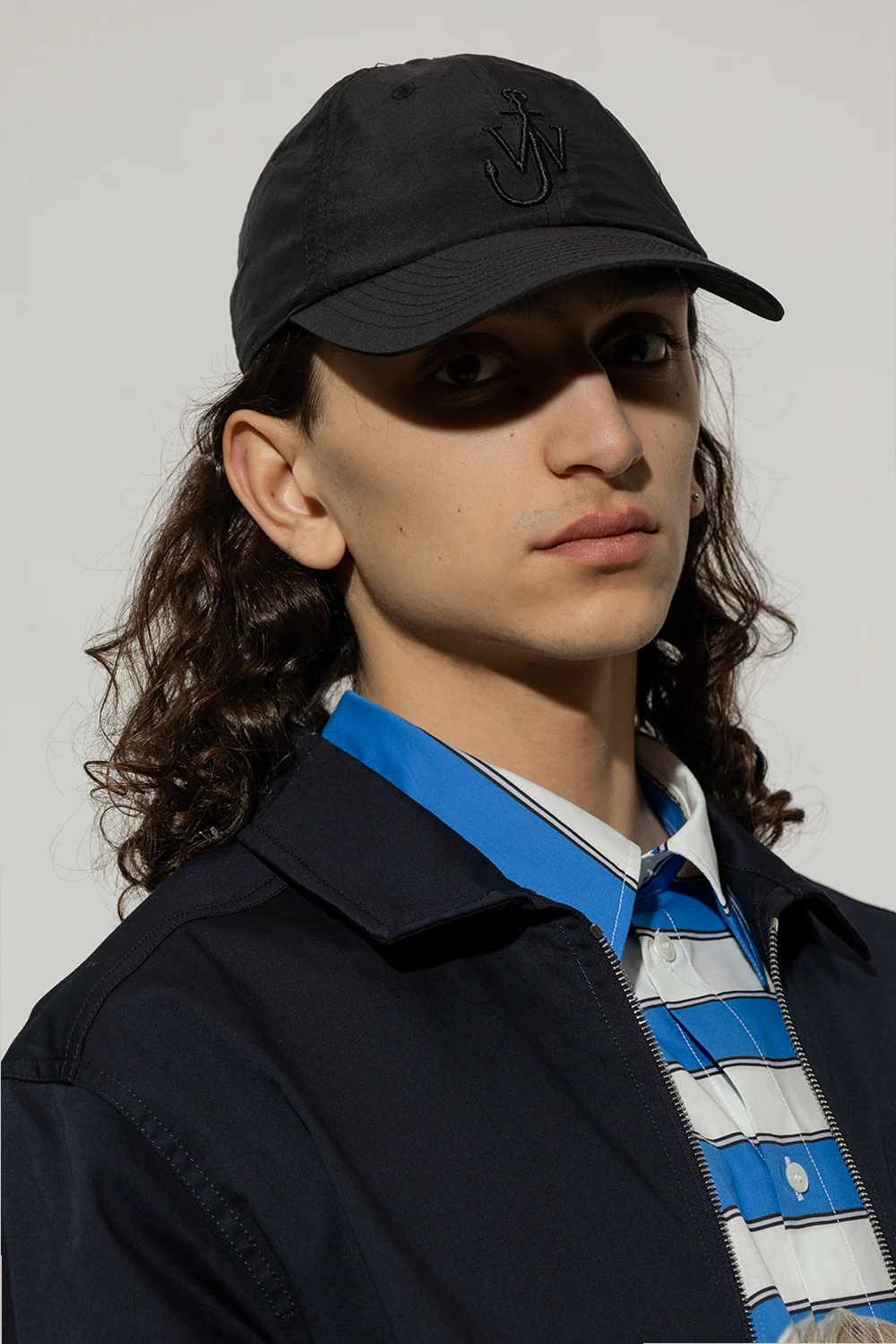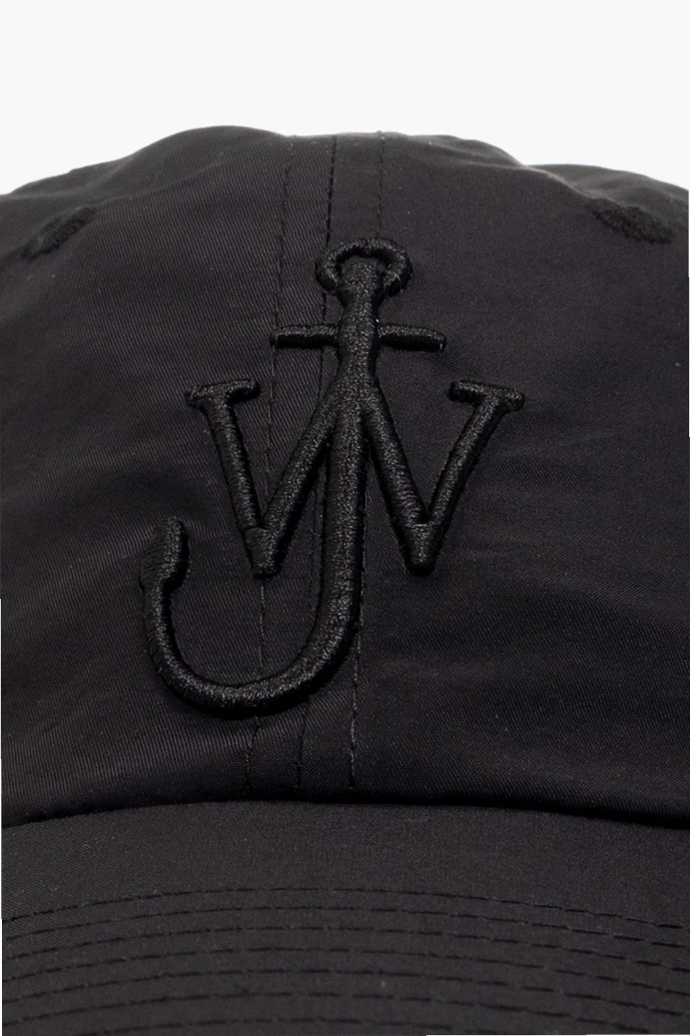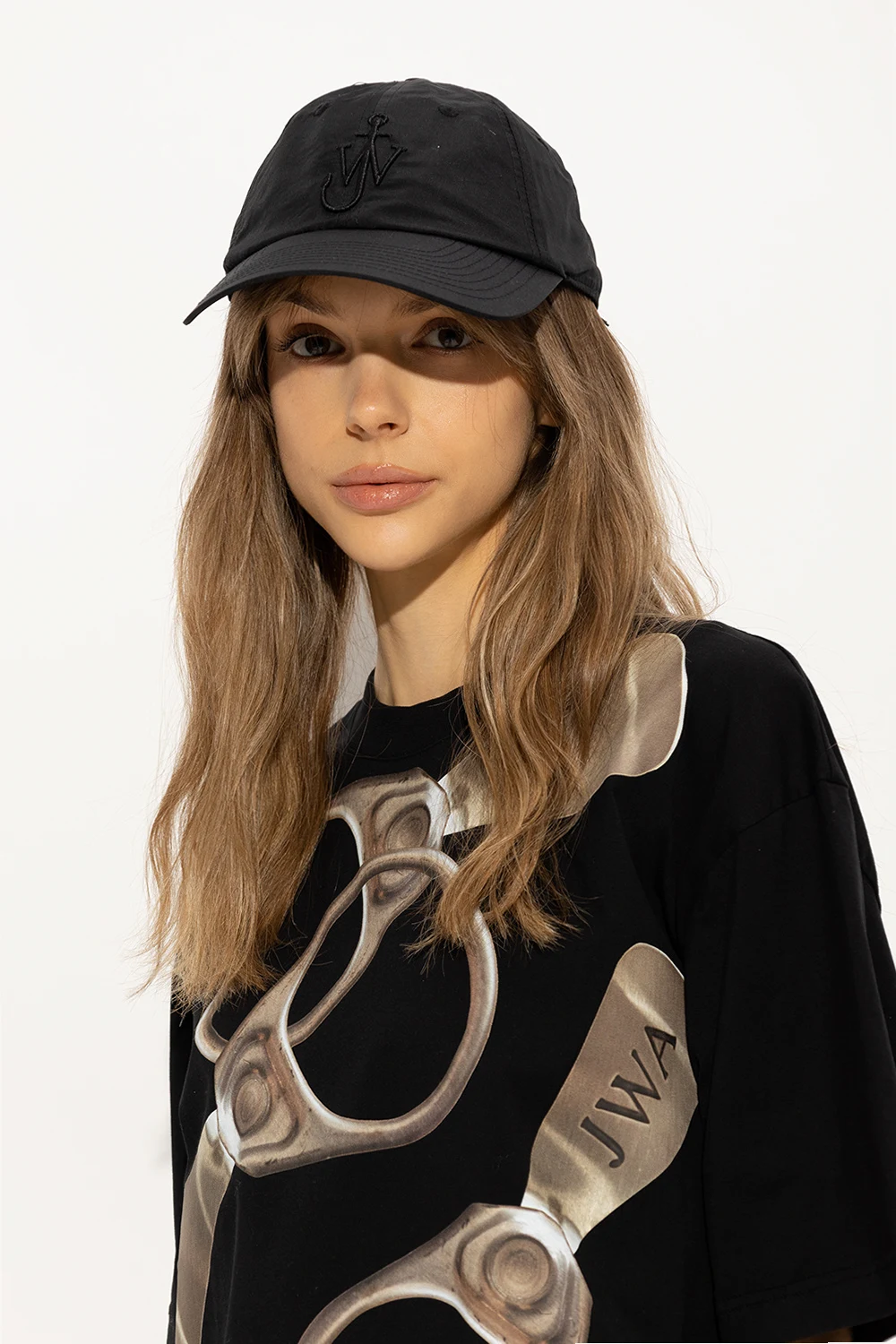 Czarna czapka z daszkiem JW Anderson. Z przodu ozdobiona wyszytym logo. Z tyłu regulowany pasek z klamrą.