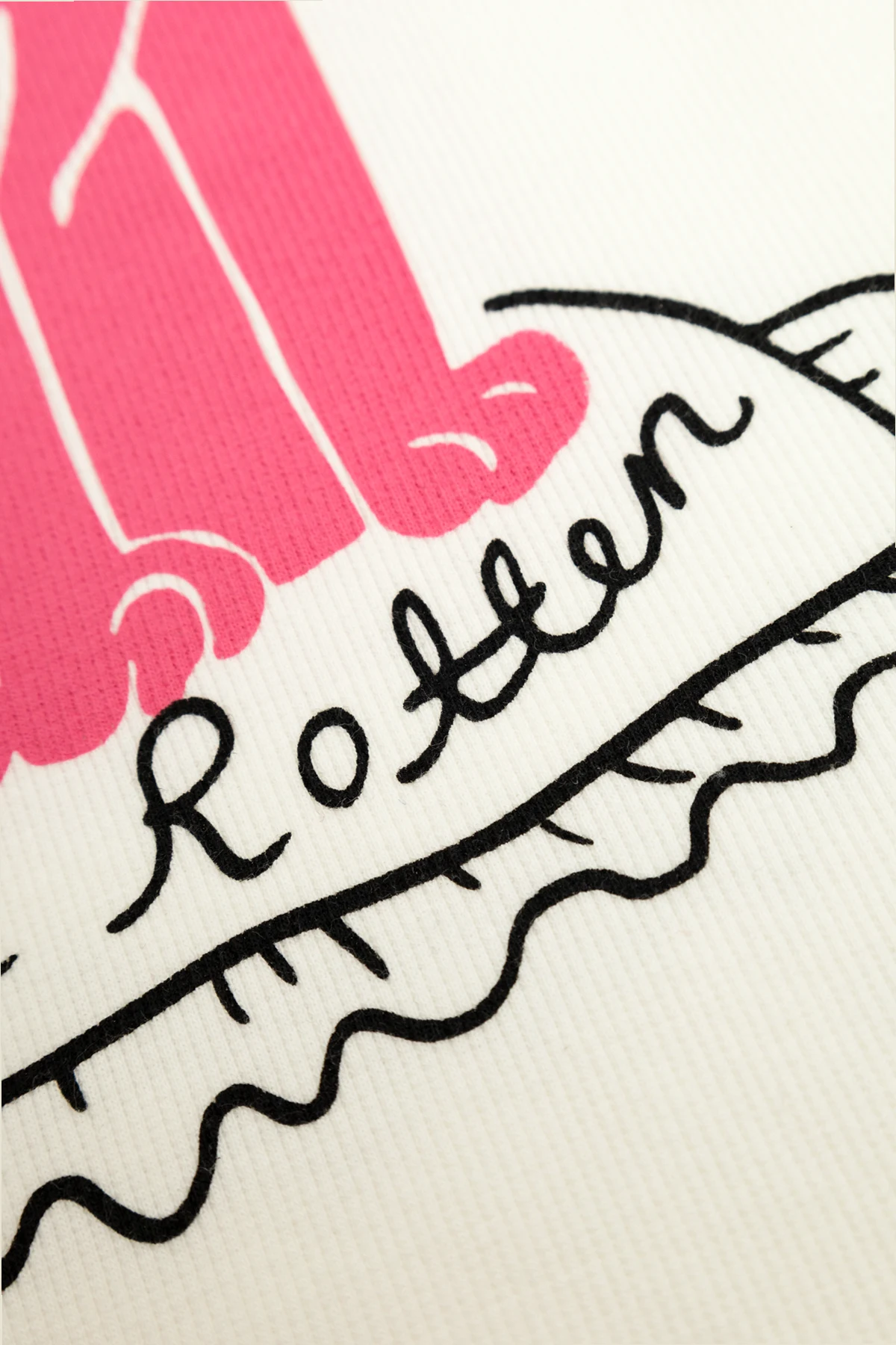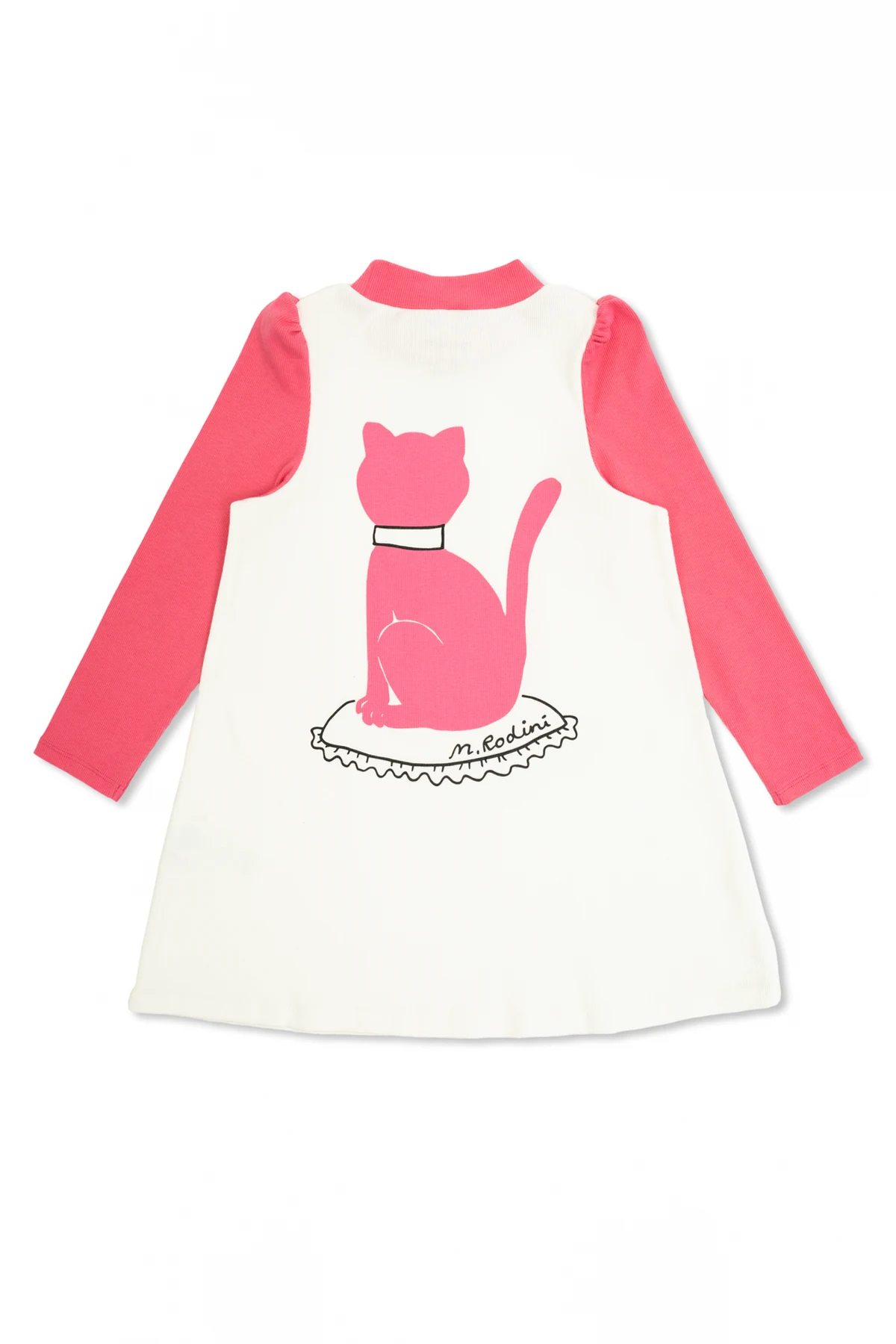 Charakterystyczny nadruk przedstawiający różowego kota z białą obrożą, siedzącego na ozdobnej poduszce z napisem "Special Rotten", nadaje sukience humorystycznego i niepowtarzalnego charakteru. Tył sukienki zdobi nadruk tyłu tego samego kota oraz podpis projektanta "M. Rodini", co dodaje całości spójności.