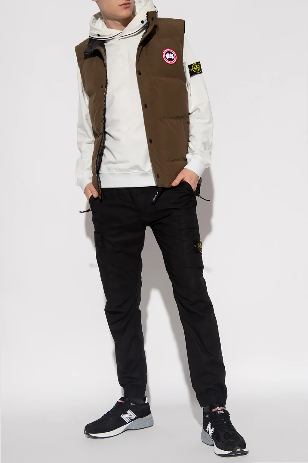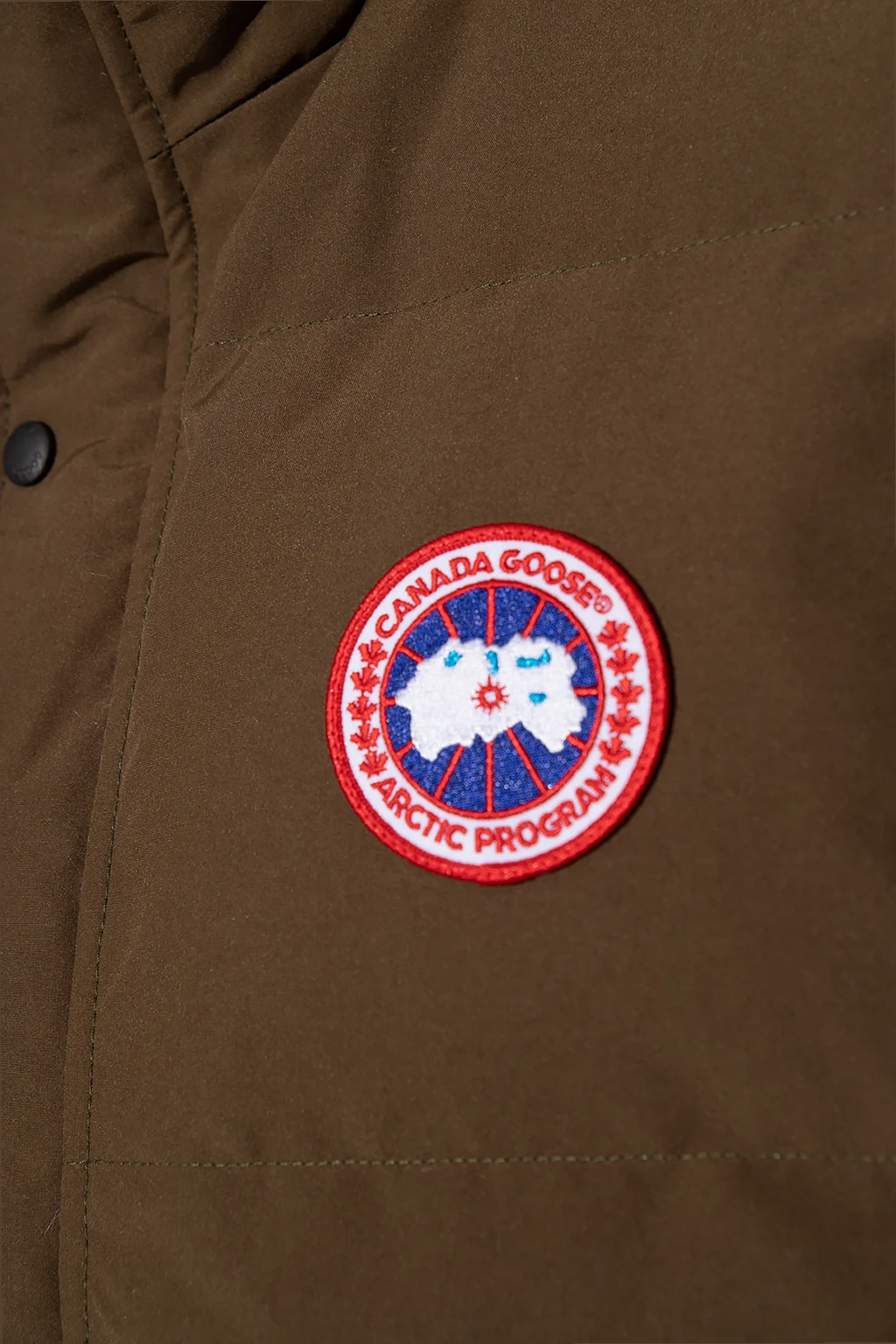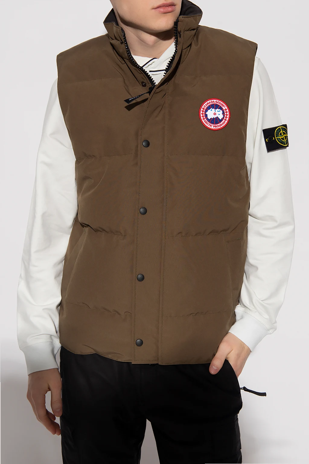 Puchowa kamizelka w kolorze khaki Canada Goose. Zapinana na zatrzaski oraz dwubiegunowy zamek. Z przodu naszywka z logo w kolorze biało-czerwono-granatowym. Dwie wsuwane kieszenie. Dół zakończony ściągaczem. Zakres temperatur 5°C do -5°C.