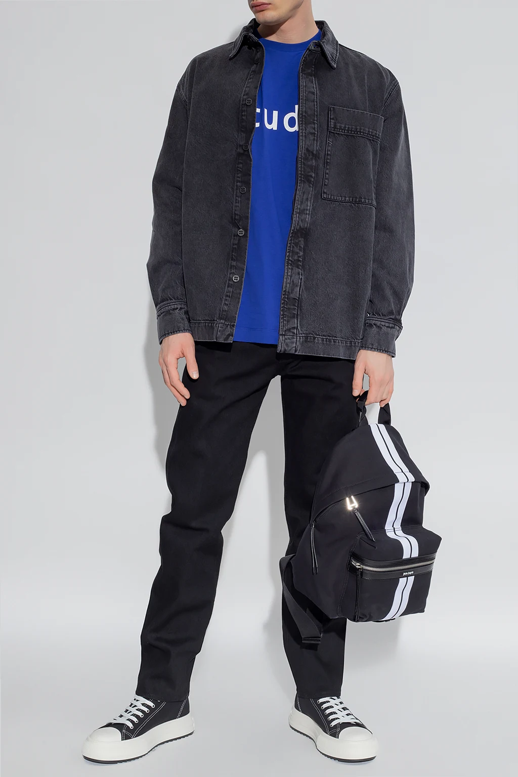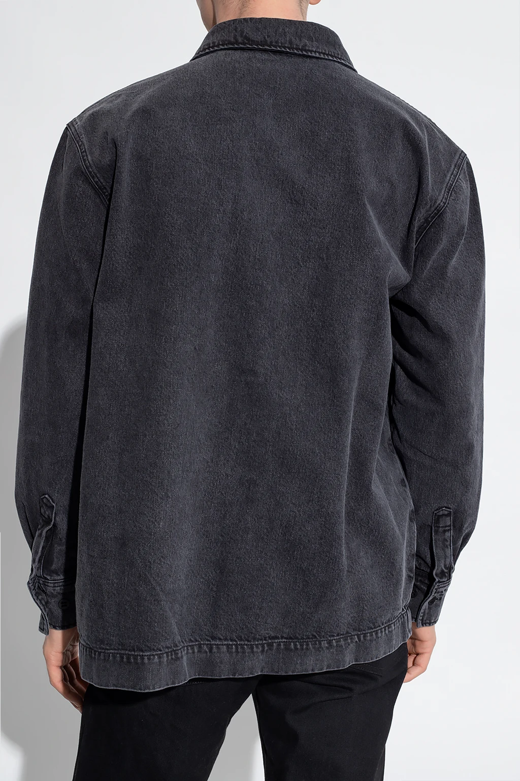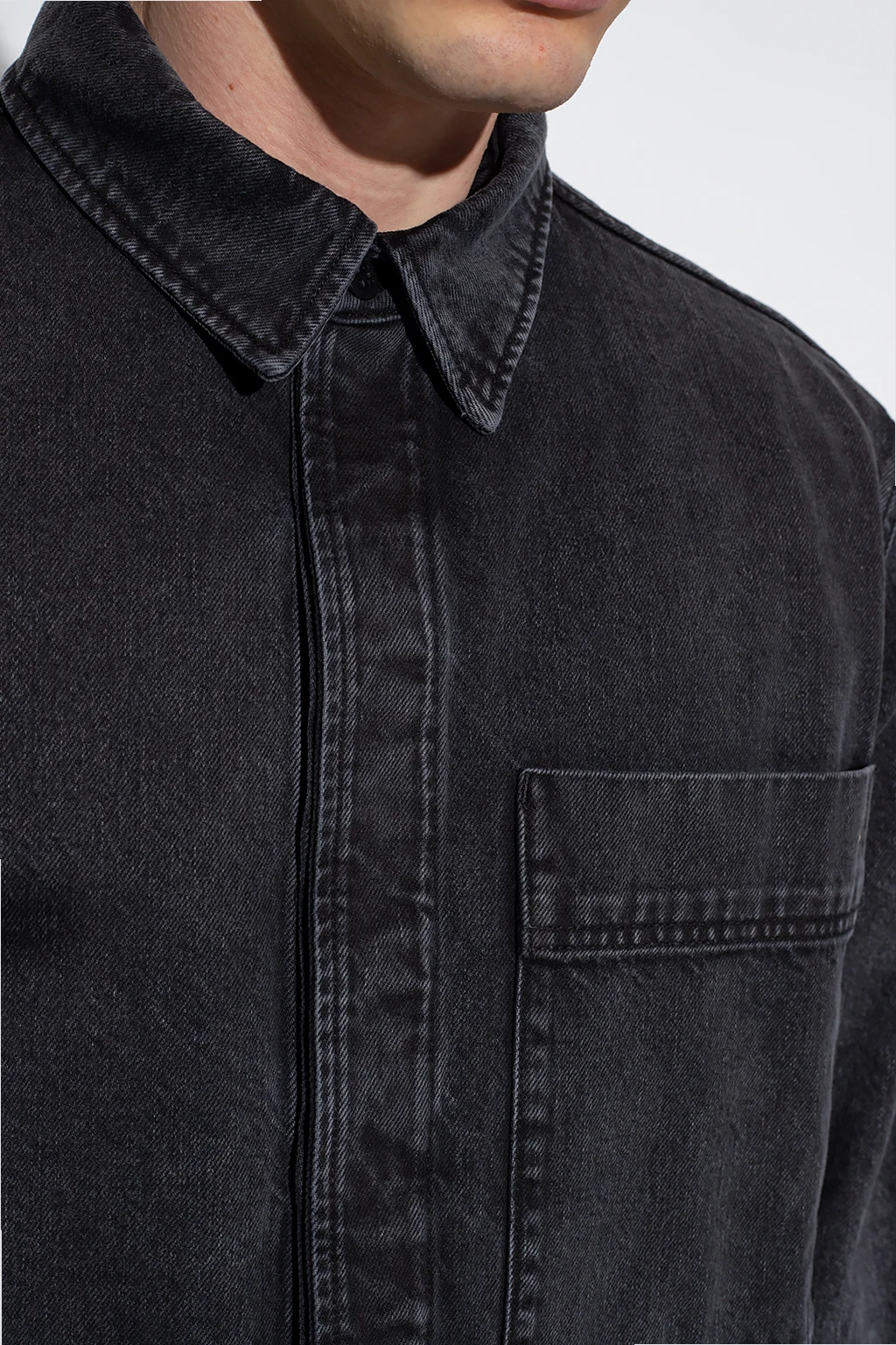 Ciemnoszara, jeansowa koszula Etudes. Wykonana z bawełny organicznej. Zapinana na guziki kryte plisą. Z przodu wsuwana kieszeń. Długie rękawy zakończone mankietem zapinanym na guziki.