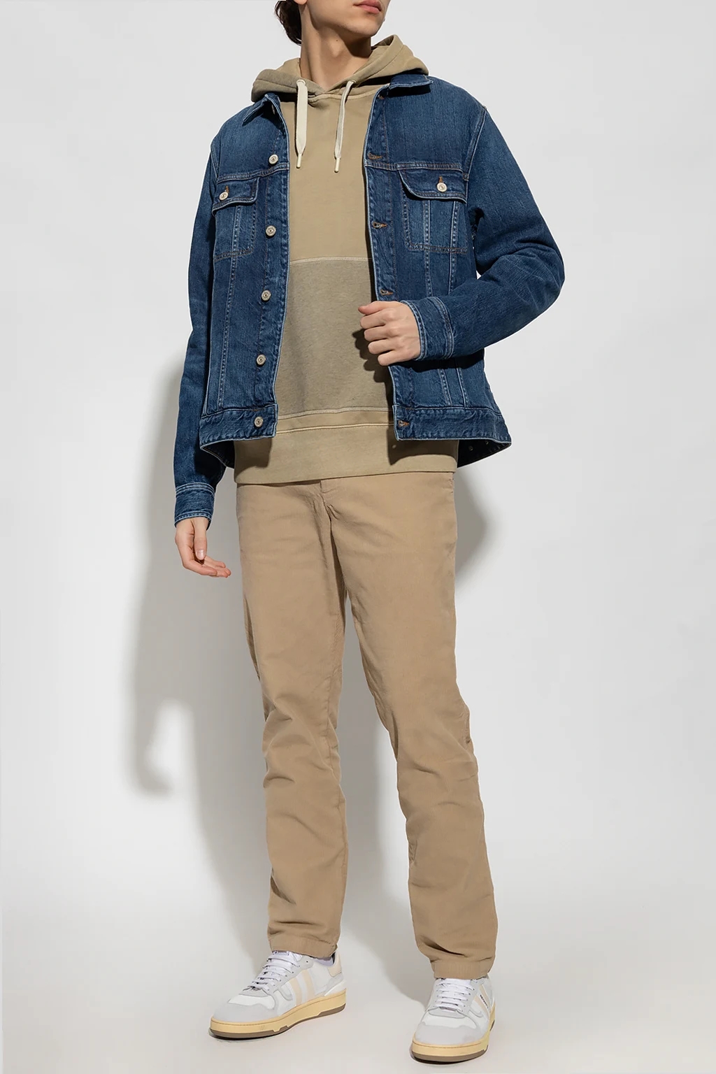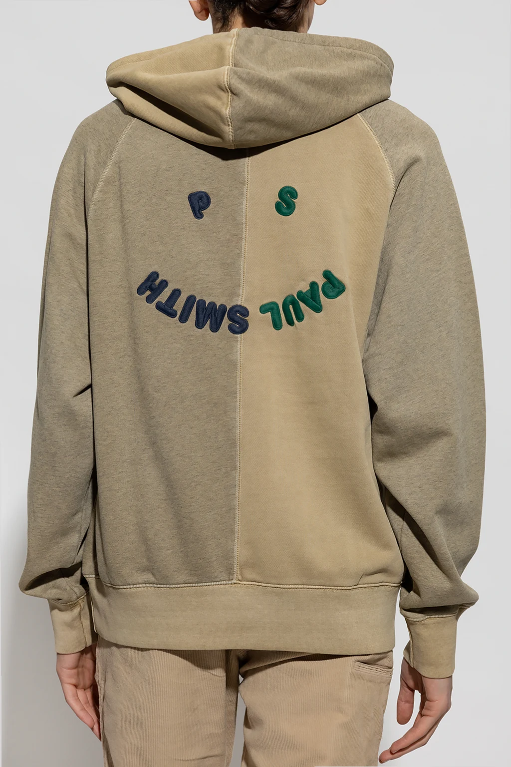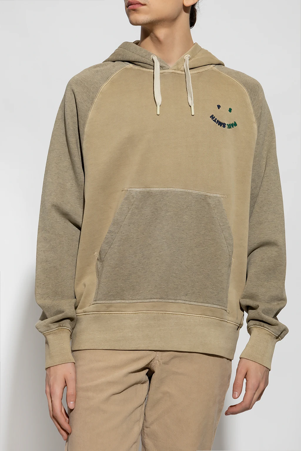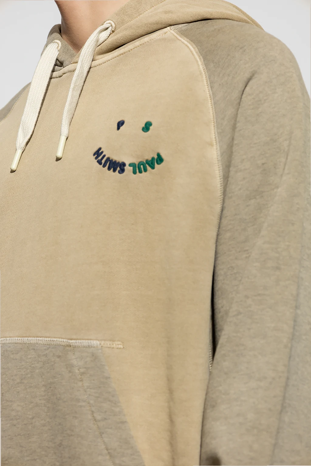 Jasnobrązowa bluza PS Paul Smith. Wykonana z bawełny organicznej. Ozdobiona naszywką z logo w kolorze zielono-granatowym. Kaptur ściągany trokami. Z przodu wsuwana kieszeń. Długie rękawy i dół wykończone ściągaczem.